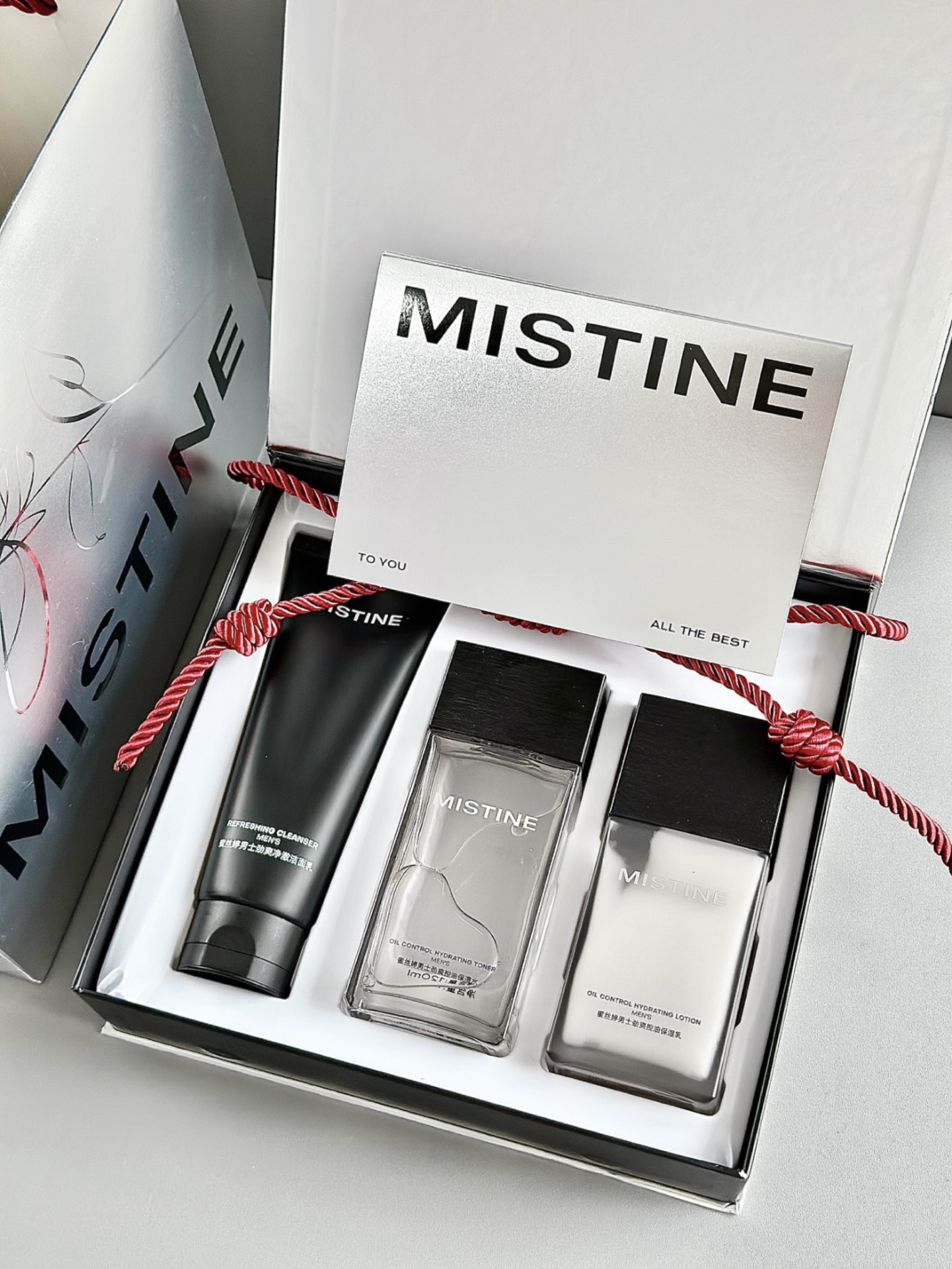 就是这个mistine男士护肤礼盒啦 洁面水乳三件套 满足了日常护肤所需 洁面的清洁力也在线 男友说洗完脸蛋子很清爽~ 水乳的质地很轻盈 上脸吸收也蛮快的! 平时护肤用这一套就够啦 很有仪式感的红绳礼盒包装 送男友不会出错~
