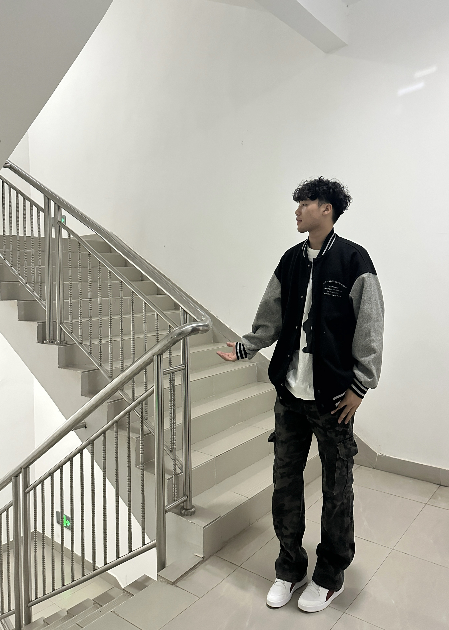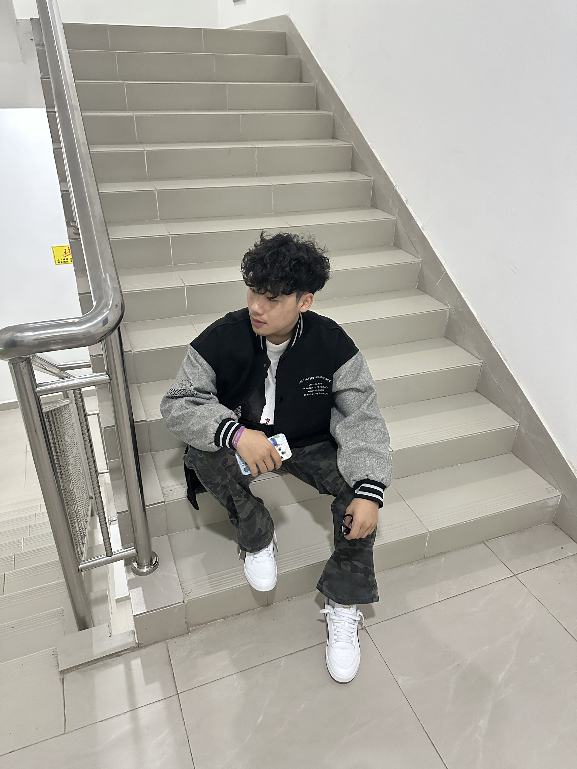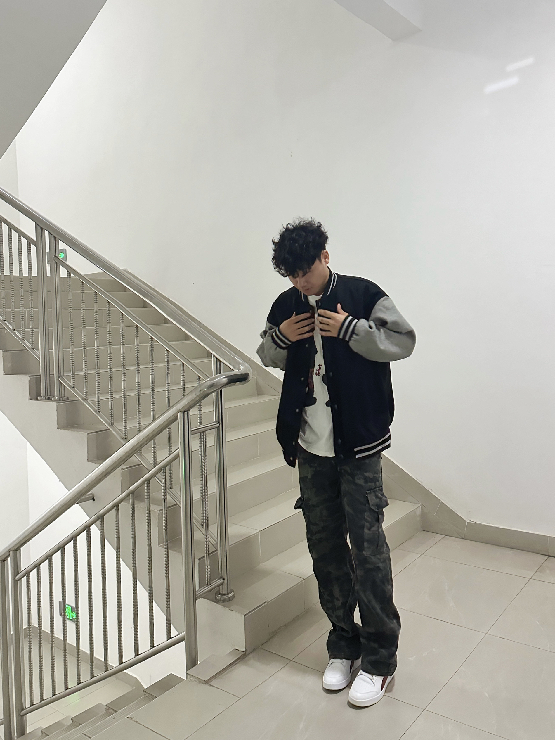 “随便往楼梯间一站,复古棒球服和迷彩裤就把高级感拉满了~不用刻意凹造型,这种松弛又潮酷的风格,主打一个自在随性的帅!