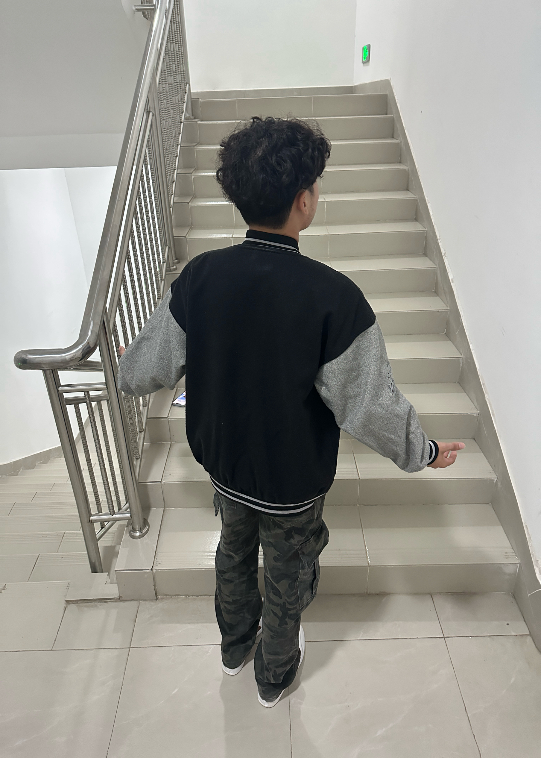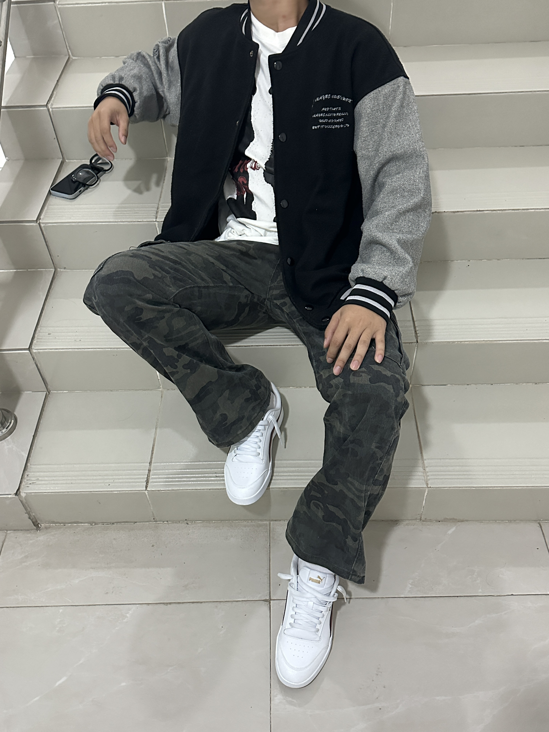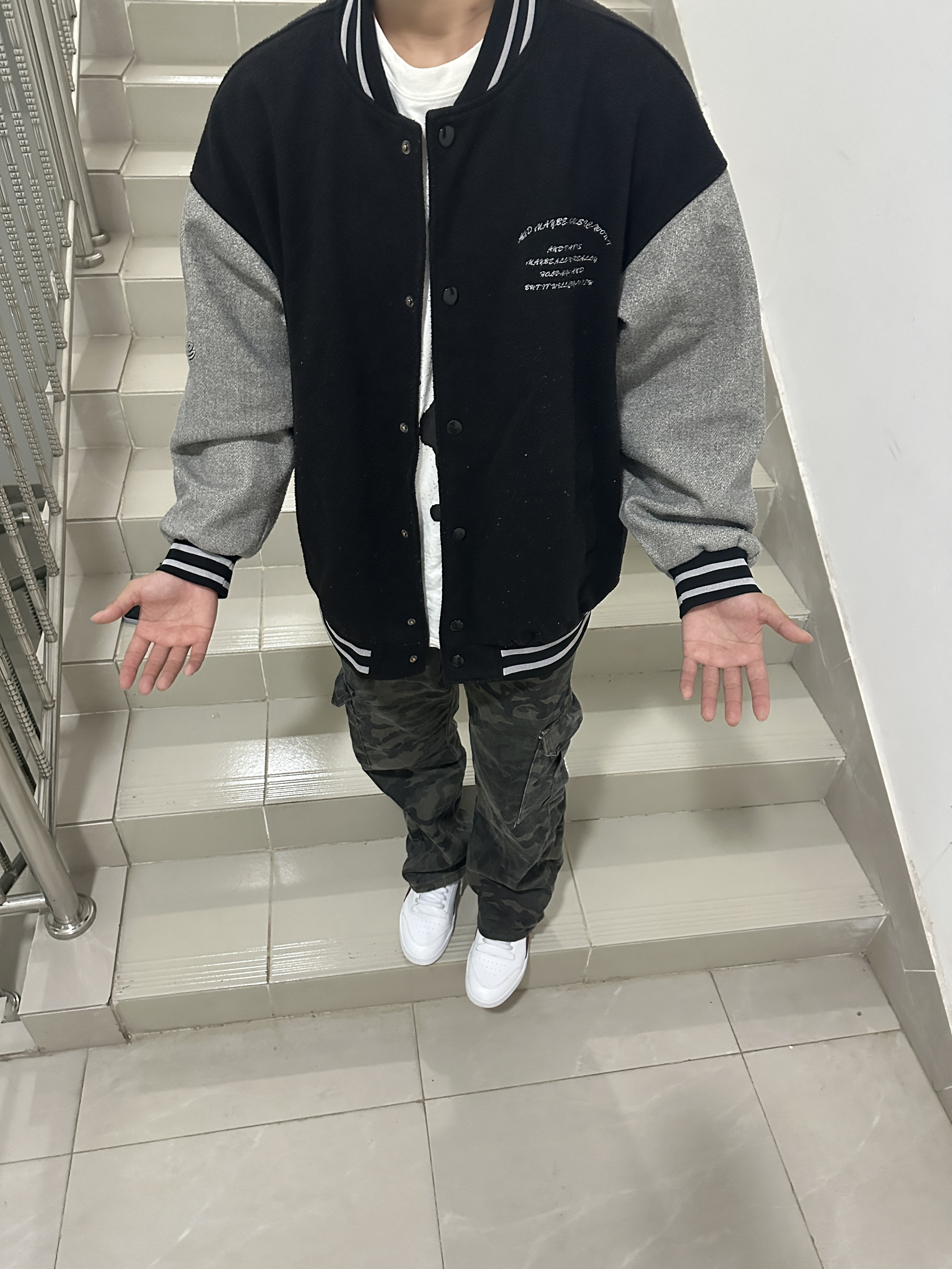 “随便往楼梯间一站,复古棒球服和迷彩裤就把高级感拉满了~不用刻意凹造型,这种松弛又潮酷的风格,主打一个自在随性的帅!