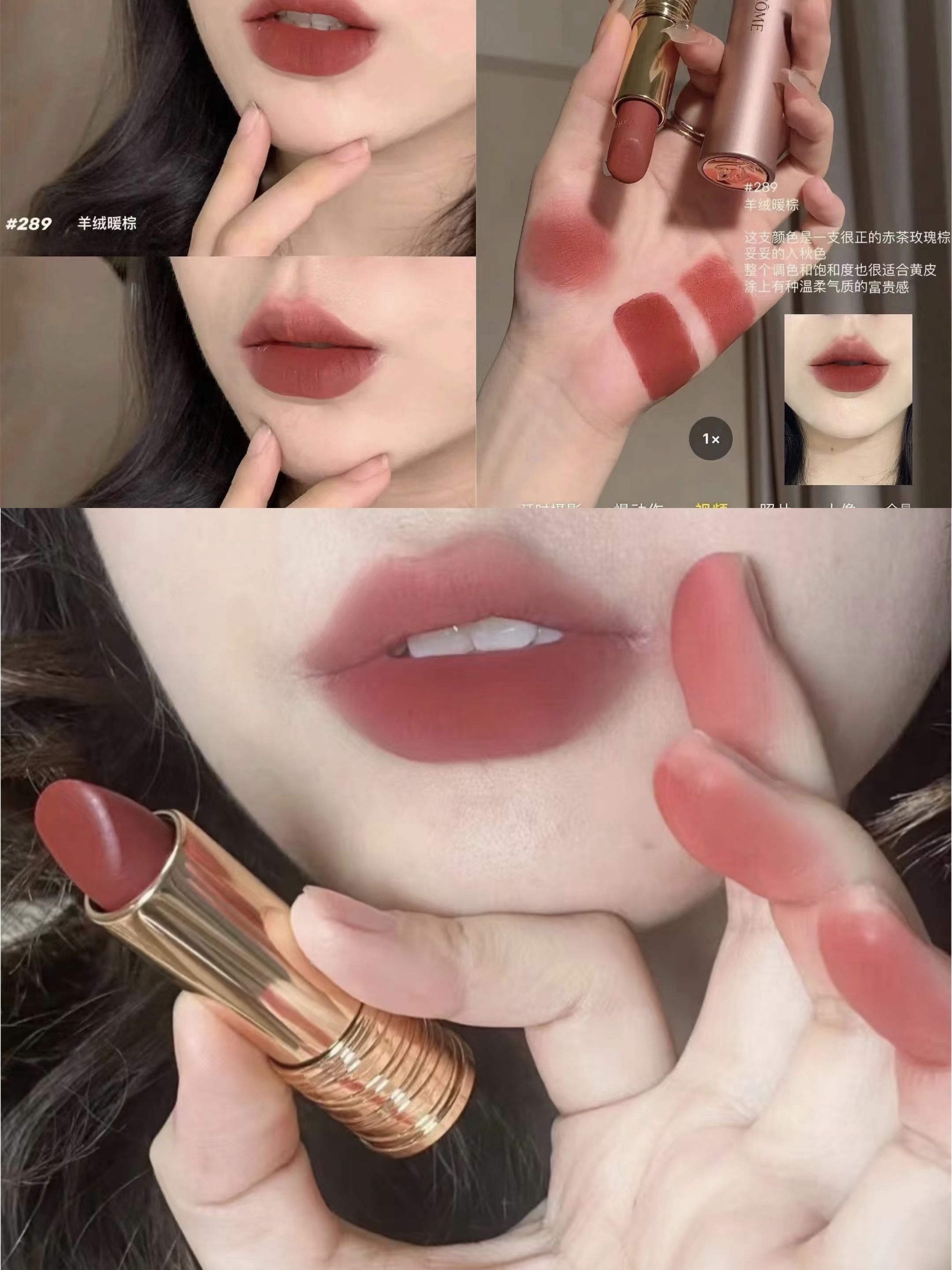 兰蔻粉金小蛮腰口红289# 带一点点橘调的红棕真的好显白啊, 高级羊绒质地加上低饱和度的调色, 显白完全不在话下,女神的慵懒感, 有这支289#就够啦~