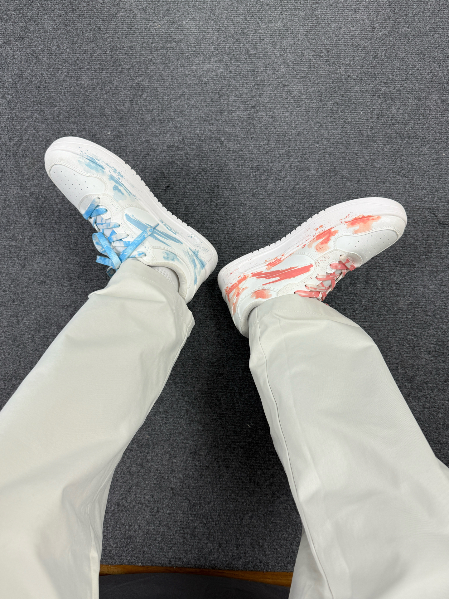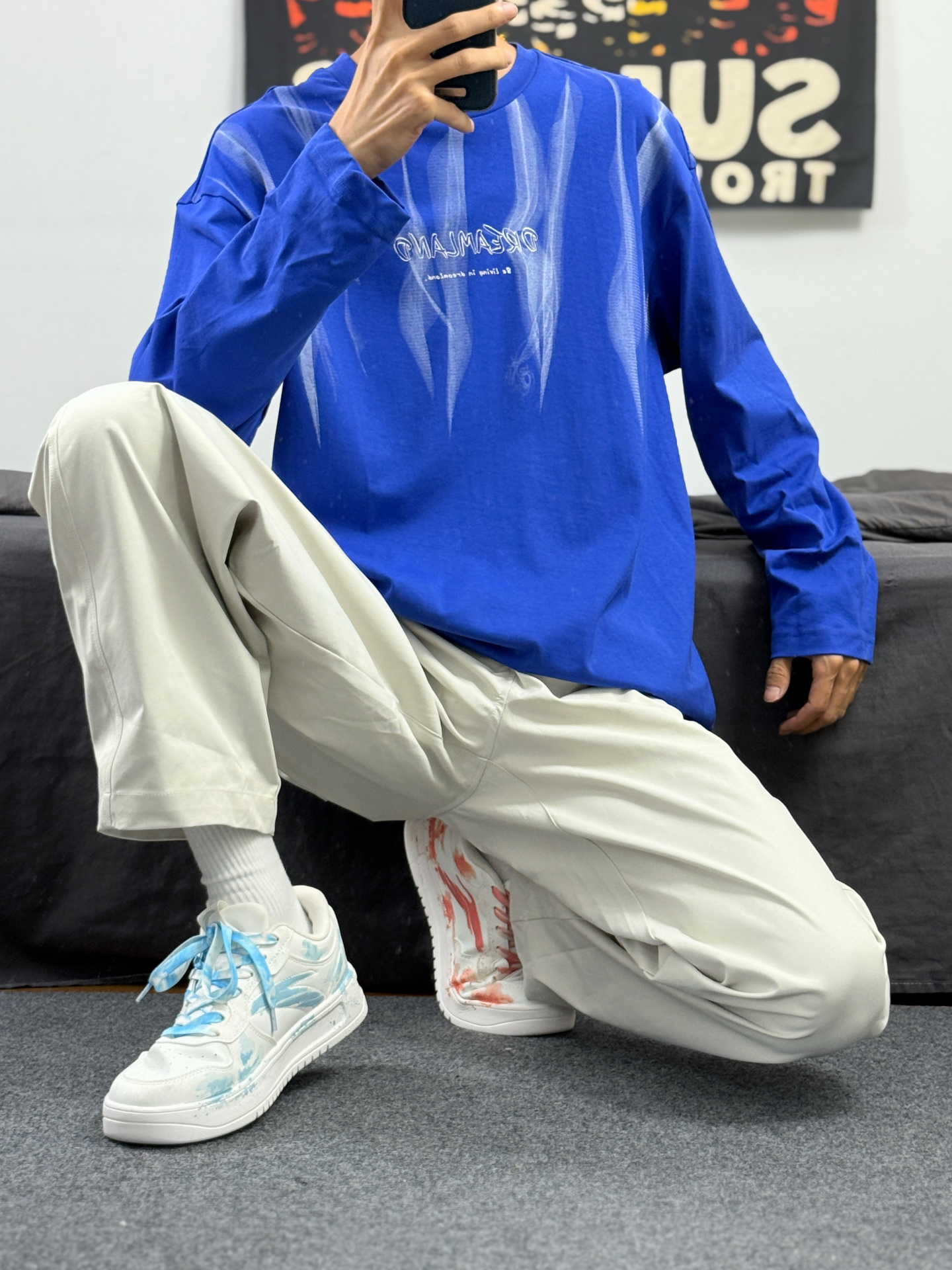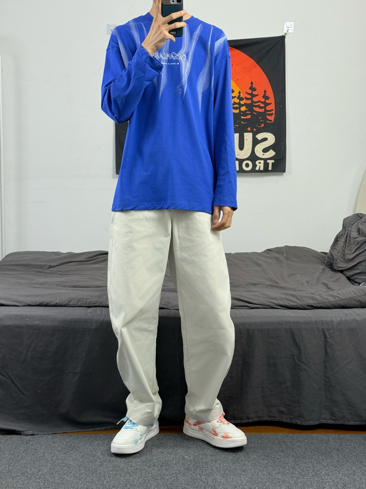 身高174,体重48kg 今日上身 蓝色长袖+灰色弯刀裤+板鞋 👟是万花弄家的定制安踏板鞋 鞋面虽说是做了水墨晕染处理有点偏新中式 但在配色上却非常大胆 粉蓝配色,上脚特别的吸睛 上脚的话个性感十足 脚感也是松软舒适,防滑耐磨 好穿还好看 脚码41,上脚41 不偏码哈 #一双鞋穿遍秋天 #爱的定制礼选这双 #宝藏板鞋分享 #今天只晒鞋 #男生穿搭秋季OOTD