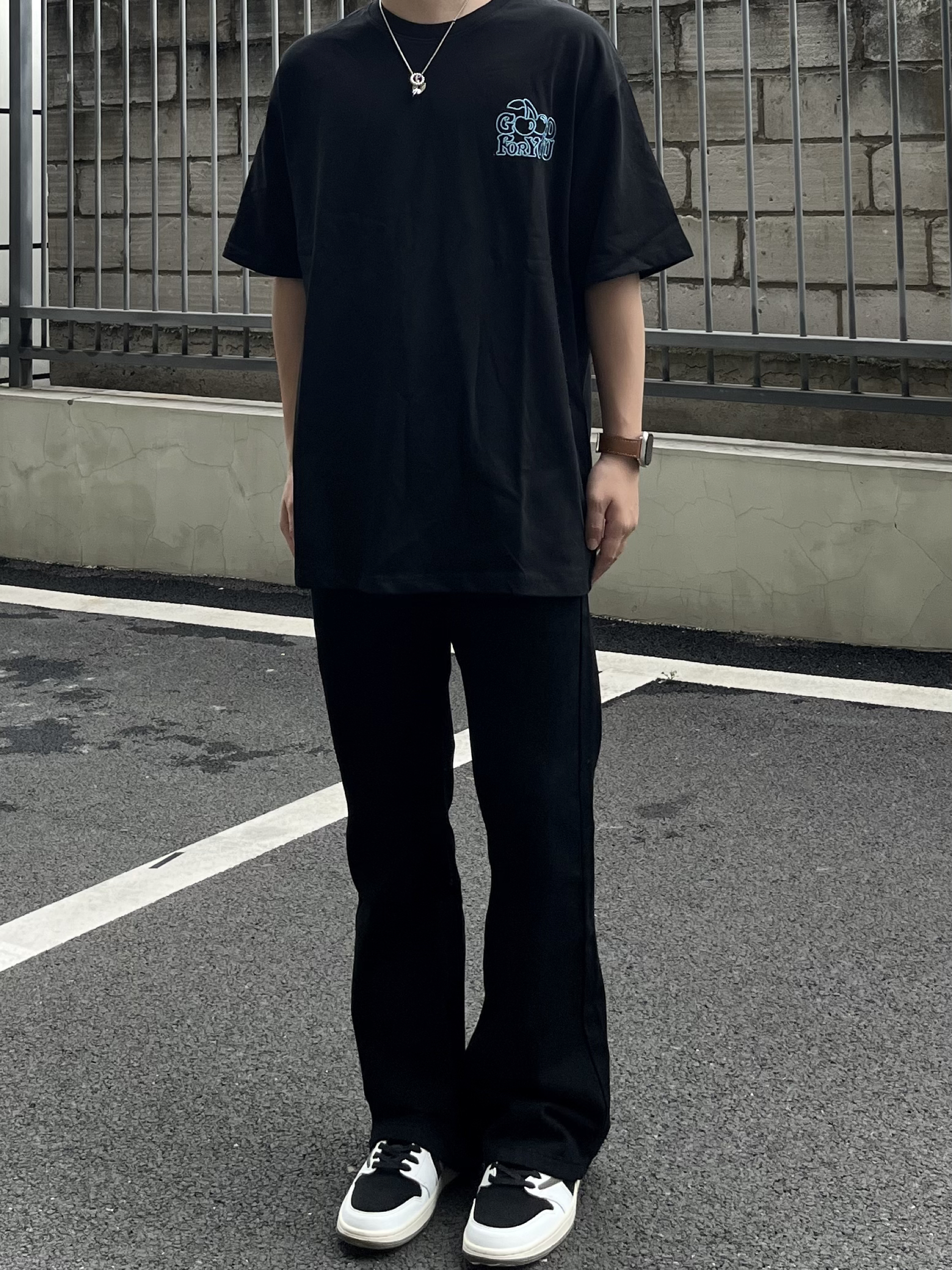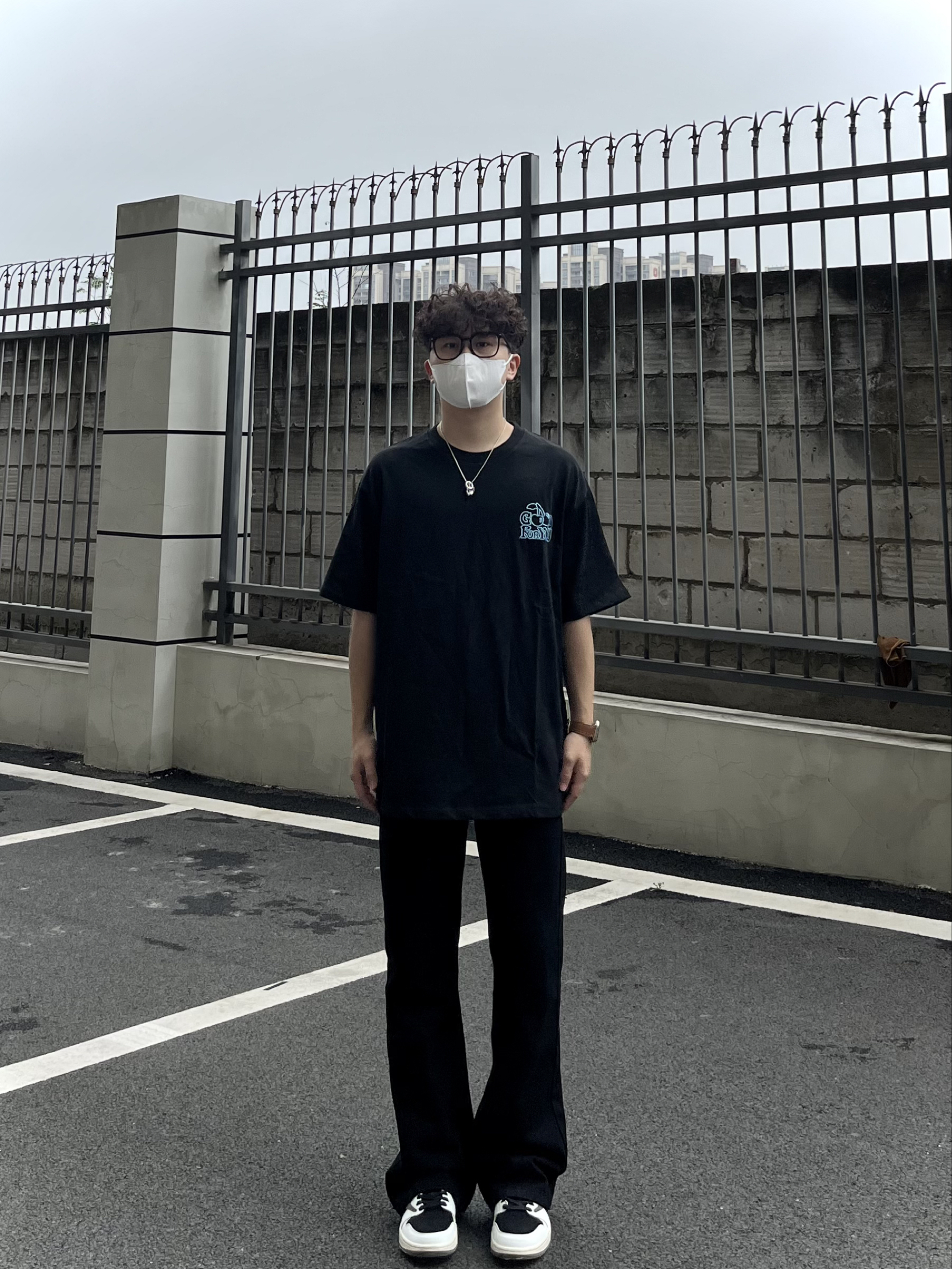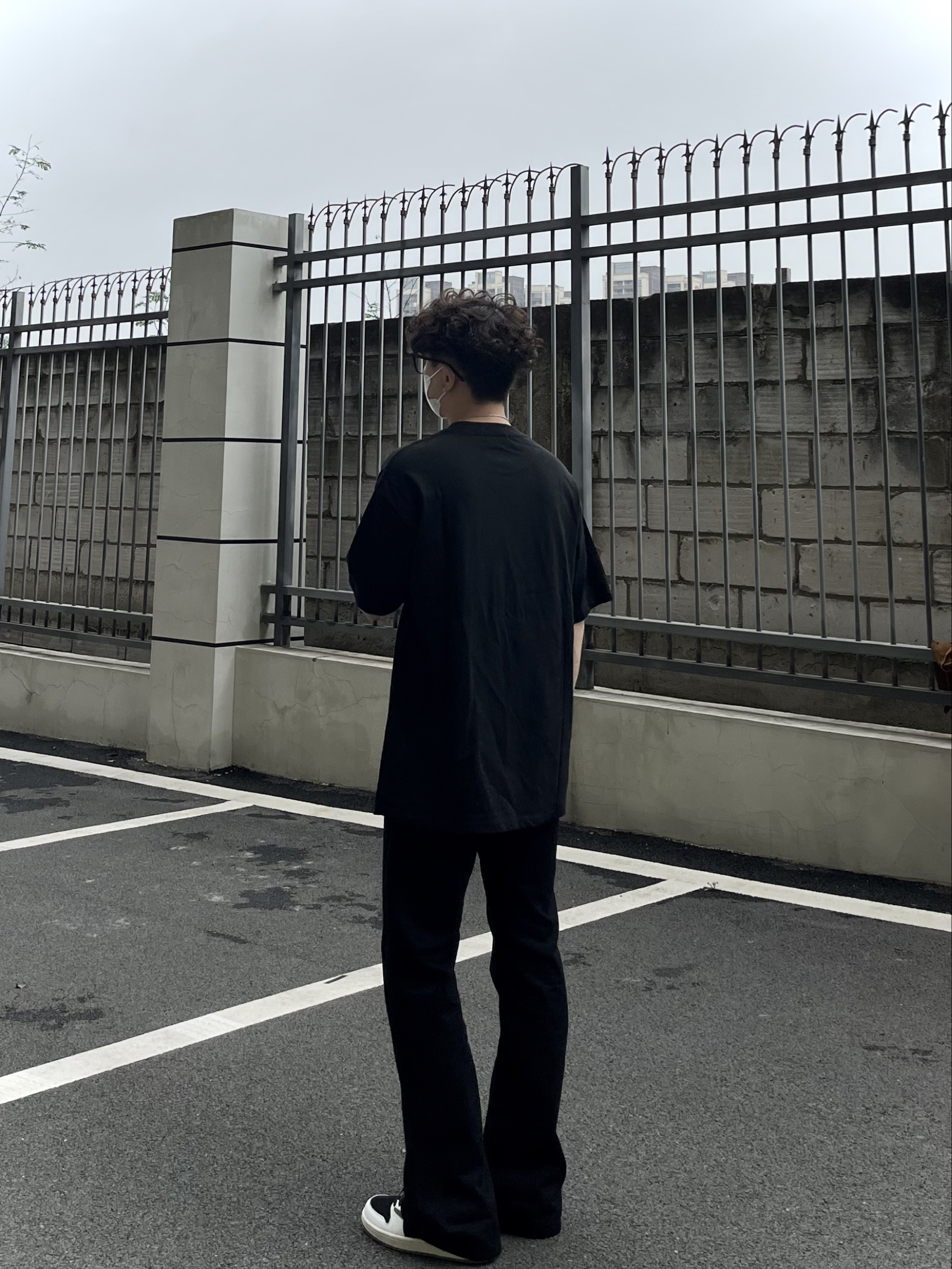 哈喽这里是乐言同学🏂🏻 美式vibe的感觉真的很心动自由又随性! 上身一件黑色的极简印花T恤,胸前logo是镂空樱桃🍒刺绣 干干净净的很好看,裤子是一条黑色的微喇牛仔裤。鞋子搭配倒钩AllBlack一身黑有人追!很显高级质感的一套。