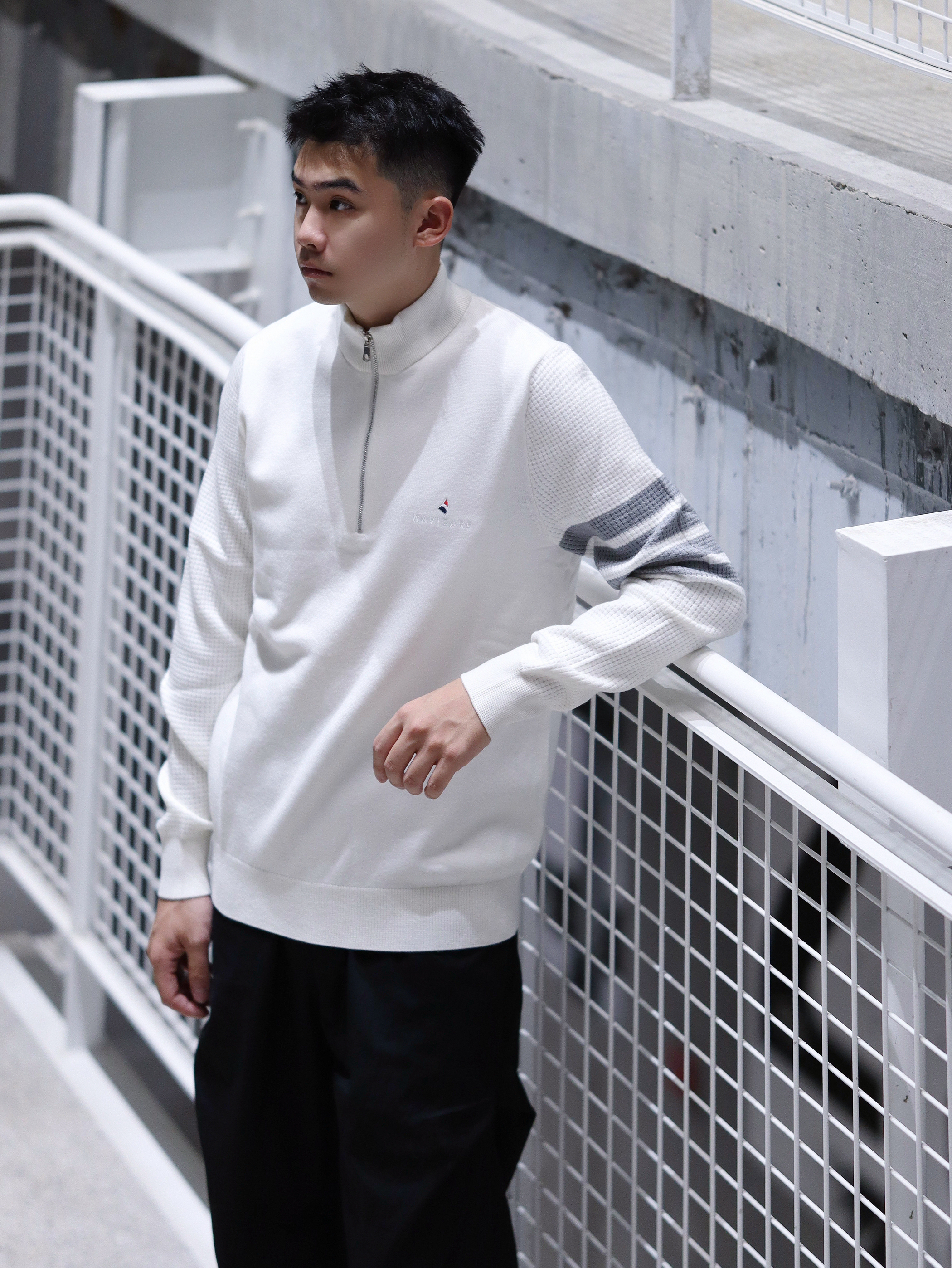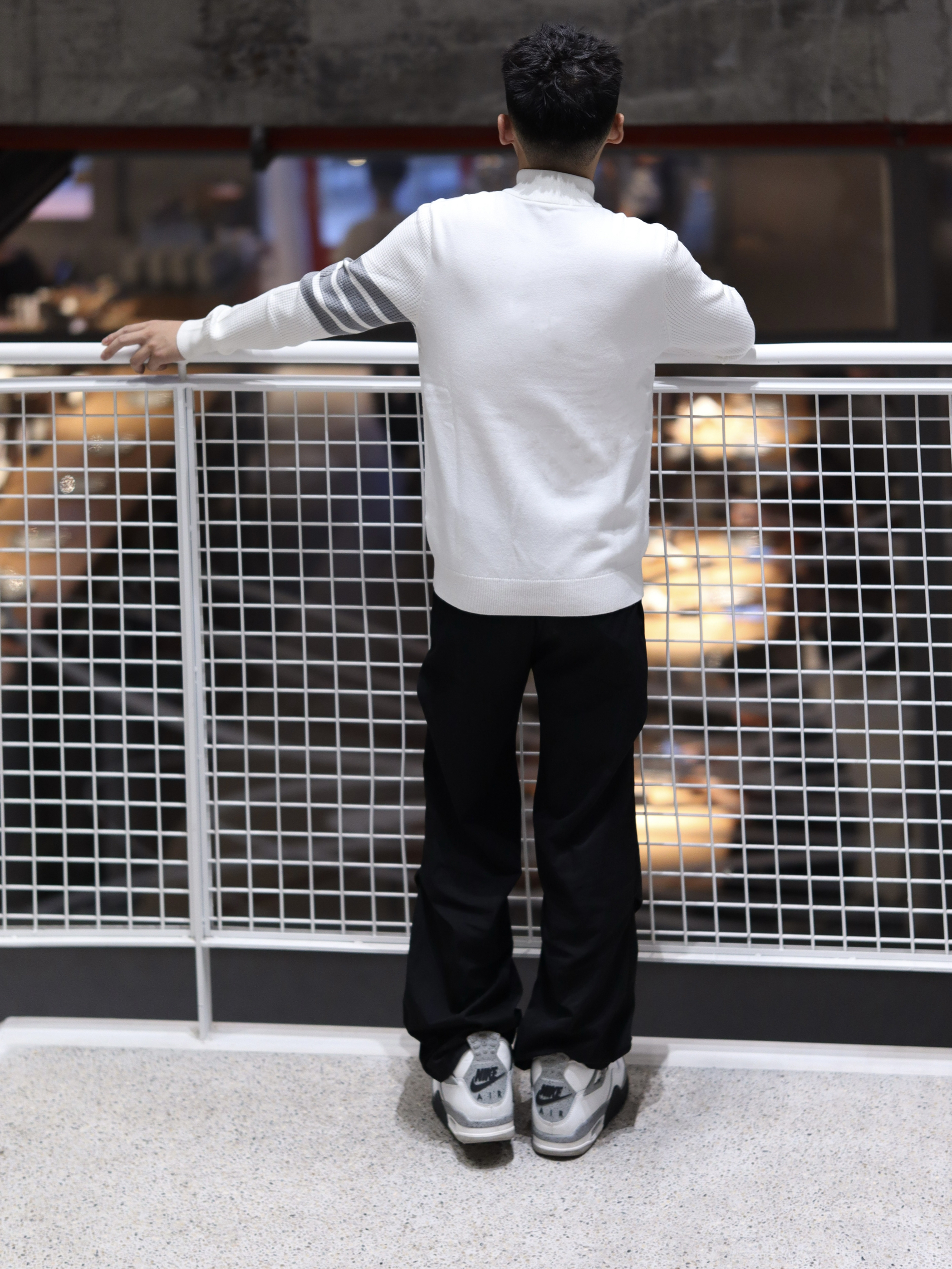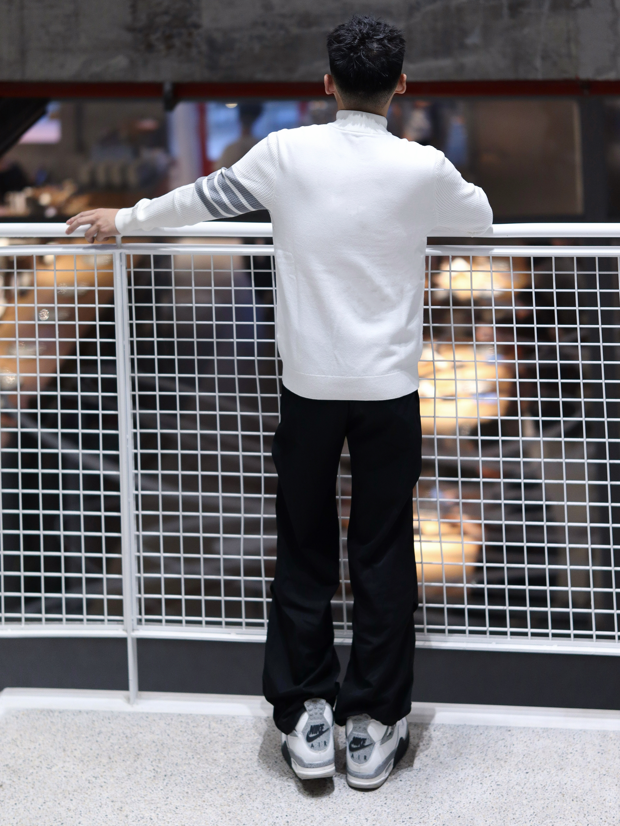 要想穿搭不出错 首选还是black&white 白色开领长袖针织衫 臂边灰色横杠的设计 简约中暗藏穿搭小巧思 下搭一条黑色休闲裤层次感就有了 轻松的解决约会穿搭~