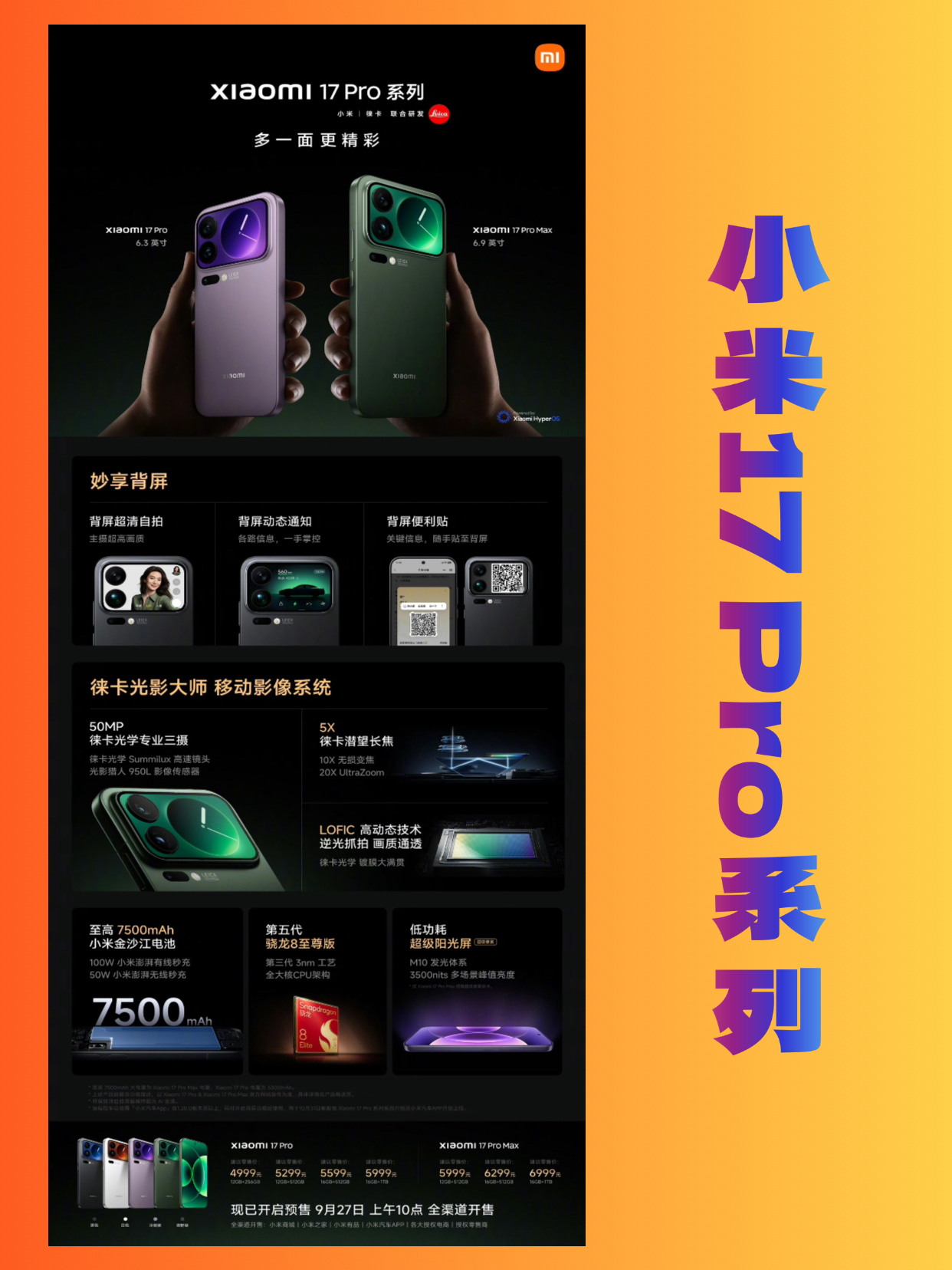 本篇笔记关联了MI/小米 17 Pro 5G 手机 全新龙晶玻璃交互背屏 华星光电M10 1.5K直面屏 骁龙8Elite5处理器 环形冷泵3.0散热 快充 全网通 防水 大电池 徕卡光影大师 森野绿等商品,为用户提供真实的使用体验和购买参考。