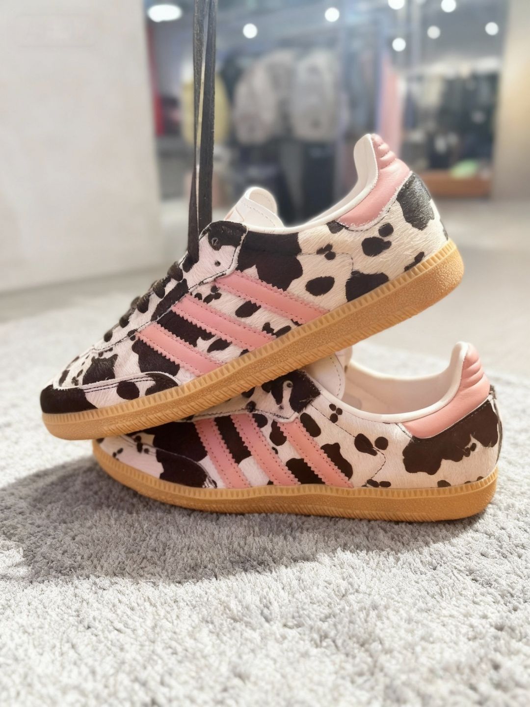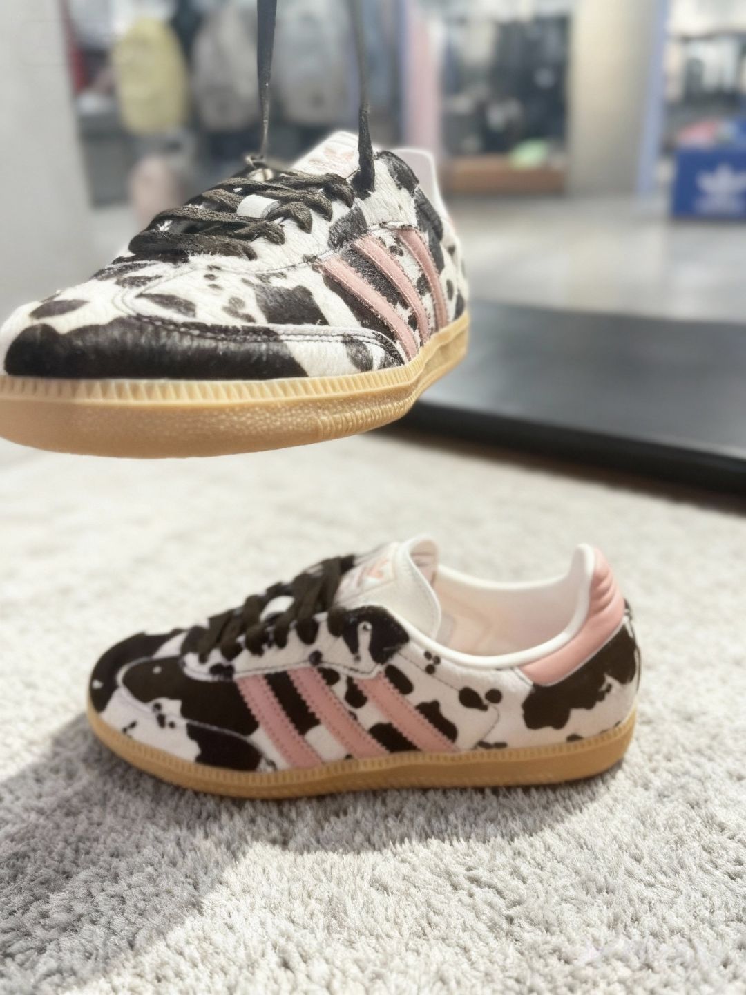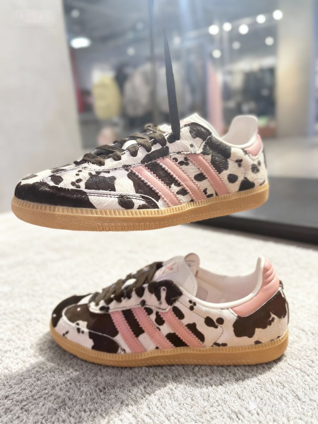 作为一个喜欢在穿搭上搞点“小特别”的人,这双阿迪的奶牛纹鞋子真的让我眼前一亮。 第一次在店里看到它就移不开眼了,奶牛纹的马毛材质特别有质感,粉色三道杠又甜又酷,搭配生胶底,复古感直接拉满。上脚的瞬间就觉得很软和,平时上班配个小裙子,下班换条牛仔裤,风格切换毫无压力。 最绝的是它的回头率,上周穿去逛艺术展,有个小姐姐追着我问了半天链接。而且这鞋特别“抗造”,我穿了快一个月,也没怎么变形,打理...