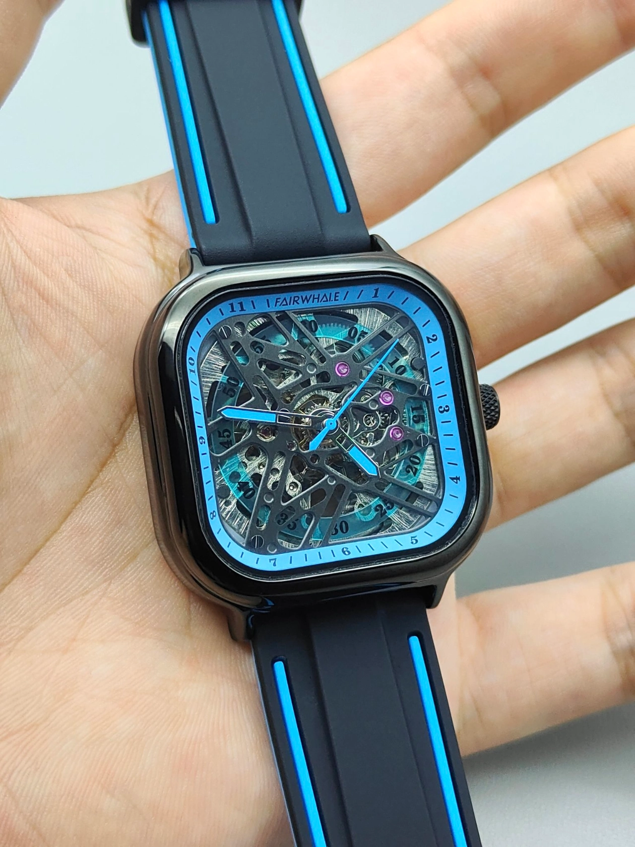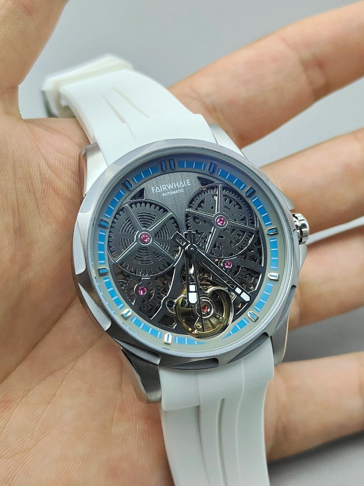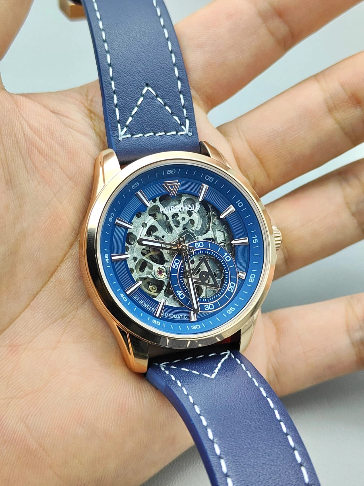 本篇笔记关联了Mark Fairwhale/马克华菲 高端真皮防水双面镂空雕花飞轮自动机械男士手表 玫壳蓝面蓝皮带 等商品,为用户提供真实的使用体验和购买参考。