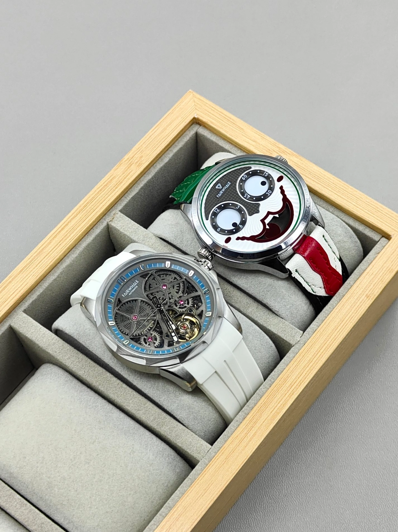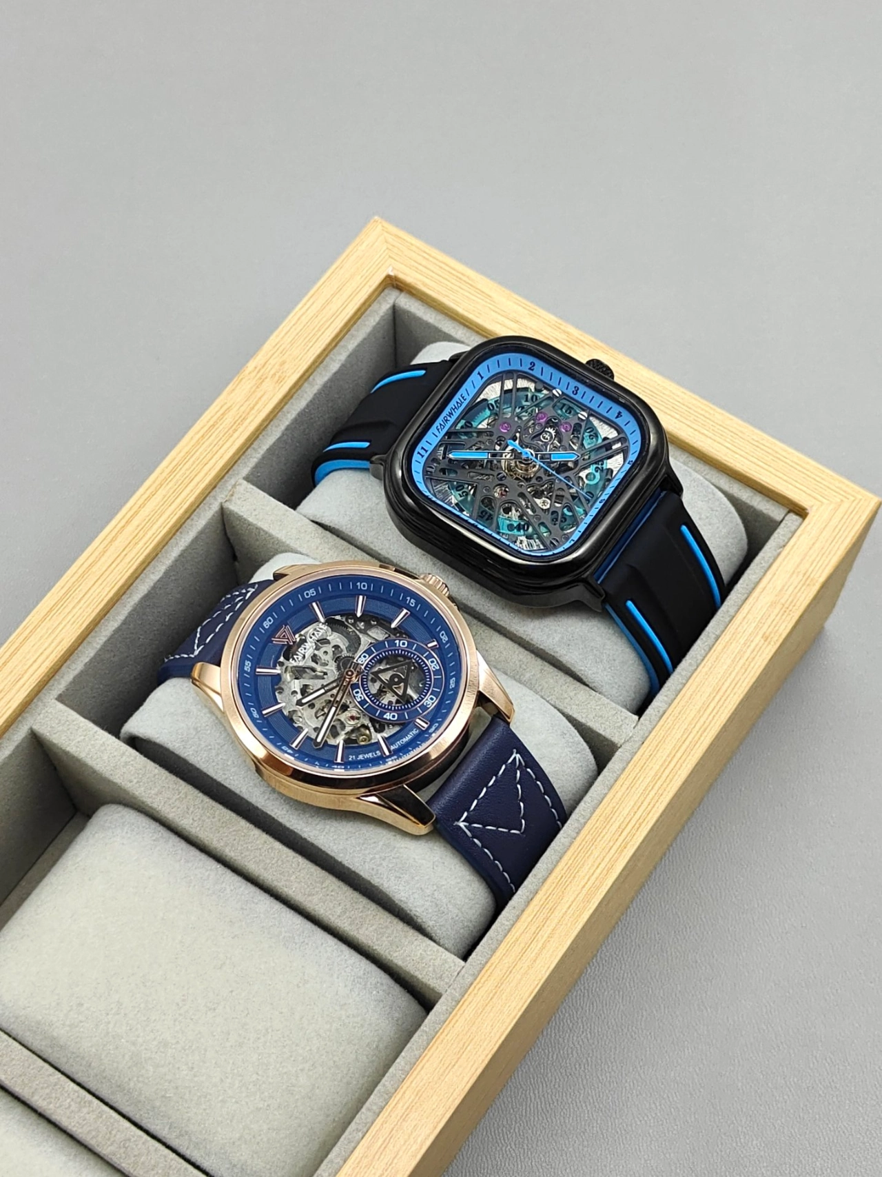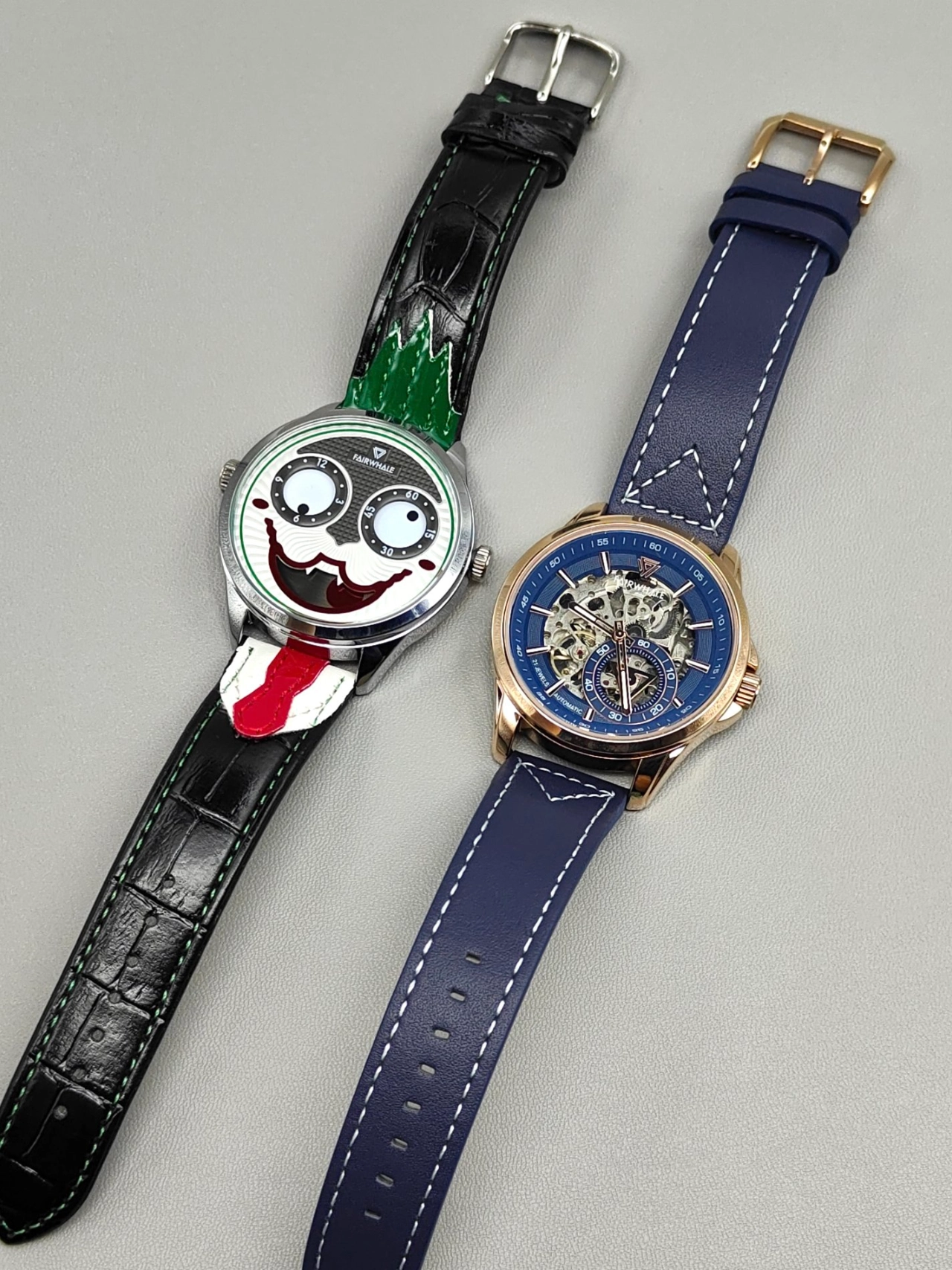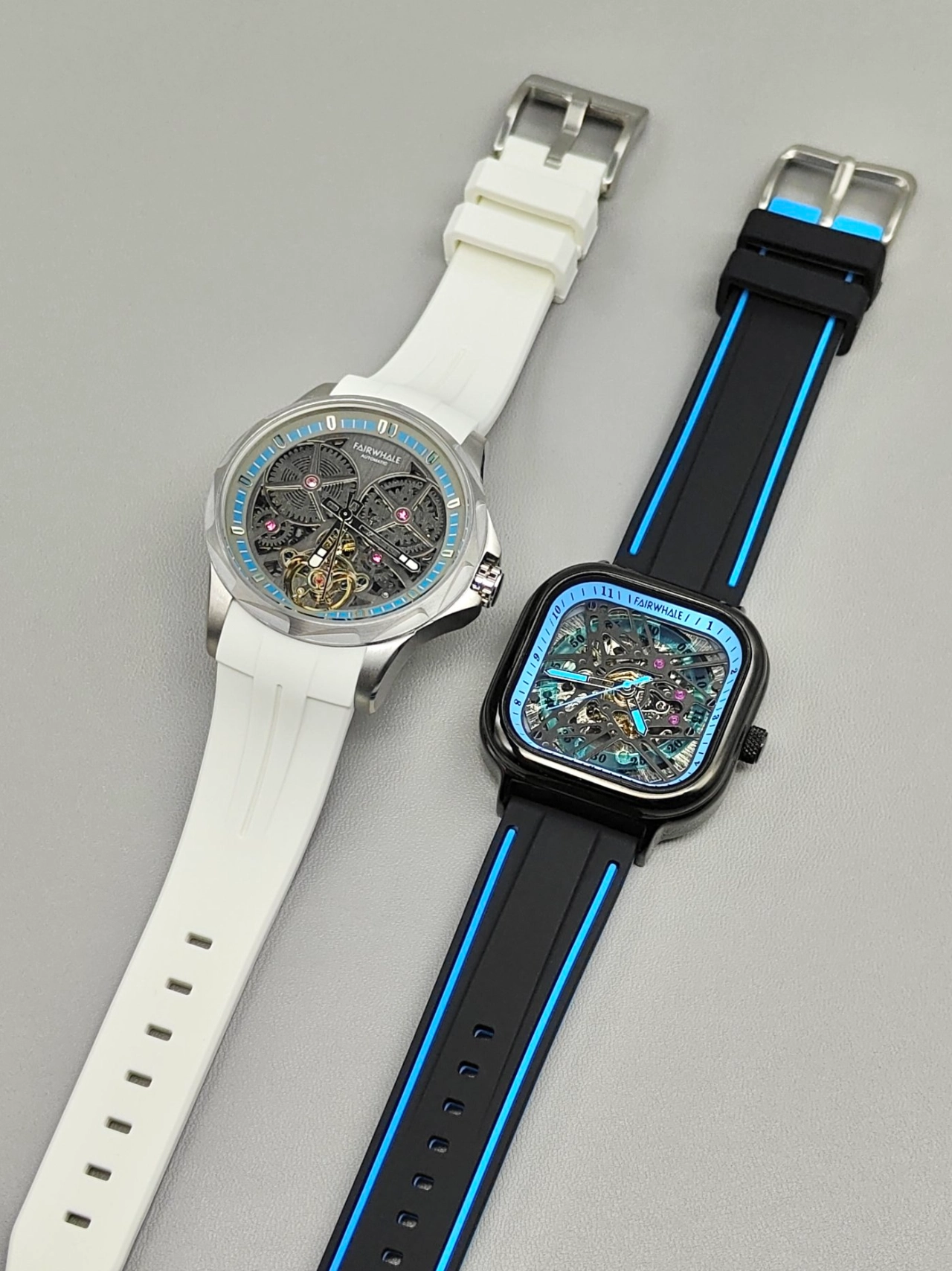 本篇笔记关联了Mark Fairwhale/马克华菲 高端真皮防水双面镂空雕花飞轮自动机械男士手表 玫壳蓝面蓝皮带 等商品,为用户提供真实的使用体验和购买参考。