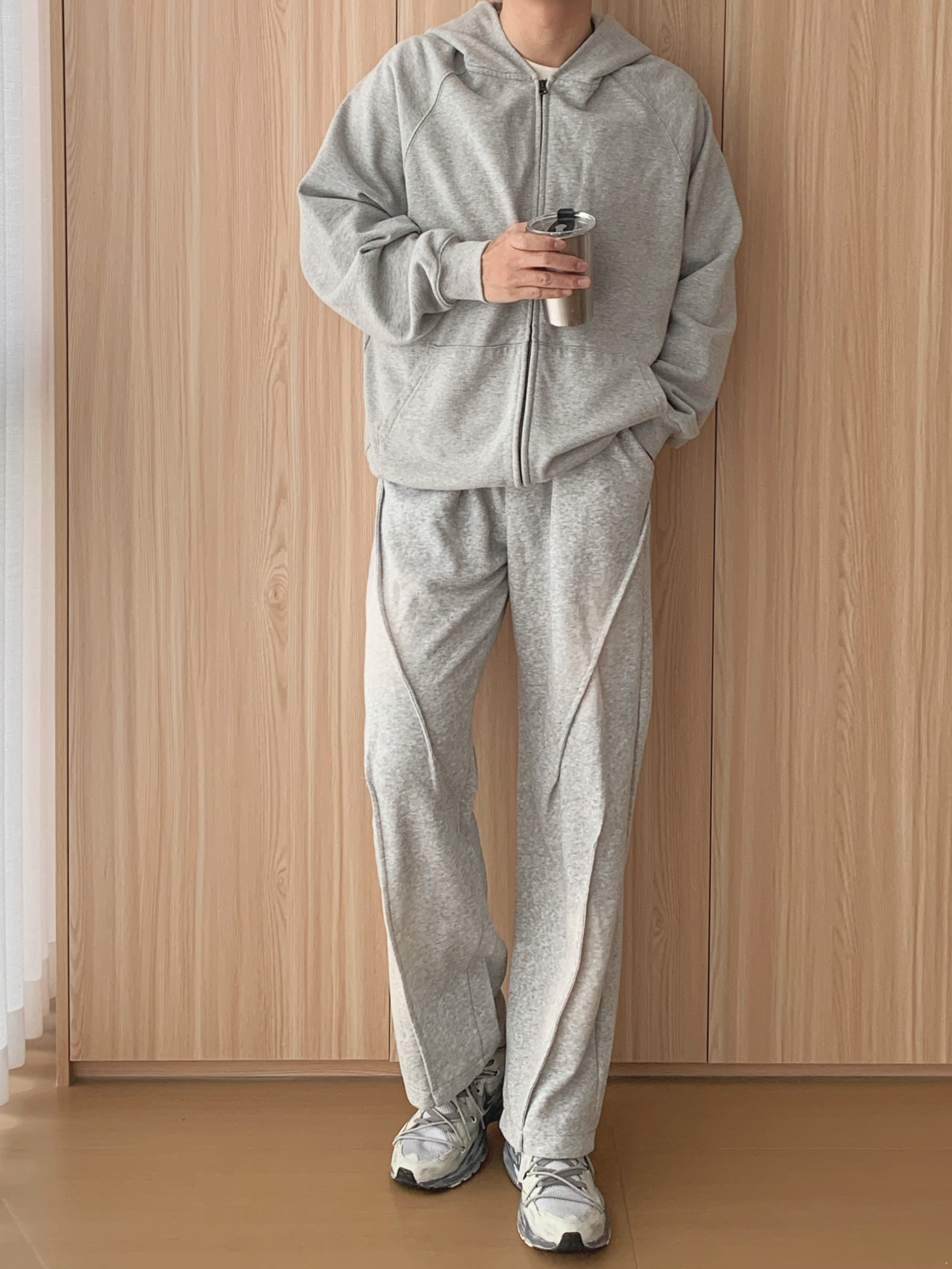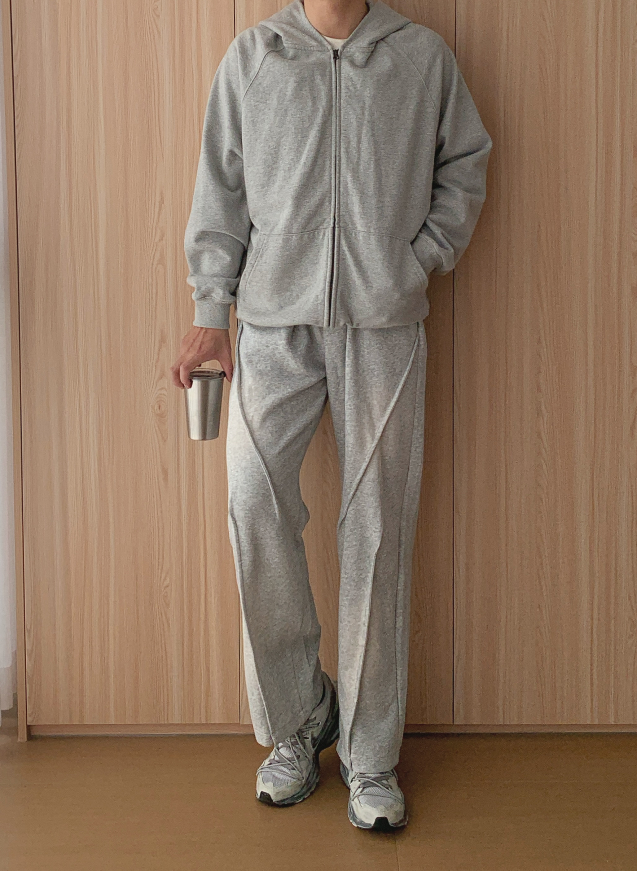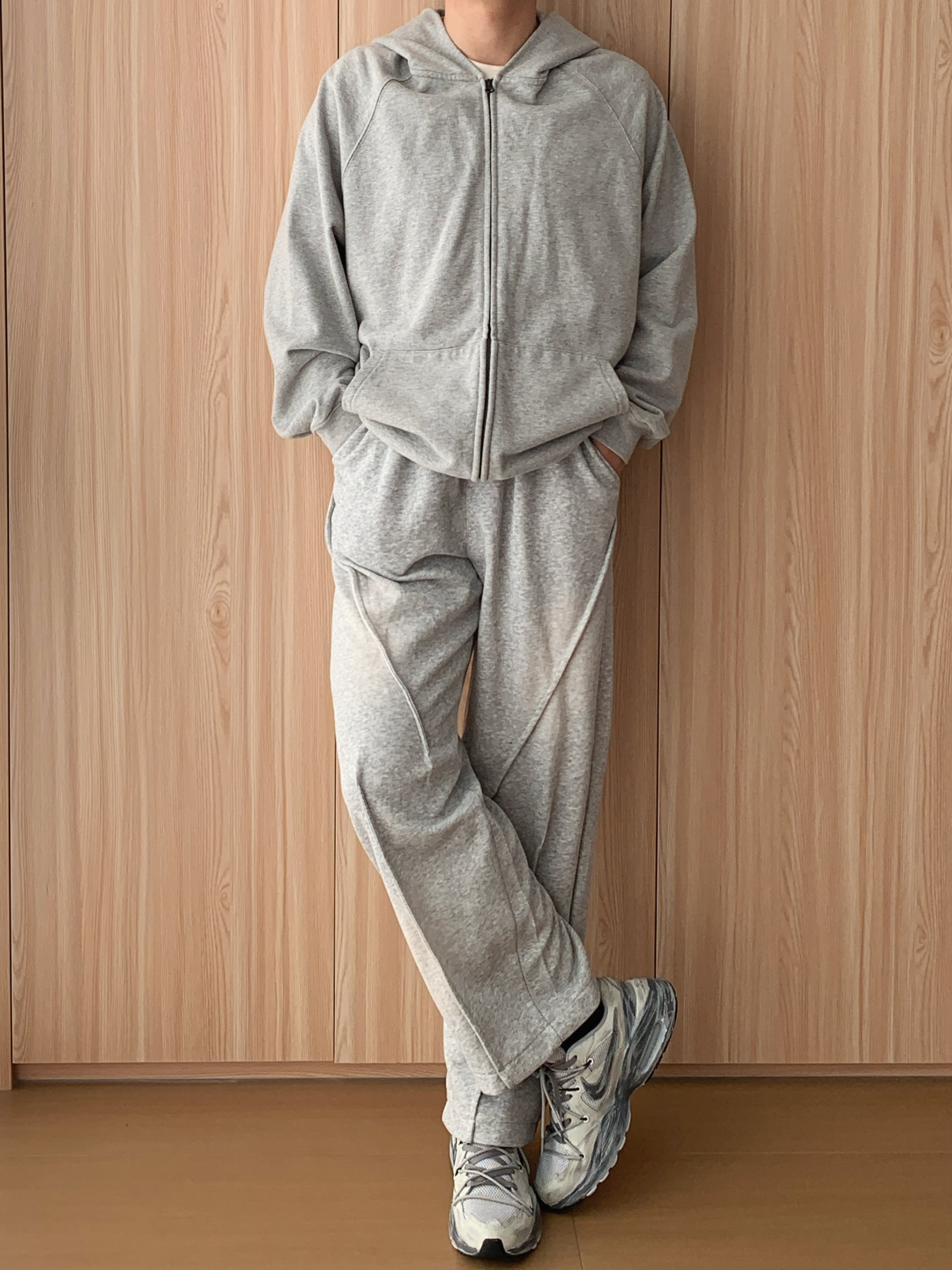 外层选一件灰色连帽卫衣开衫🧥,软乎乎的面料裹着超舒服,拉上拉链是干净利落的少年感,敞开穿又自带随性范儿,风大时还能拉上帽子挡挡风,实用性拉满~ 内搭基础款白T恤👕就很妙,简单一抹白中和了灰色的厚重,还悄悄增加了穿搭层次,不会显得单调。下装配同色系阔腿卫裤,宽松版型藏肉又自在,走路带风都不束缚,日常逛吃、取快递超适配~ 最后踩一双灰色废土风老爹鞋👟,复古纹理超有小细节,和整套穿搭色调呼应,不费力...
