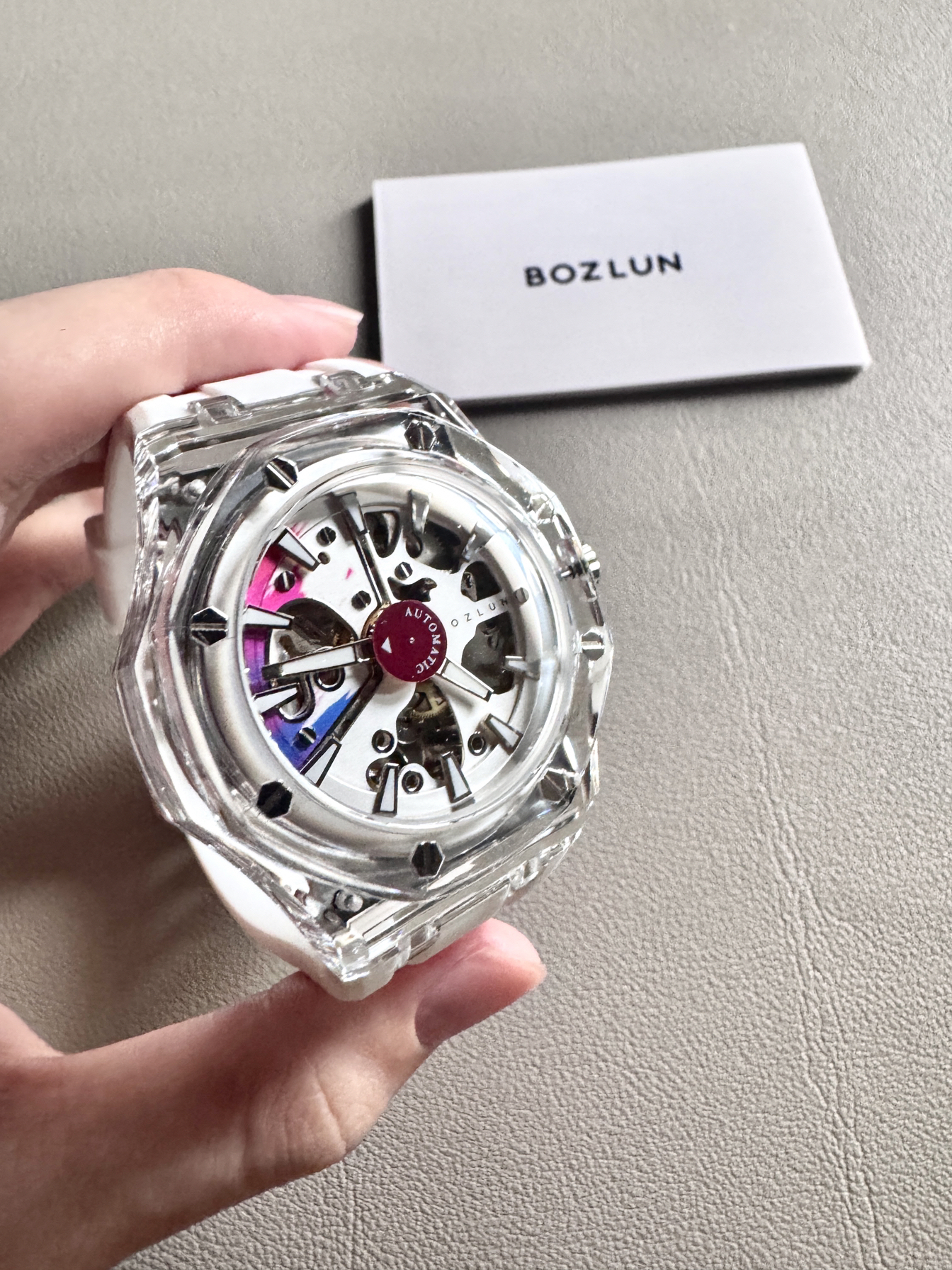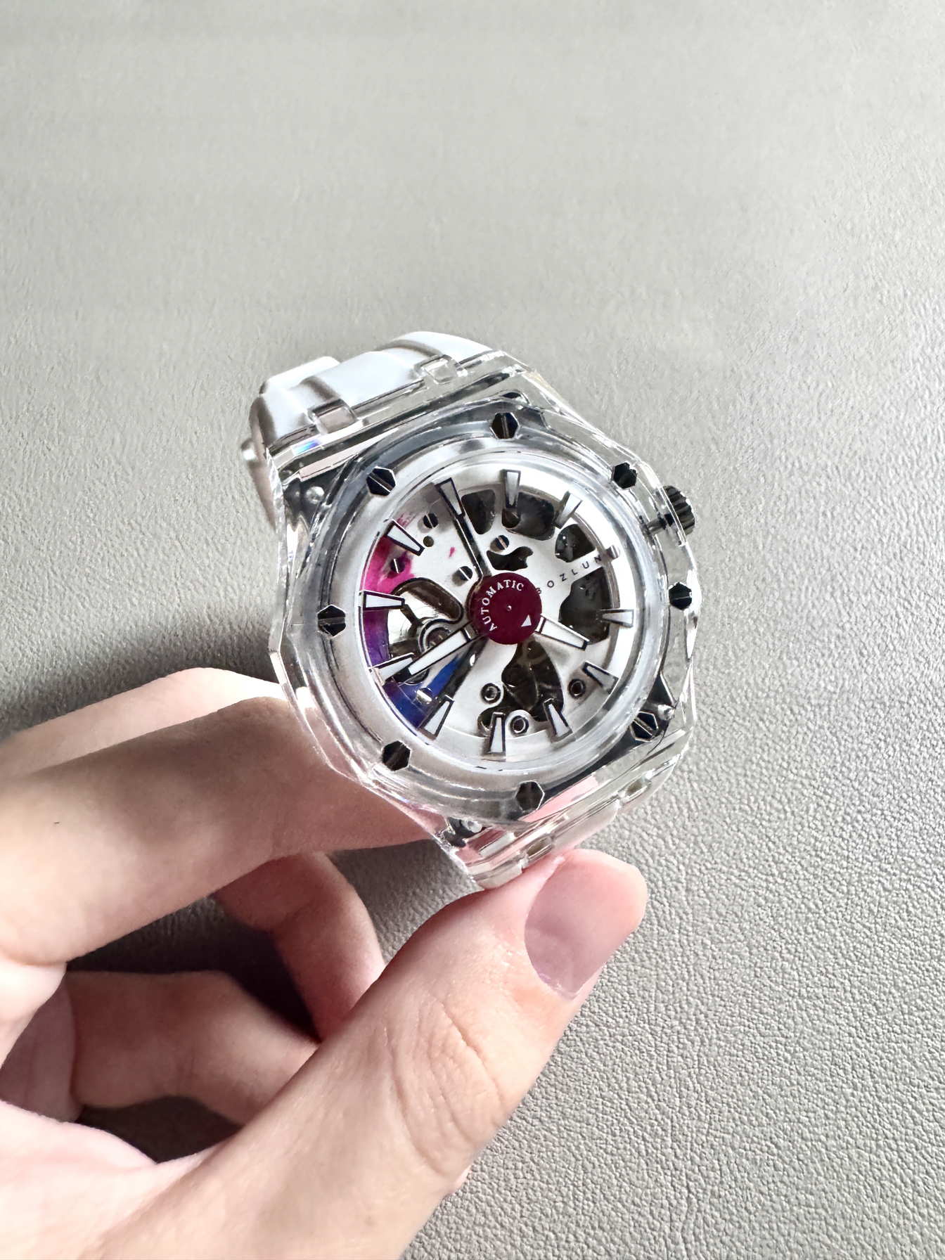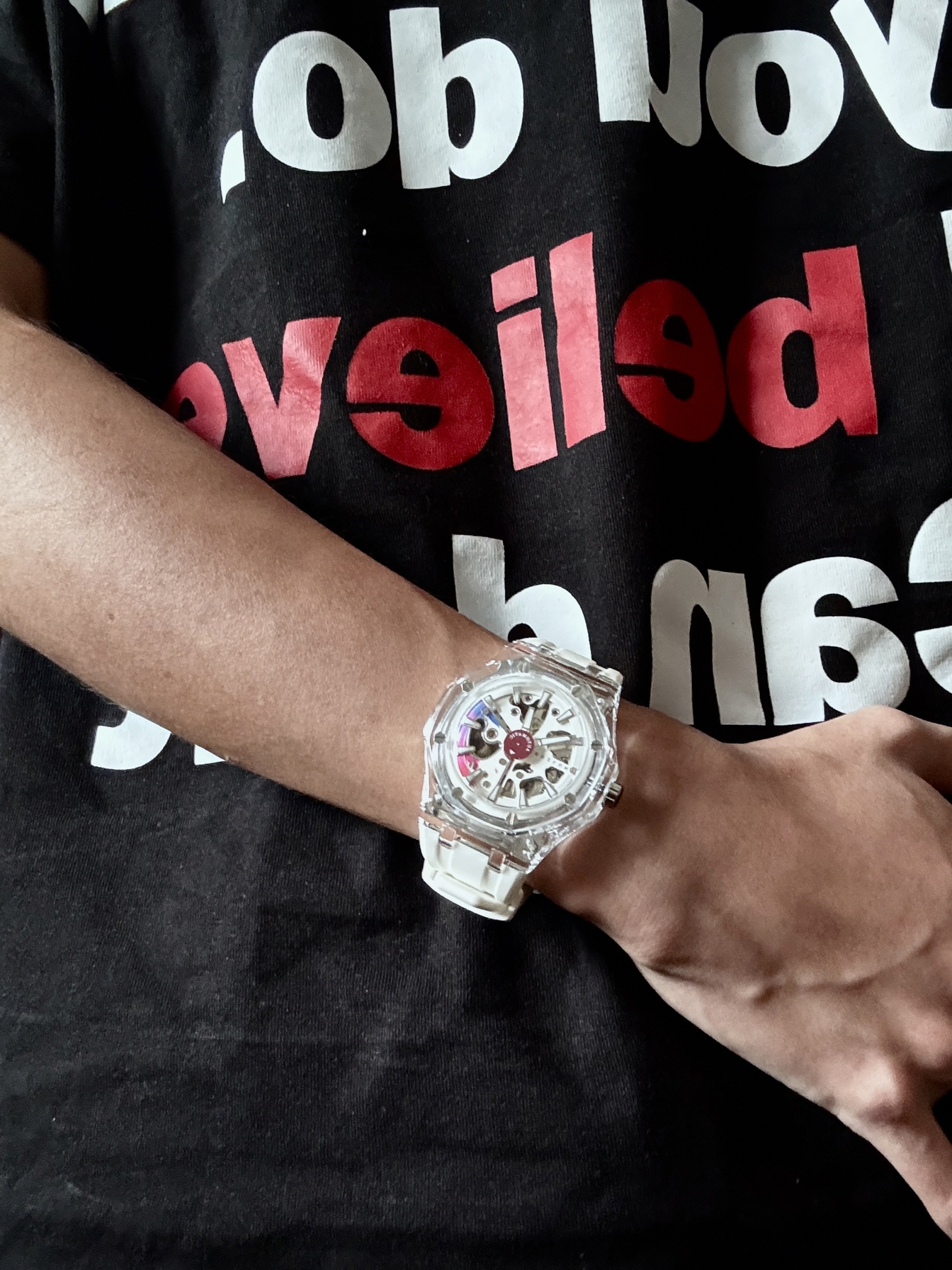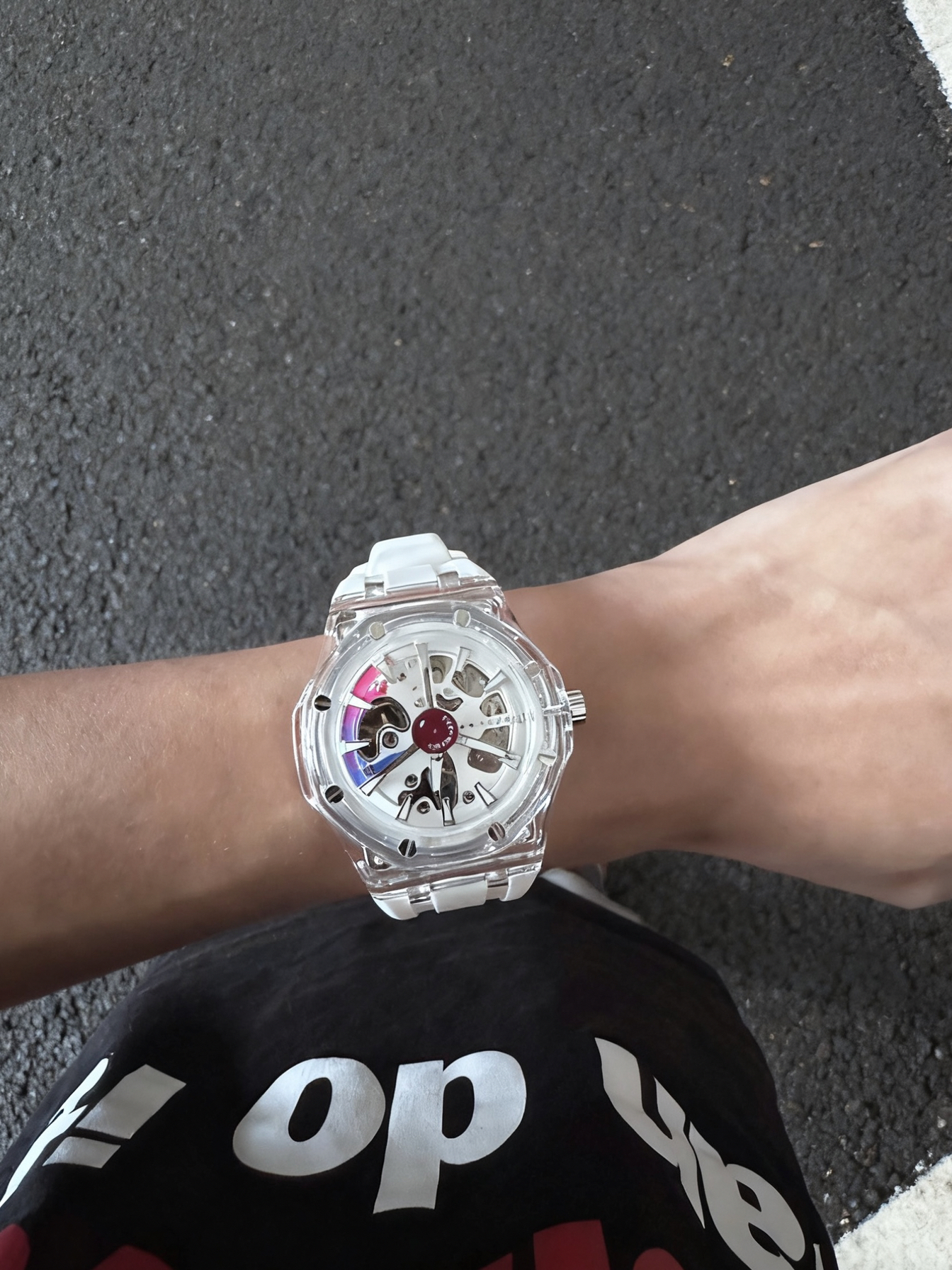 博之轮你小子 有点东西啊 这么帅的手表 你竟然设计出来了! 透明镂空表盘 科技感十足 白色透明的手表 真的蛮有少年感的! 实物拿在手里 还是蛮有质感的 白色硅胶表带 戴在手上软软的 穿什么衣服都挺百搭的
