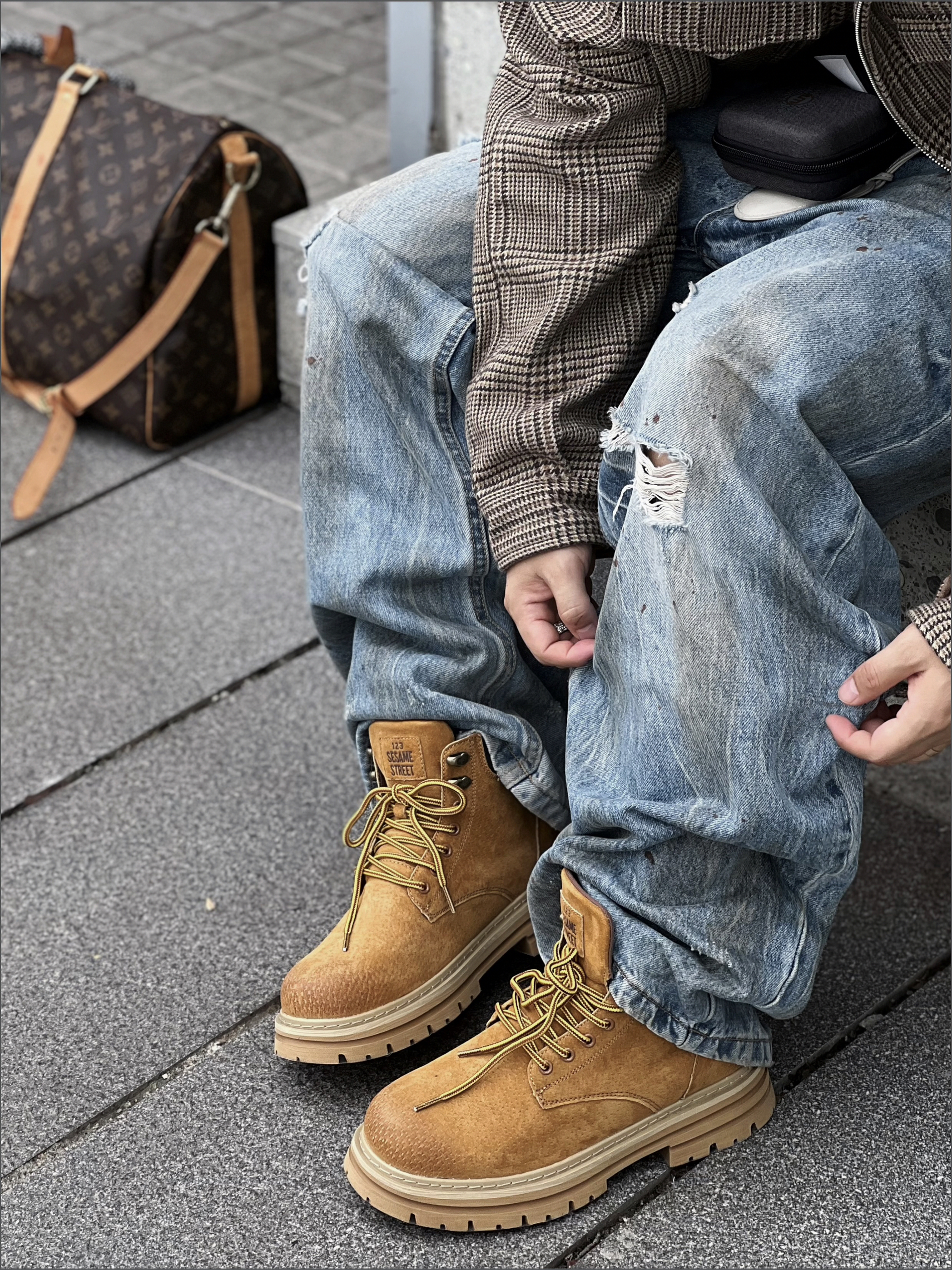 Hi、这里是有点懒的薯条🍟~ ☑️属于中国🇨🇳人独有的假期🙋它真的来了! 保持Chill、街头Hook还是来了。 🔘拥有一套舒适的入秋变装🍂 马丁靴算是一个入门单品了‼️ 加上棕色外套🧥的get、美拉德属性妥妥的拉满! 做旧弯刀蓝牛的选择、与马丁靴可以做一个不错的呼应, SESAME STREET 老钱大黄靴、增高耐磨、属于秋冬的氛围感不就来了。 🙋i人...