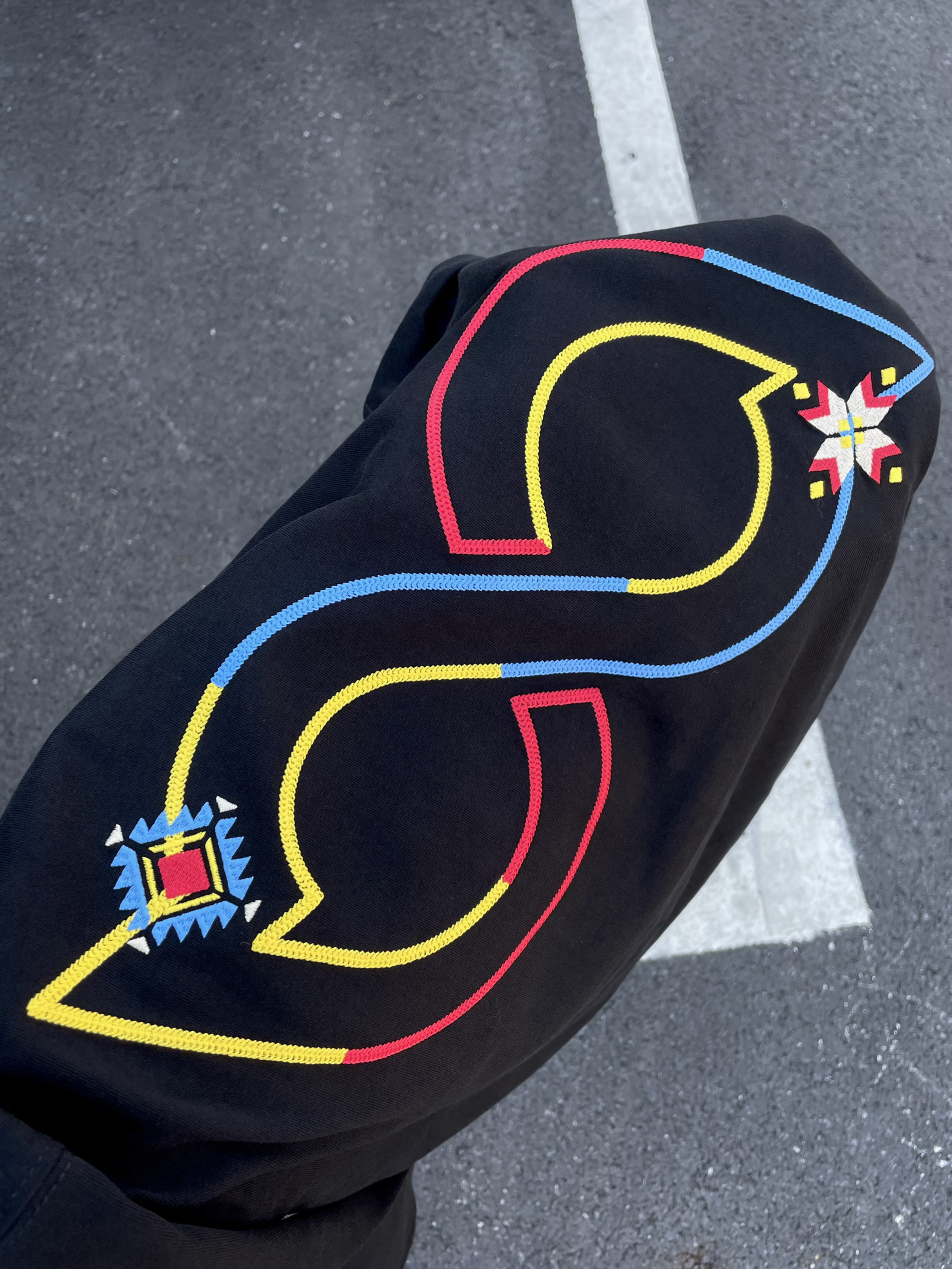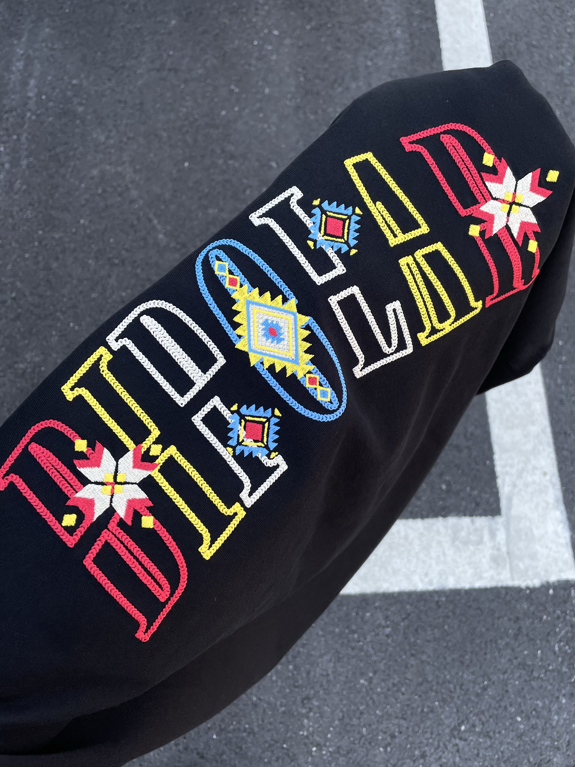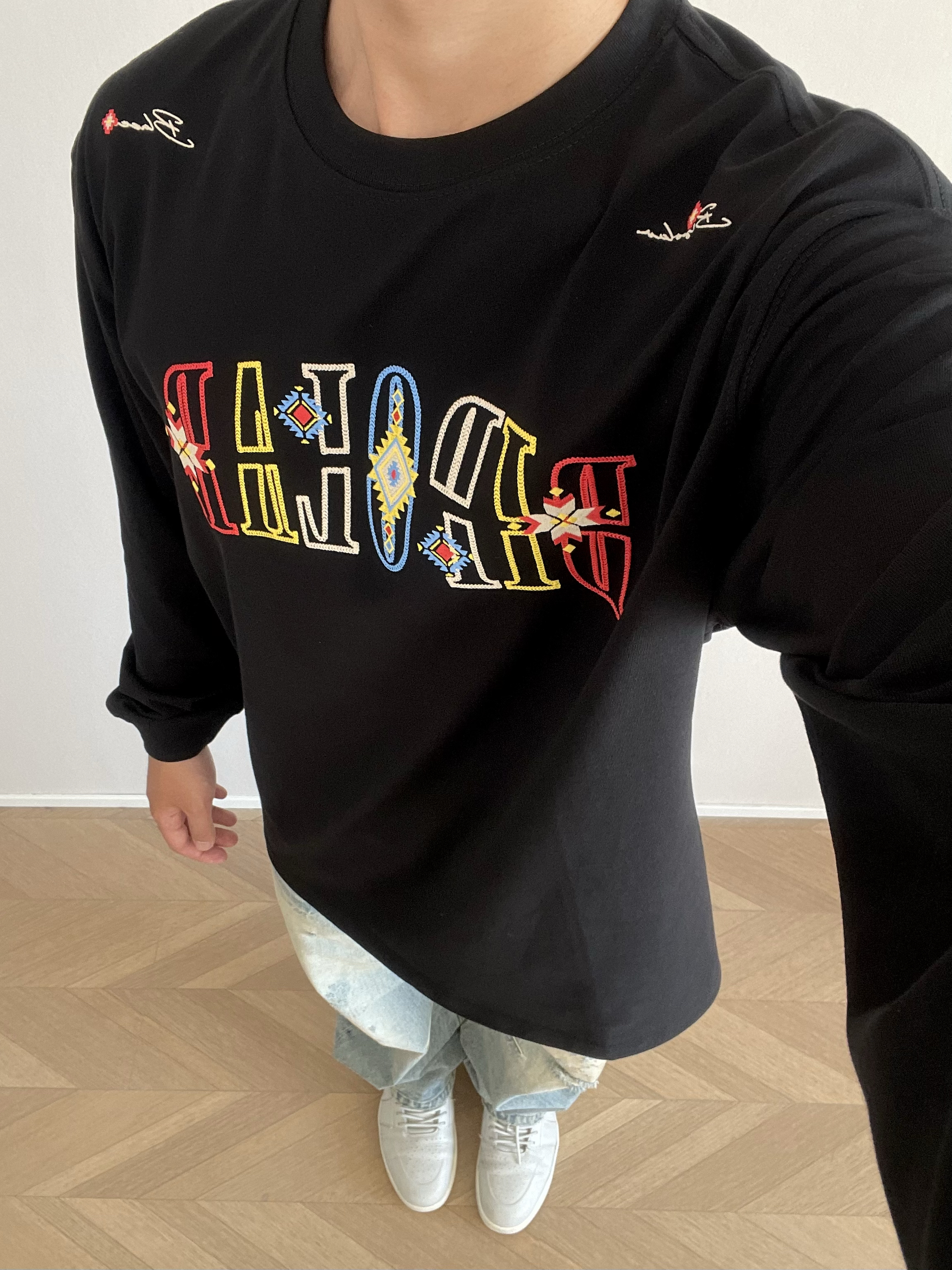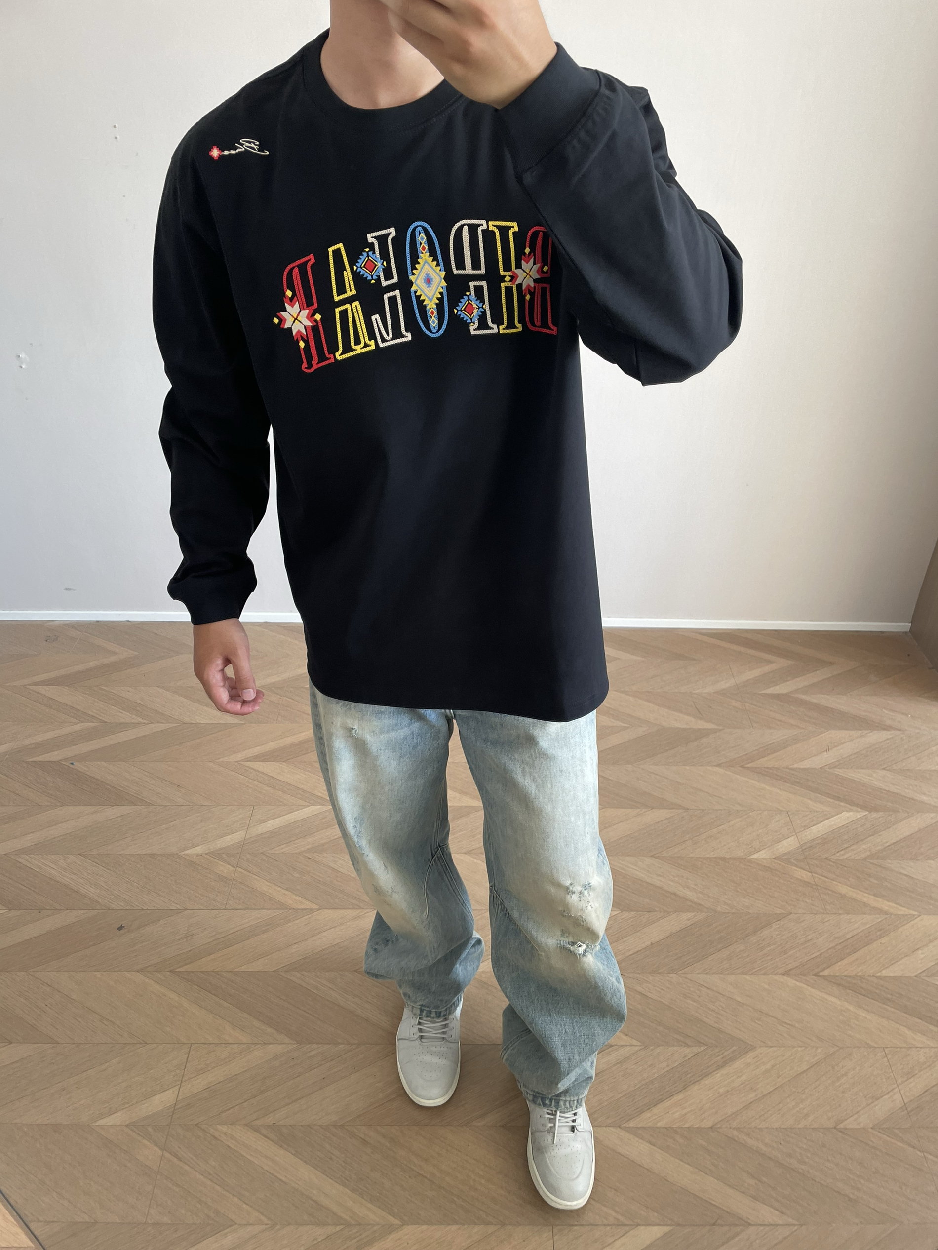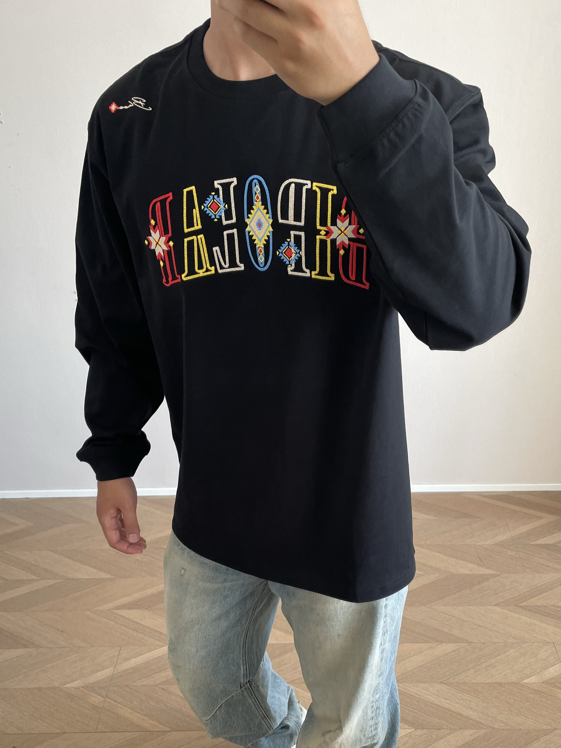 halo 今日穿搭分享来喽🤩 这款bipolar家的刺绣🪡 长袖t 真的好好看~ 刺绣🪡的颜色搭配 很亮眼 🩵💚🧡💛❤️🤎💜 拍照真出片~ 主要是面料也很舒服 透气效果杠杠的👍 🙋181cm 75kg Xl宽松效果✅