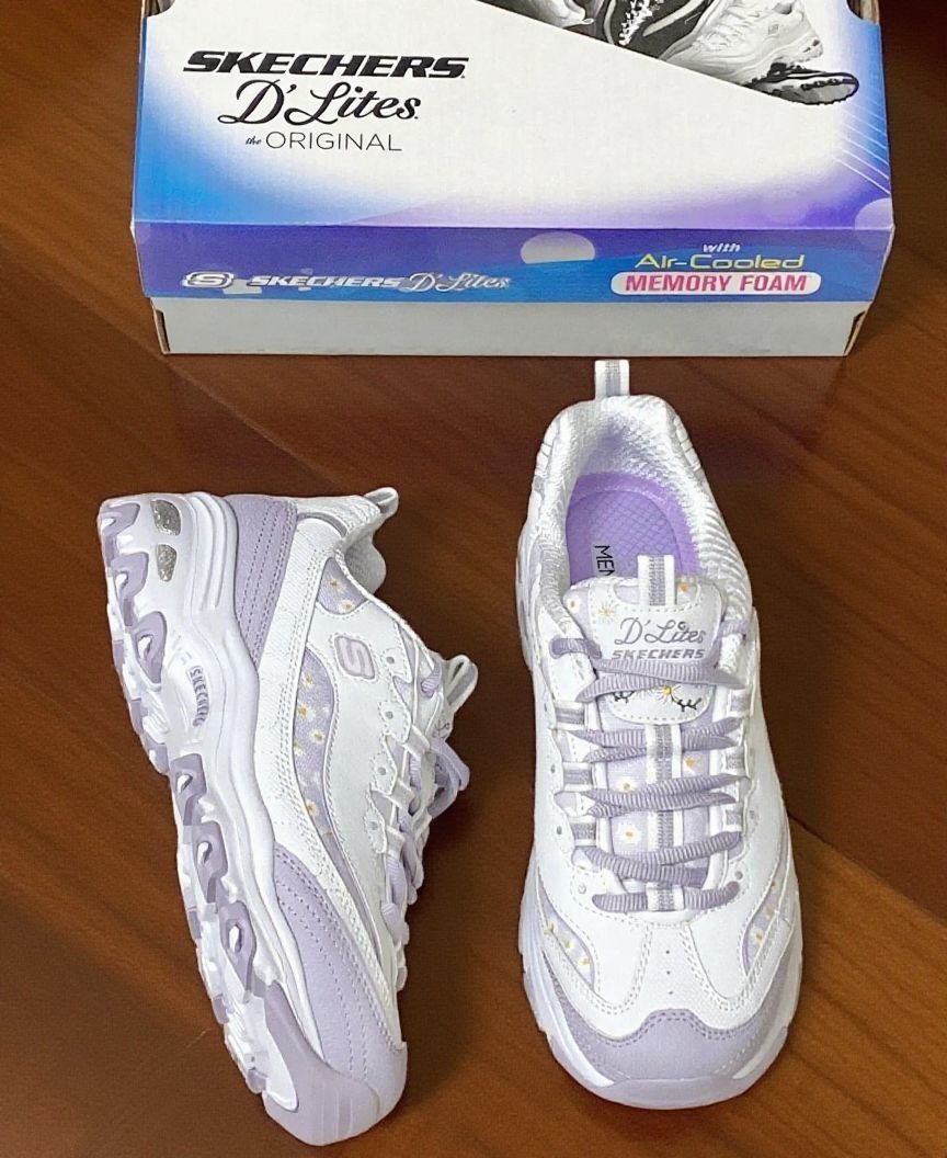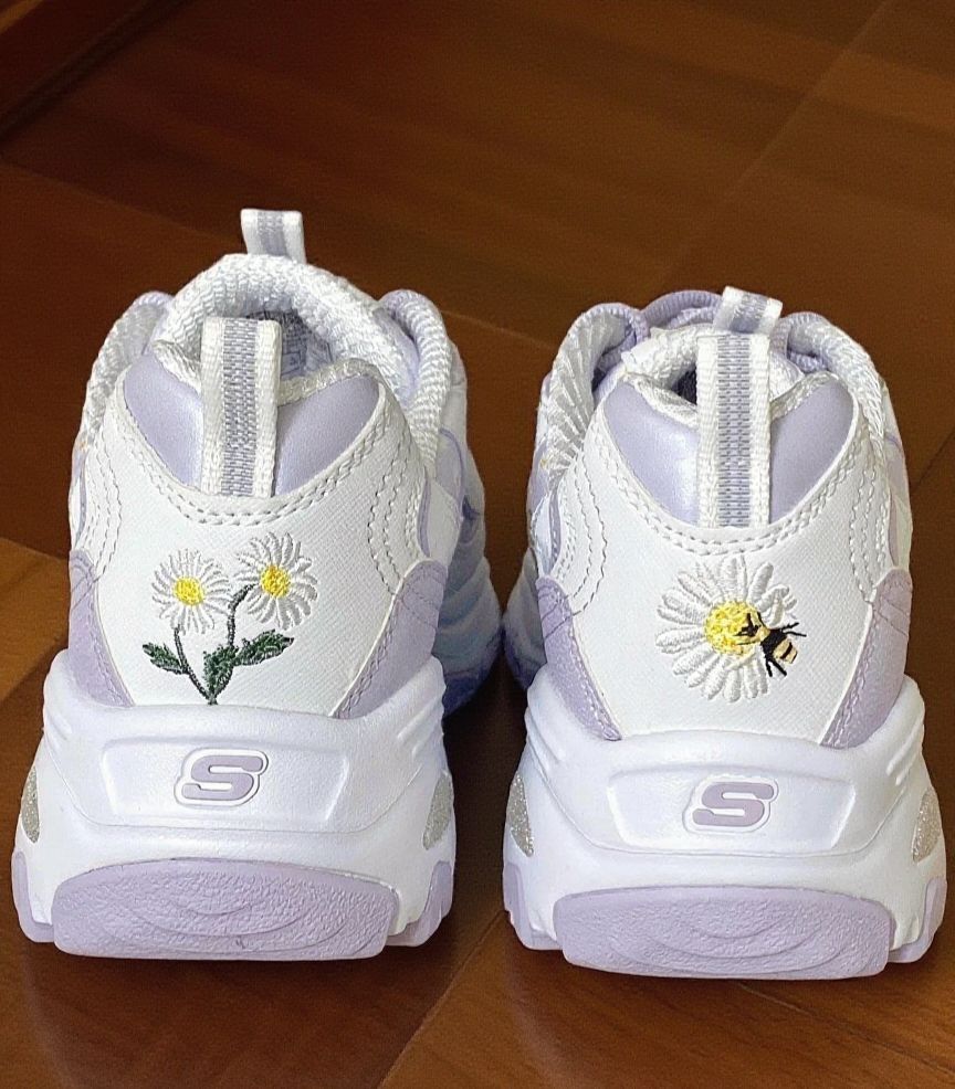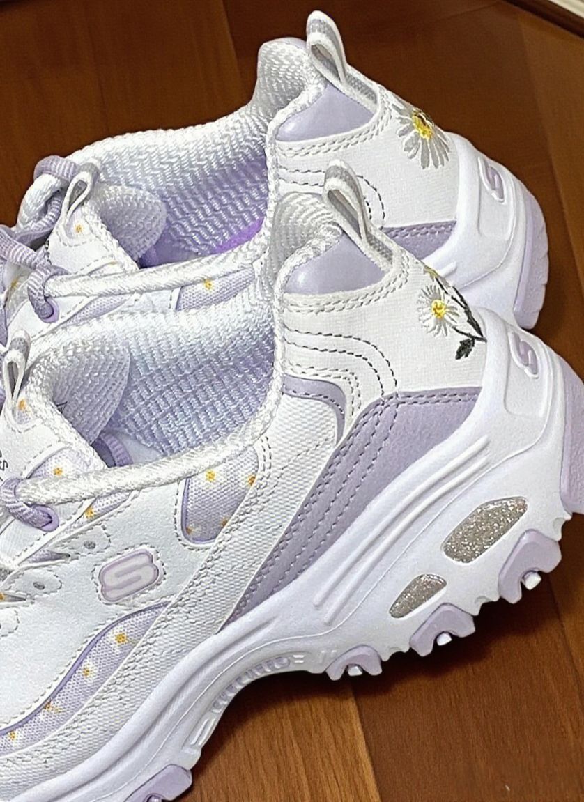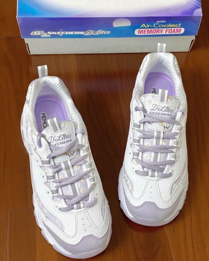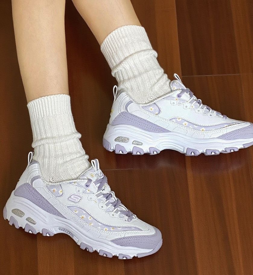 斯凯奇小雏菊老爹鞋|踩在云朵上的快乐谁懂啊 谁能拒绝这双满是小雏菊的斯凯奇老爹鞋啊!淡紫色调温柔又清新,鞋面上的小雏菊刺绣精致又可爱,细节感直接拉满。 上脚的瞬间,那种柔软的包裹感太绝了,走路时每一步都能感受到鞋底的缓冲,长时间走路也不会觉得累脚。而且鞋身设计得很巧妙,不会显得脚特别笨重,搭配堆堆袜和小裙子,简直就是甜妹本妹,休闲又带着点小俏皮。 不过有个小问题,鞋带是浅紫色的,比较容...