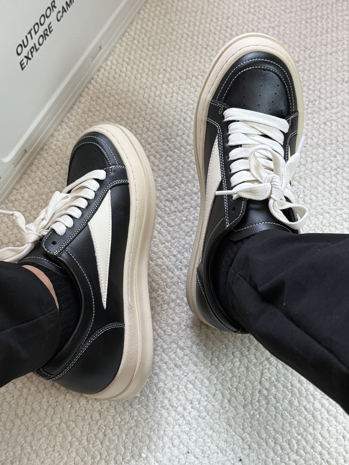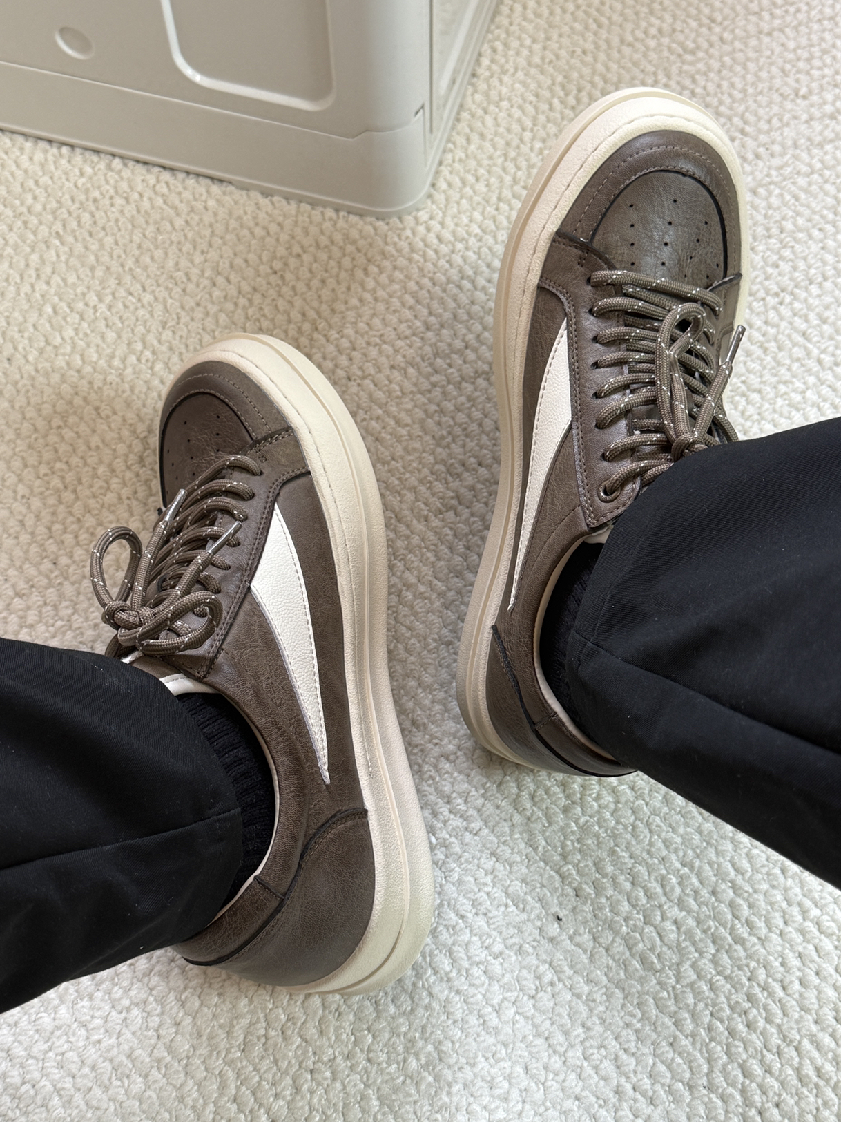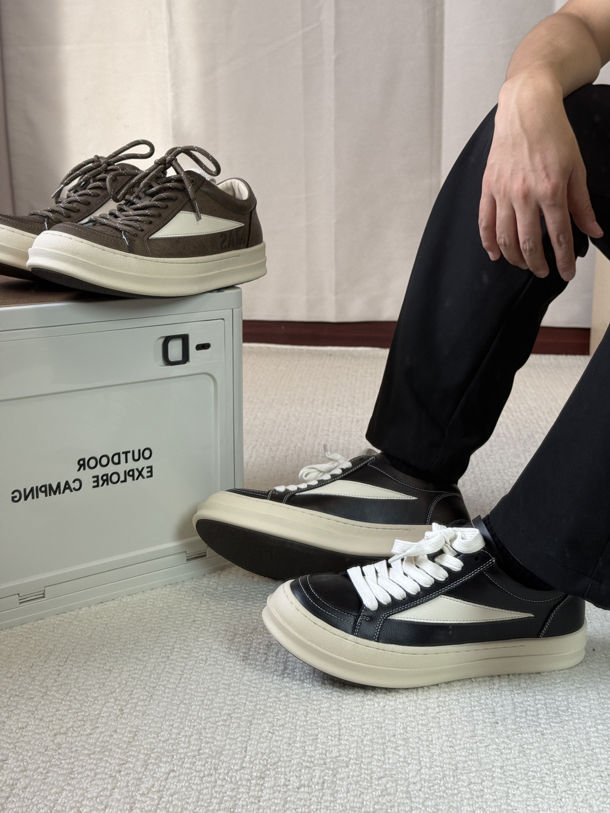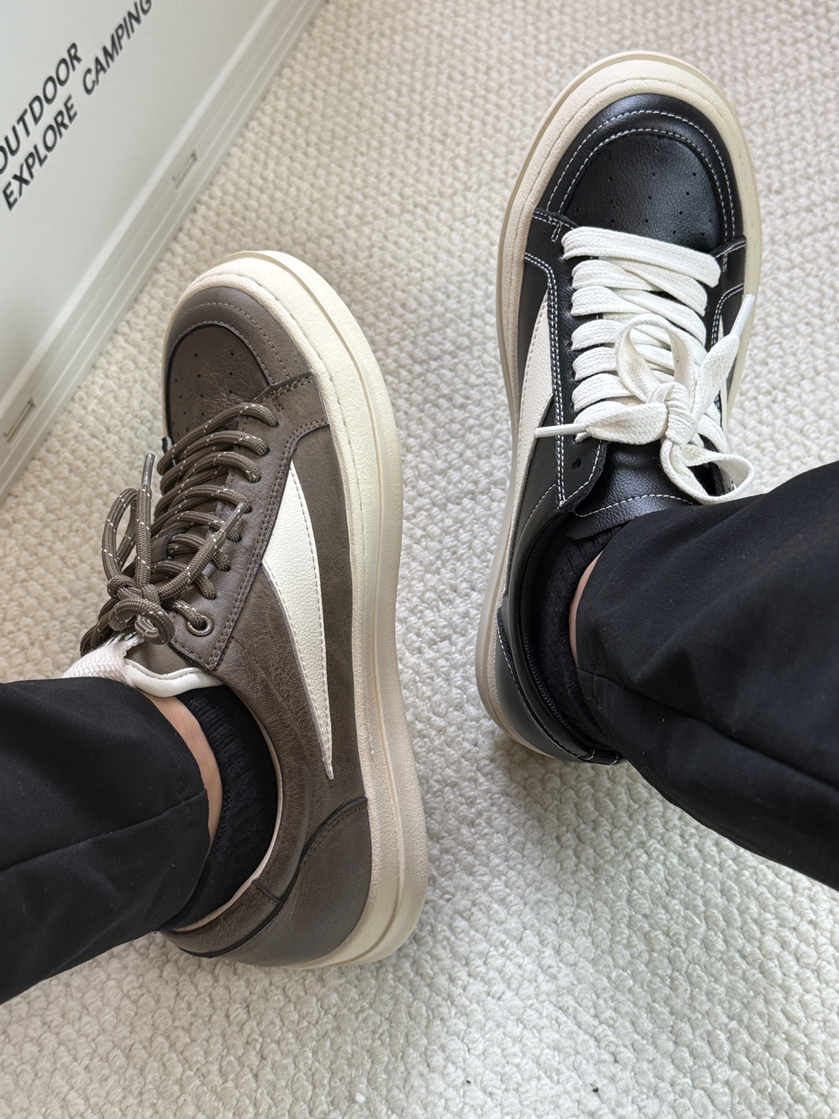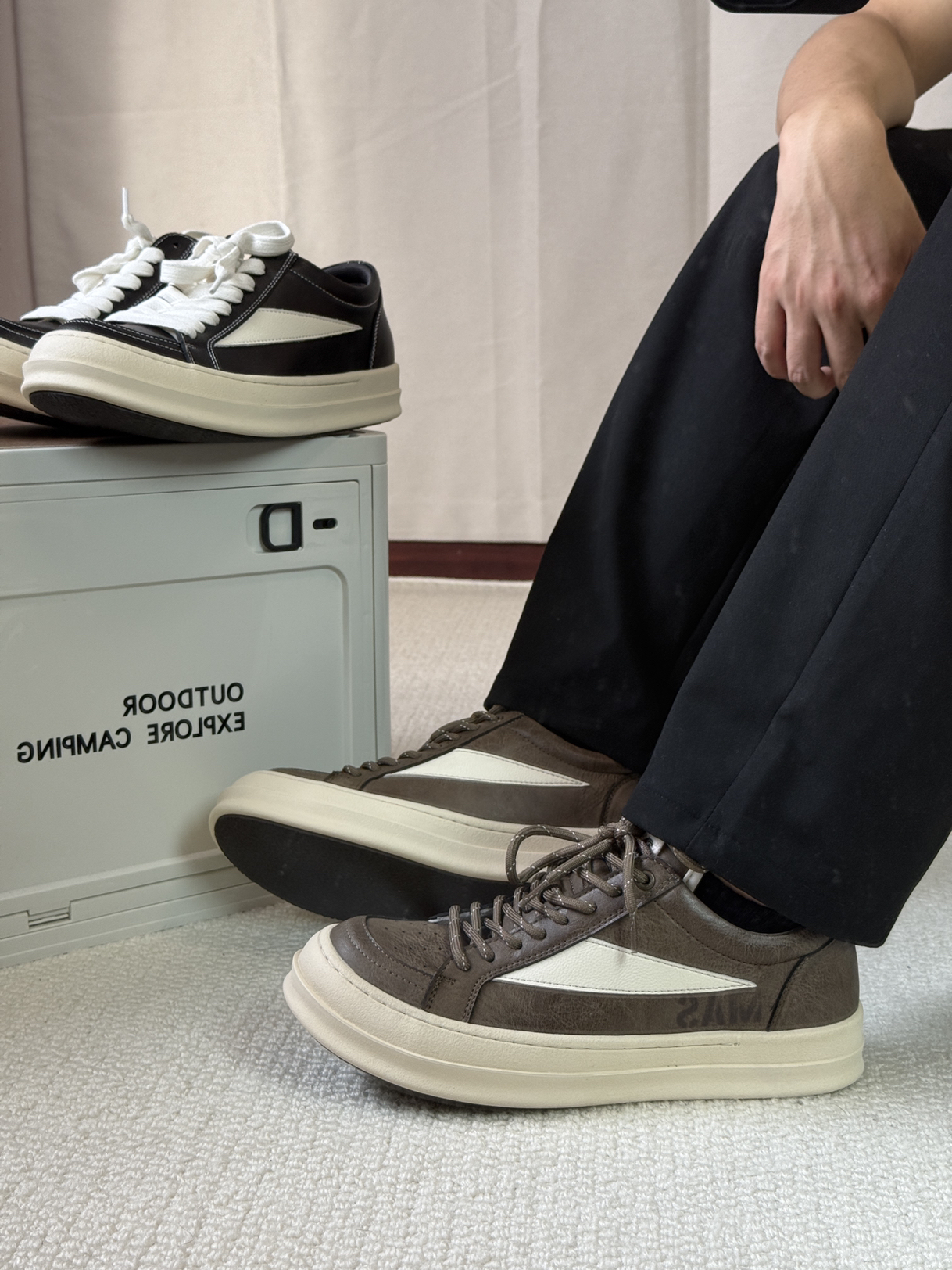 马登家的Ro板鞋还是帅啊,全鞋子都采用的牛皮革制作,鞋面整体硬朗帅气,鞋底微微上翘,整体上脚鞋型立体,帅就完了。而且这两个配色都很好看,不管是搭配休闲裤还是牛仔裤都特别帅,而且方便好打理。今年秋冬帅气的板鞋就他了!