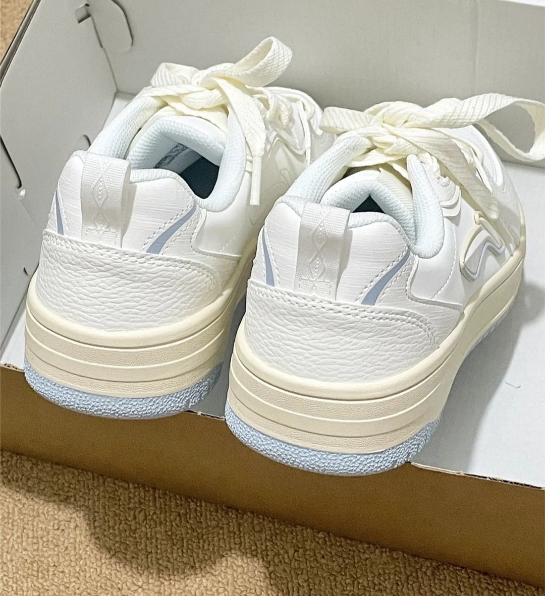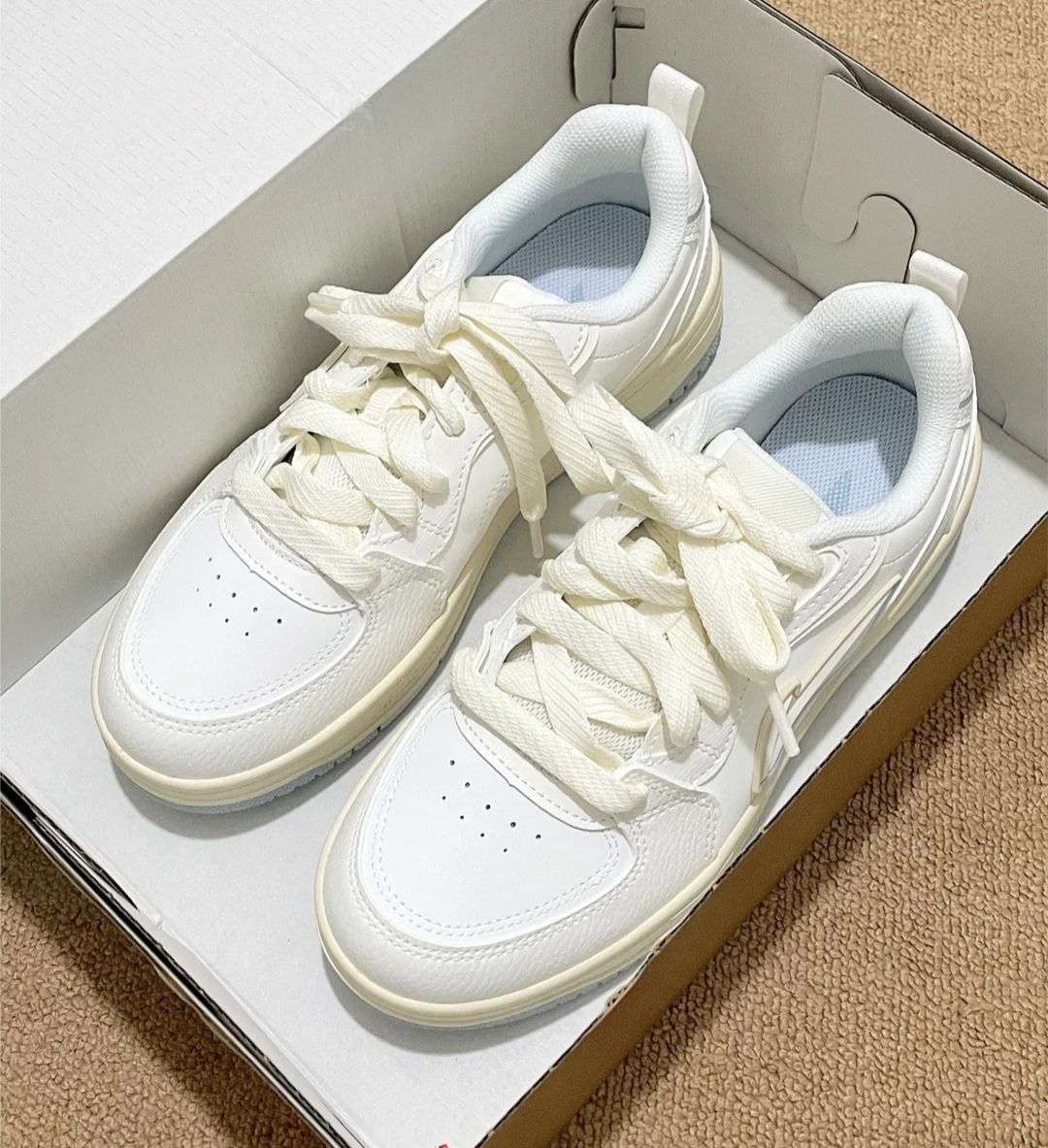 它的米白配色很百搭,日常穿牛仔裤、裙子都能搭。但白色鞋面特别容易脏,稍微蹭一下就有痕迹,得经常打理。 脚感方面,平时上班走路十几分钟还可以,要是逛个街走久了,会觉得鞋底有点硬,脚后跟不太舒服。 尺码我选的正常码,穿着刚好,但鞋型有点偏瘦,脚宽的朋友可能会觉得挤脚。 整体来说,作为日常随便穿的平价板鞋是合格的,但若追求舒适度和耐脏性,就得好好考虑了~