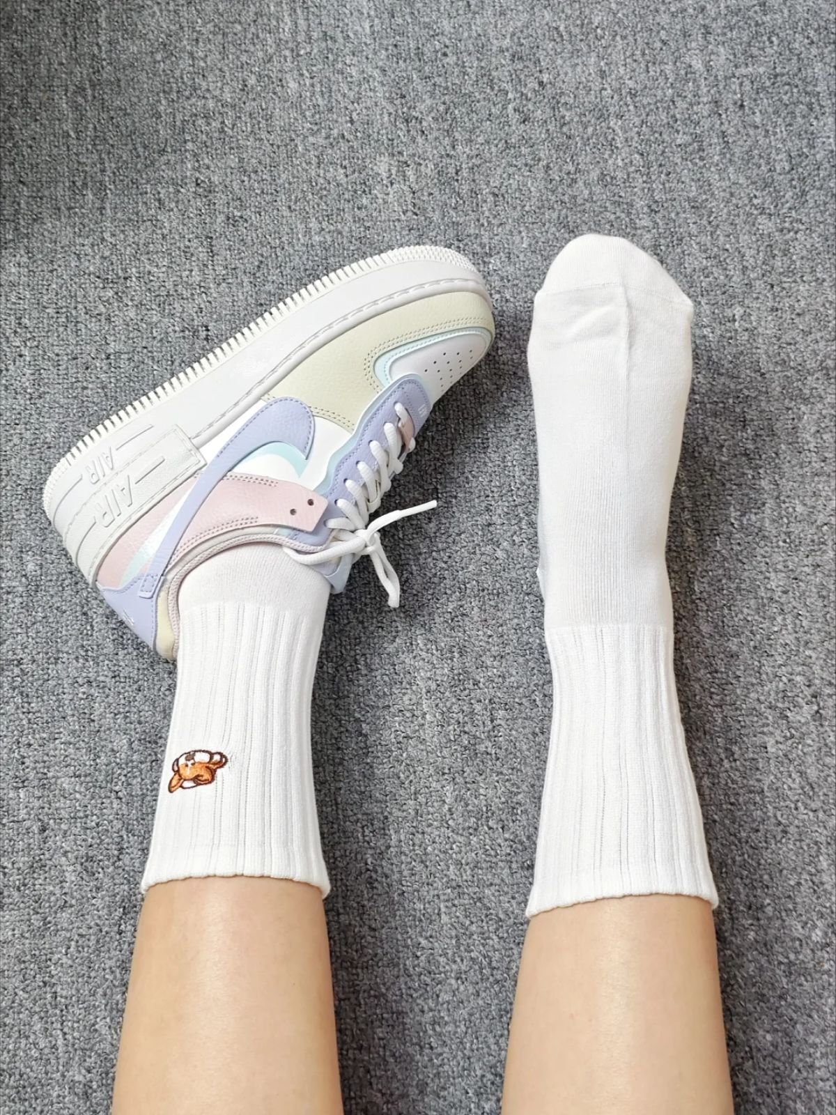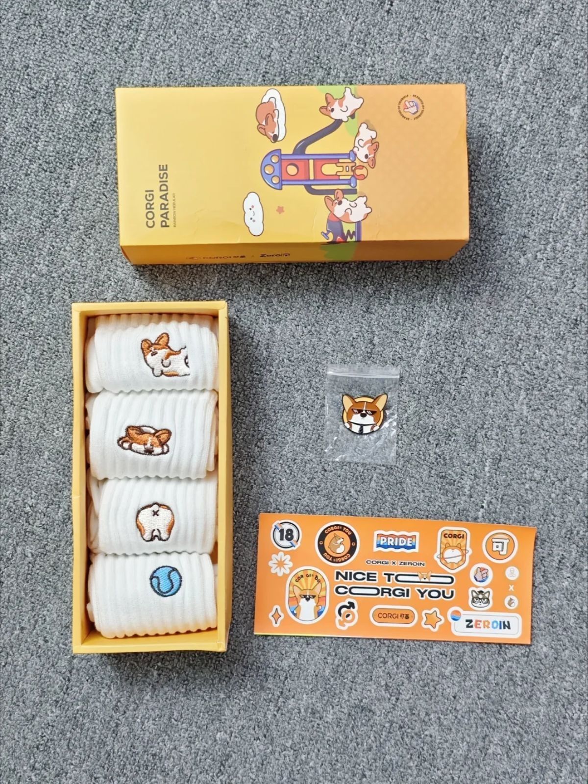 是#佐印ZEROIN 家的中筒袜礼盒 一盒里有四双可以换着穿 我好喜欢上面呆萌的柯基刺绣 穿上松紧刚刚好 软软糯糯的 纯色我也不用愁搭配啦 袜子触感厚实 秋冬天穿蛮不错!