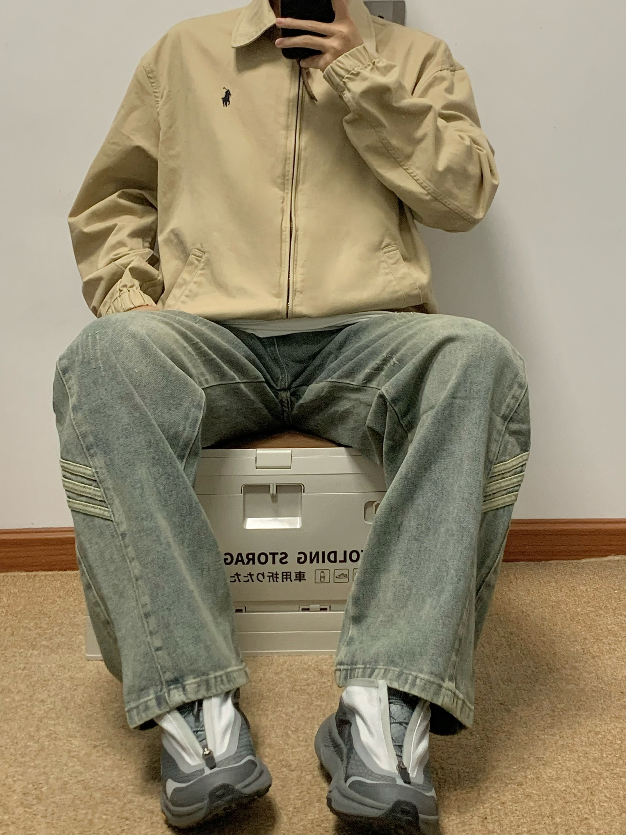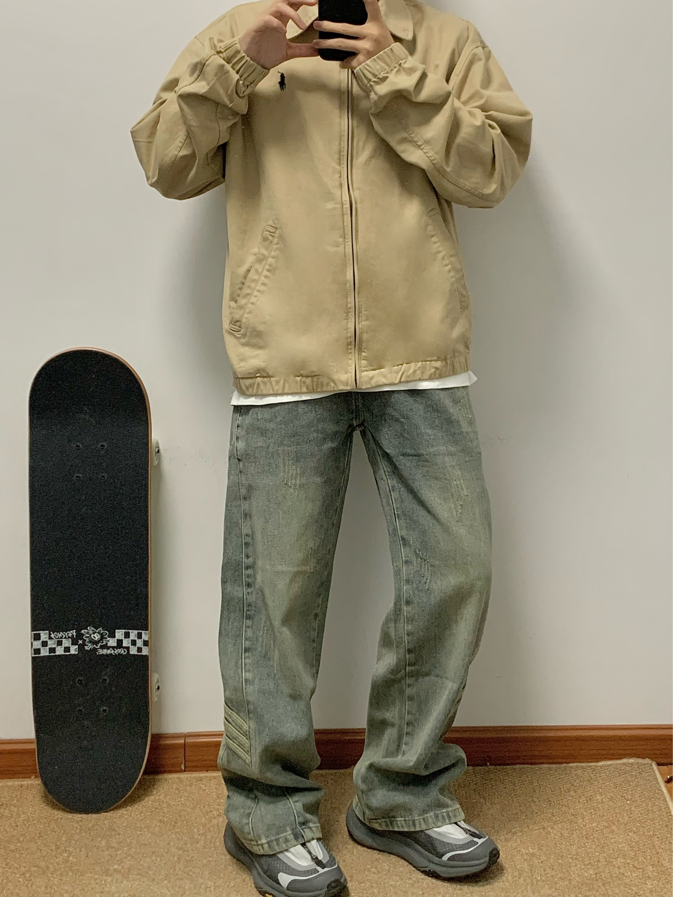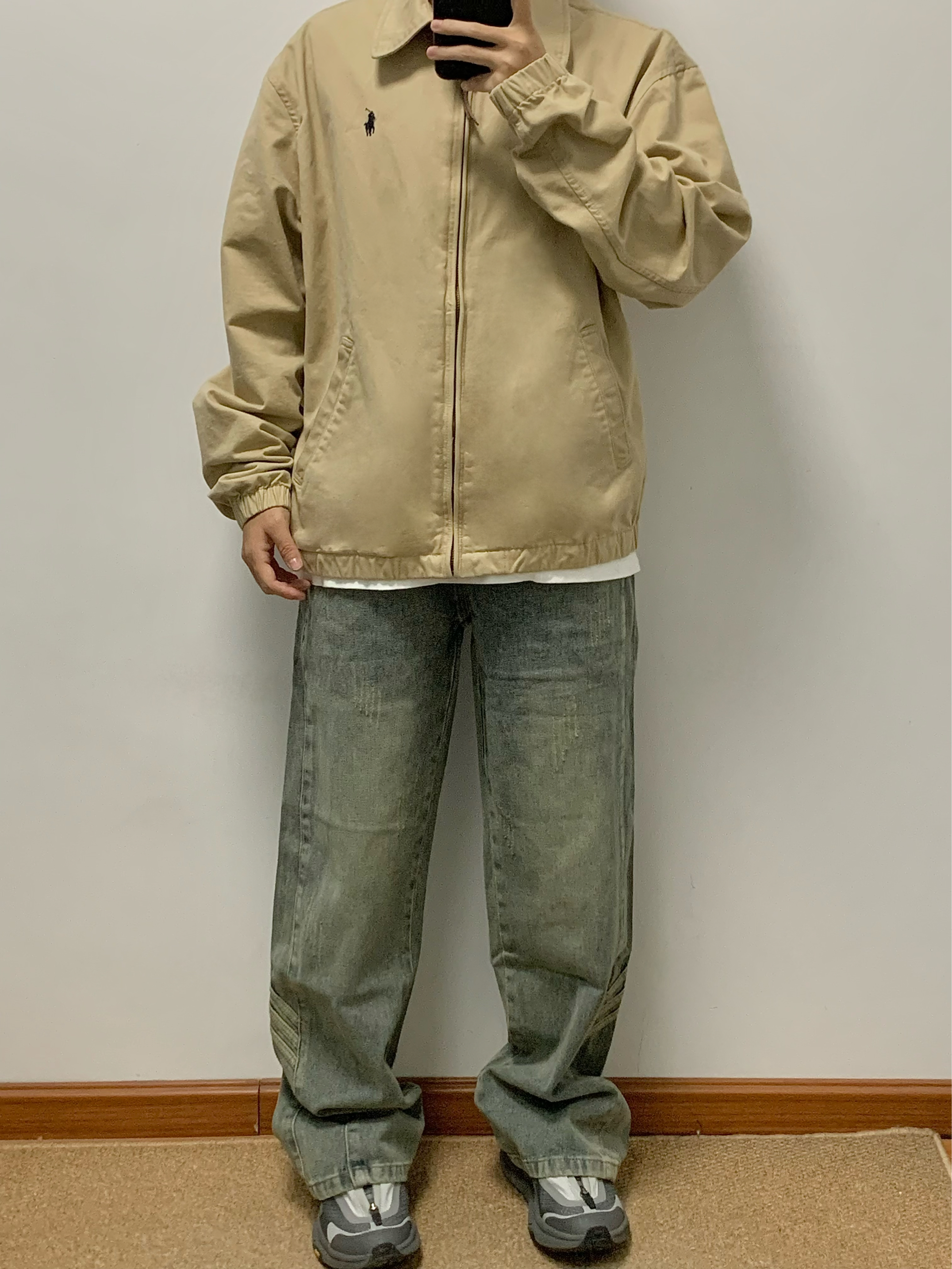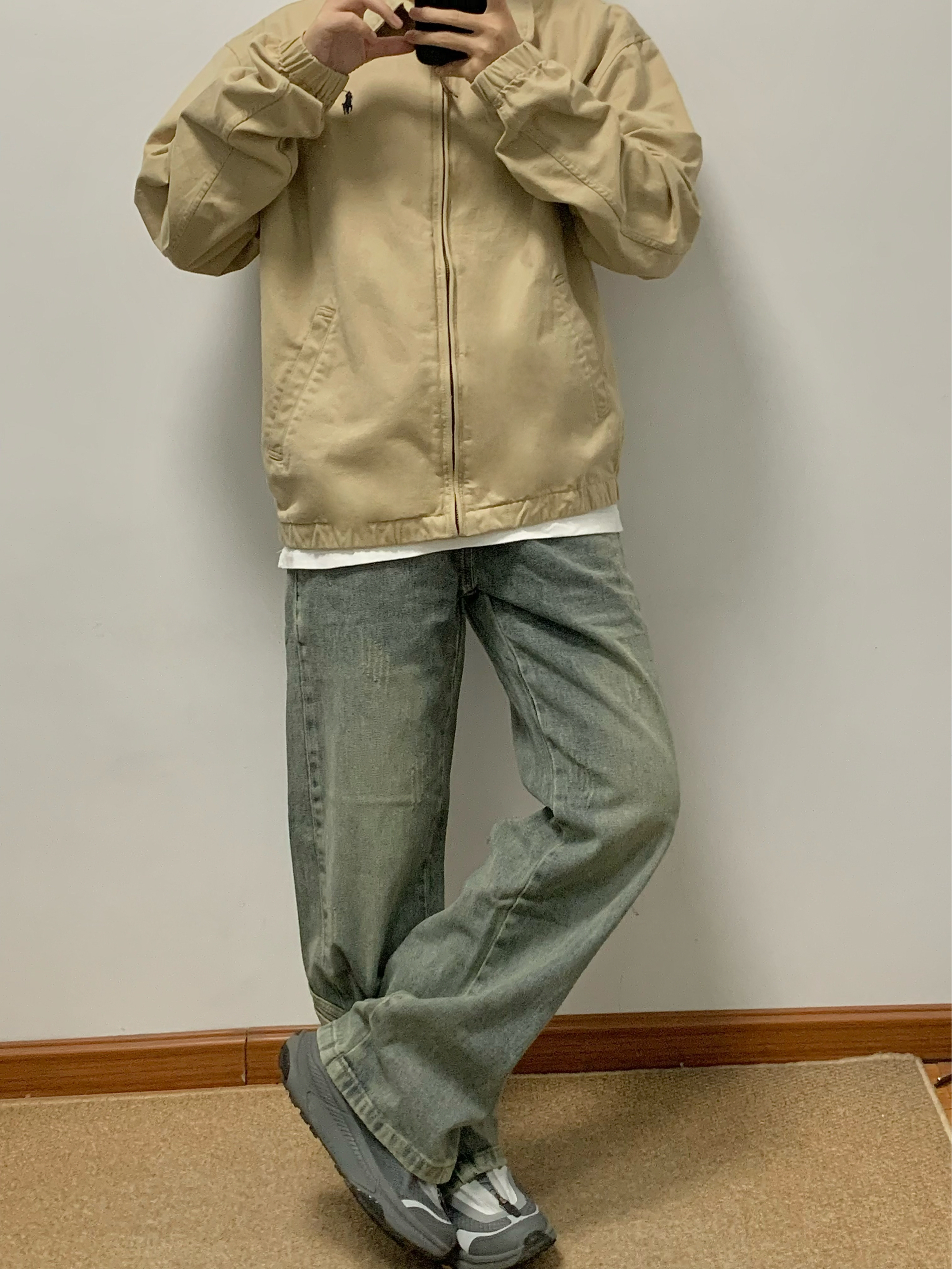 卡其色夹克搭配蓝色牛仔裤 松弛感拿捏 整体水洗磨白做旧效果 复古感十足 宽松直筒的版型 不挑身材 腰上抽绳设计 方便穿脱 国庆出游就穿这一身 包帅的! 👖:SZON