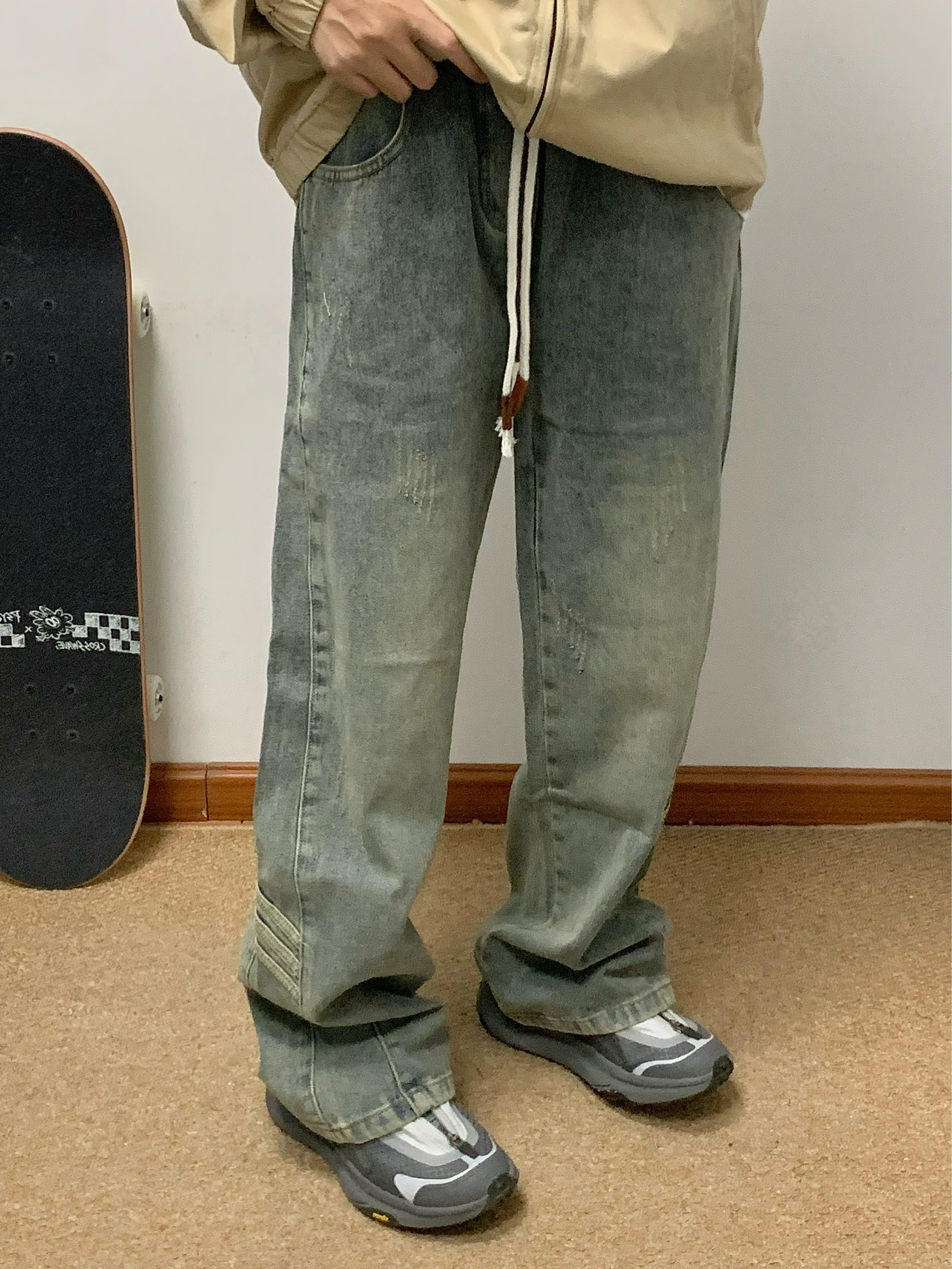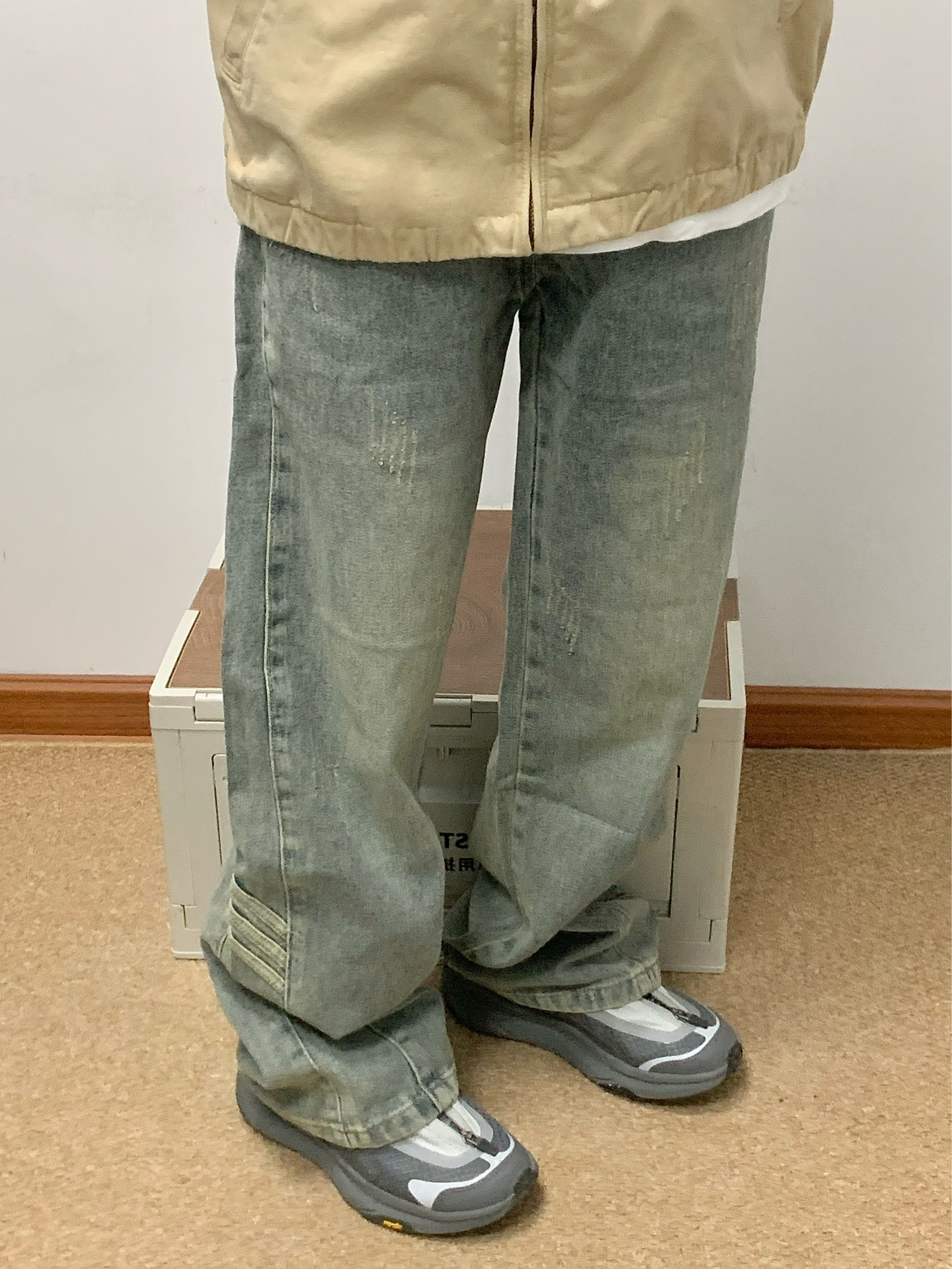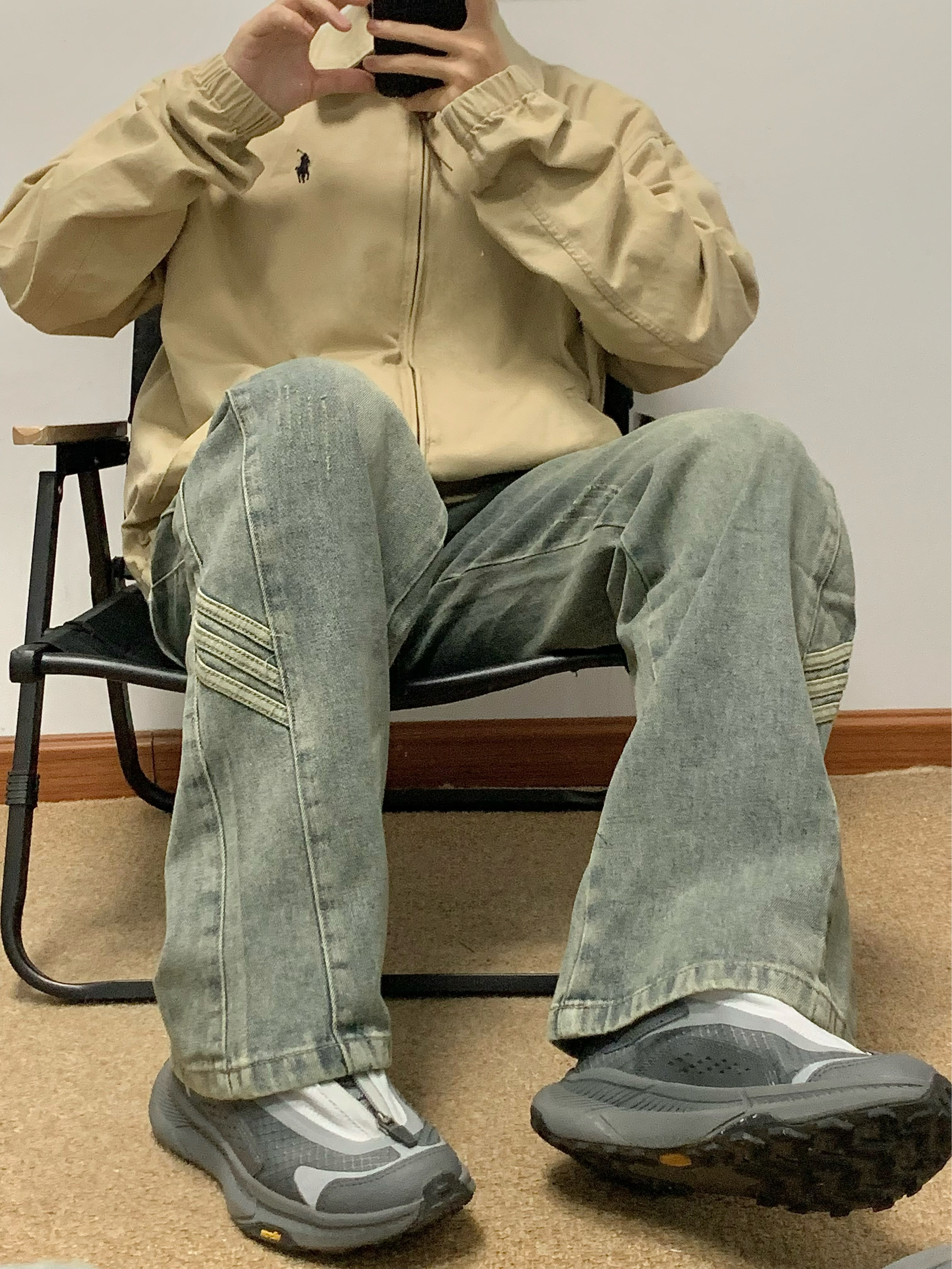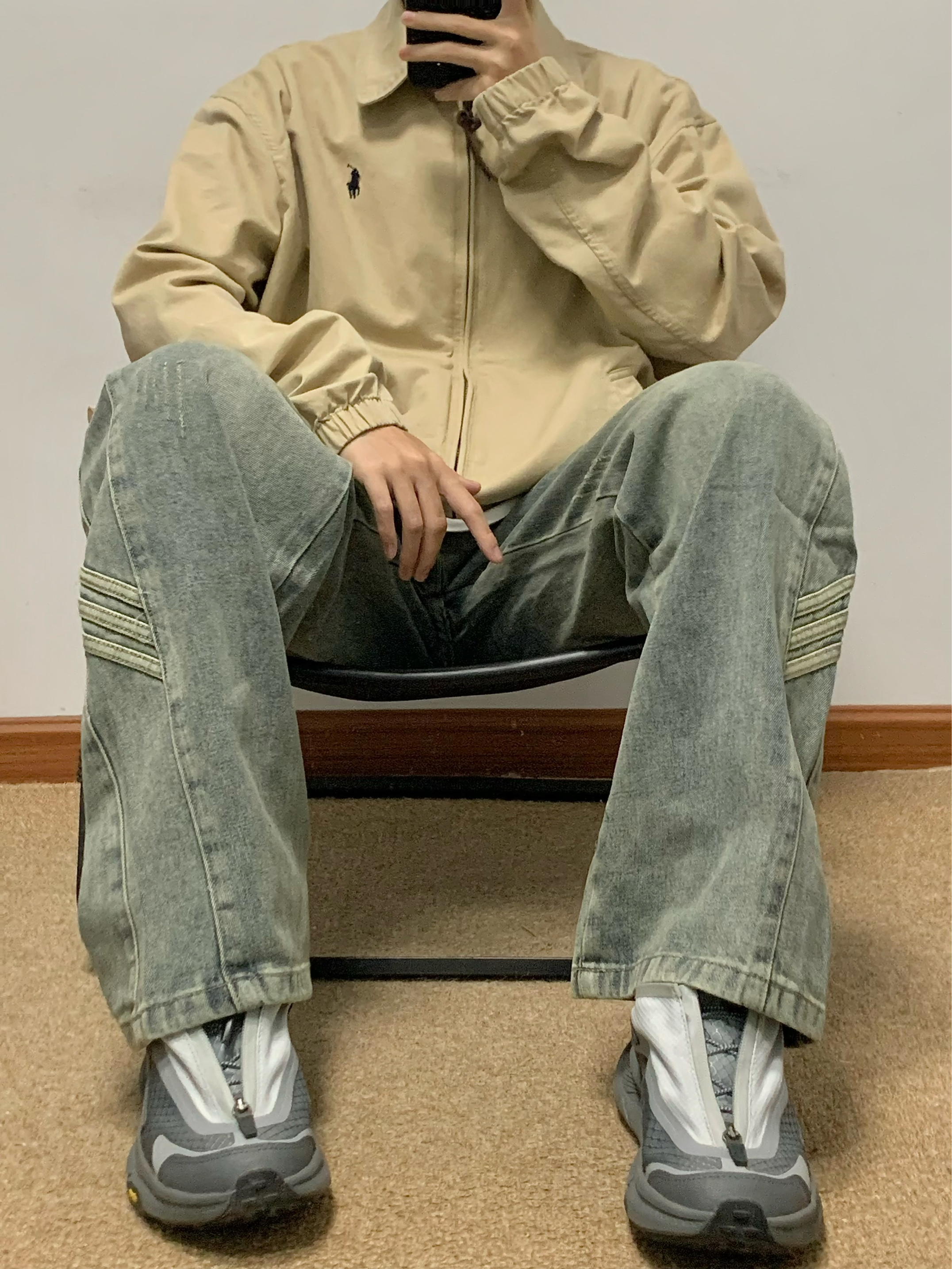 卡其色夹克搭配蓝色牛仔裤 松弛感拿捏 整体水洗磨白做旧效果 复古感十足 宽松直筒的版型 不挑身材 腰上抽绳设计 方便穿脱 国庆出游就穿这一身 包帅的! 👖:SZON