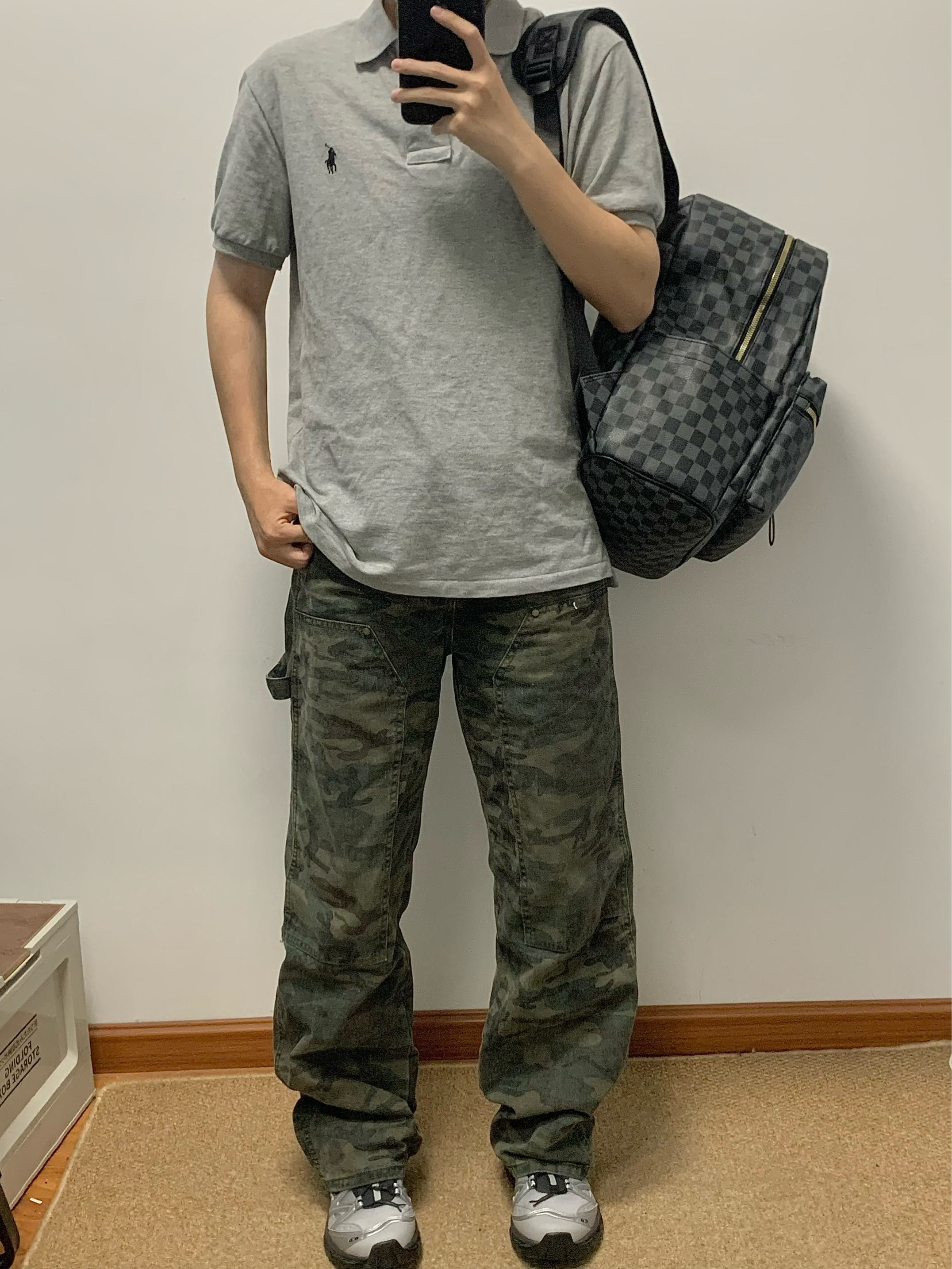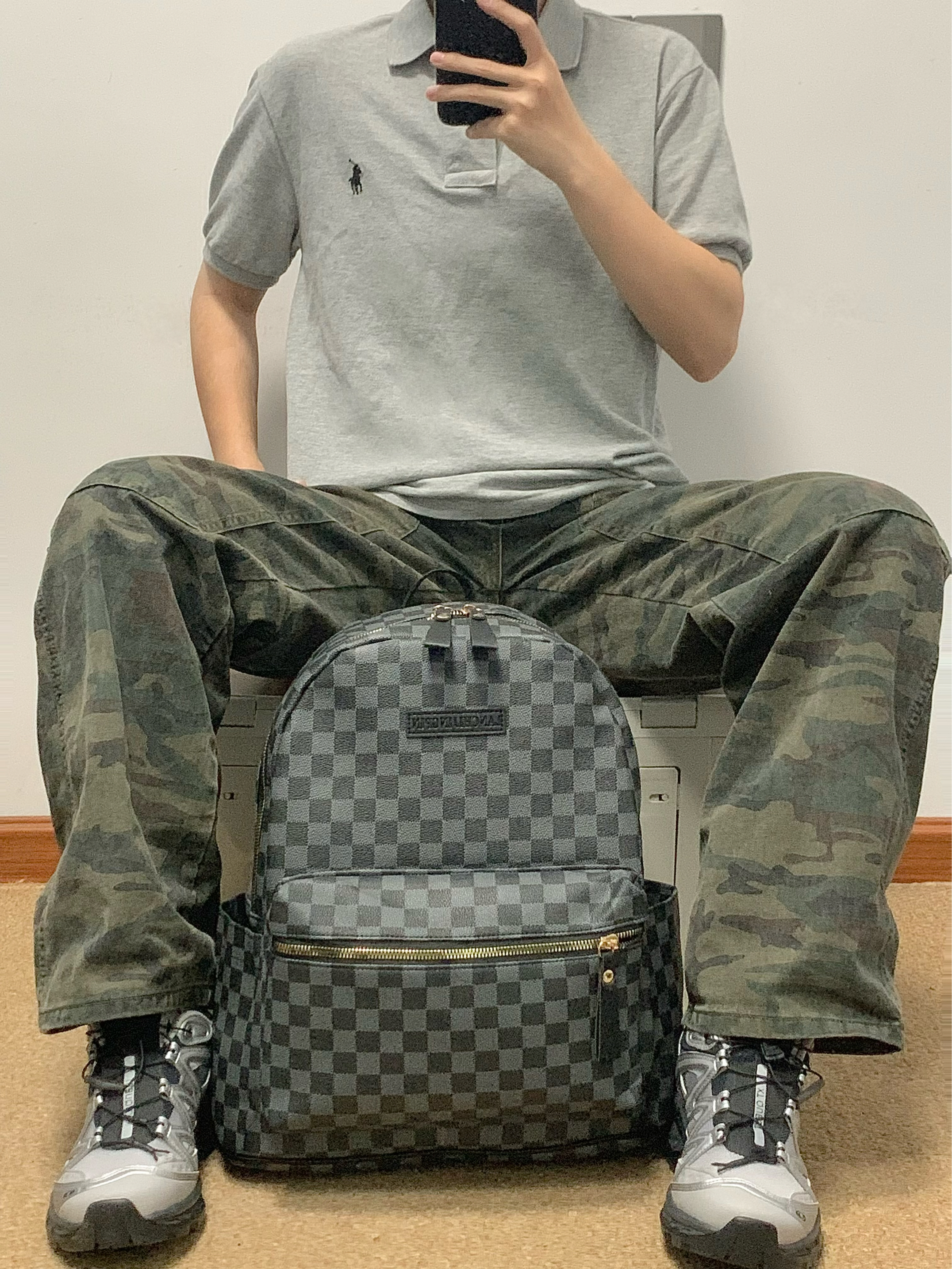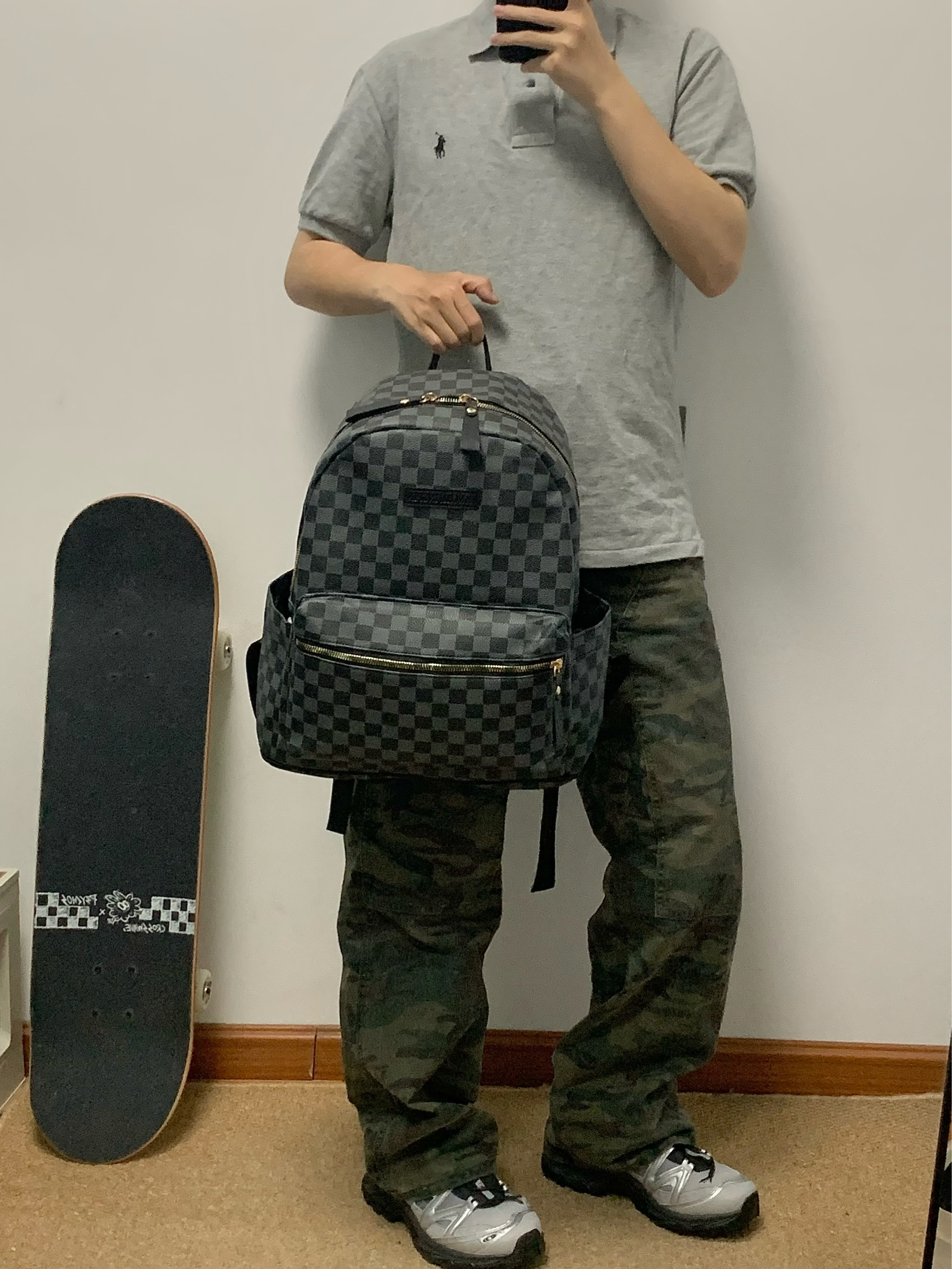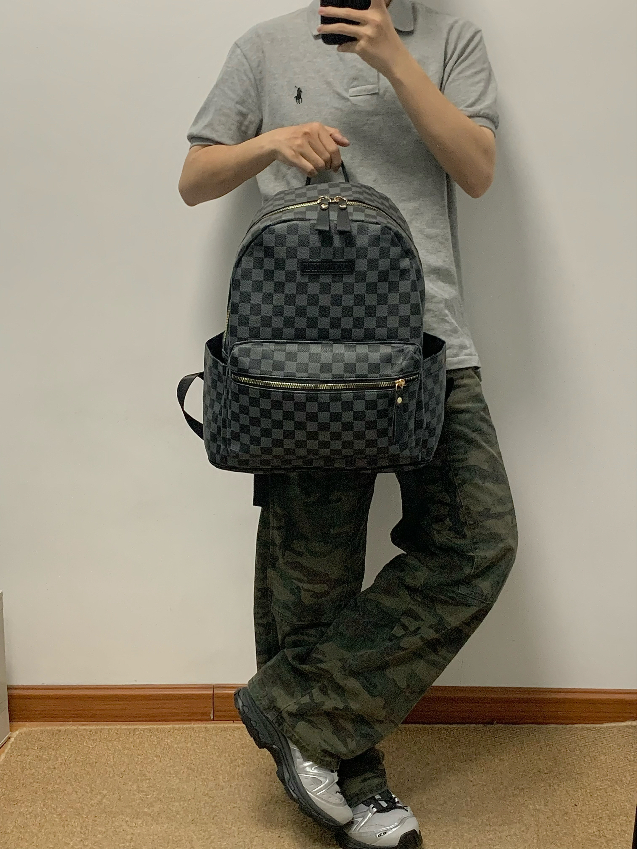 灰色polo➕迷彩色工装裤 再搭配上一个黑色双肩包 帅酷十足 整体方格满印设计 日常很百搭 上班通勤或者短途出游背它无压力 作为穿搭来说也是个不错的选择! 🎒:Bywhich