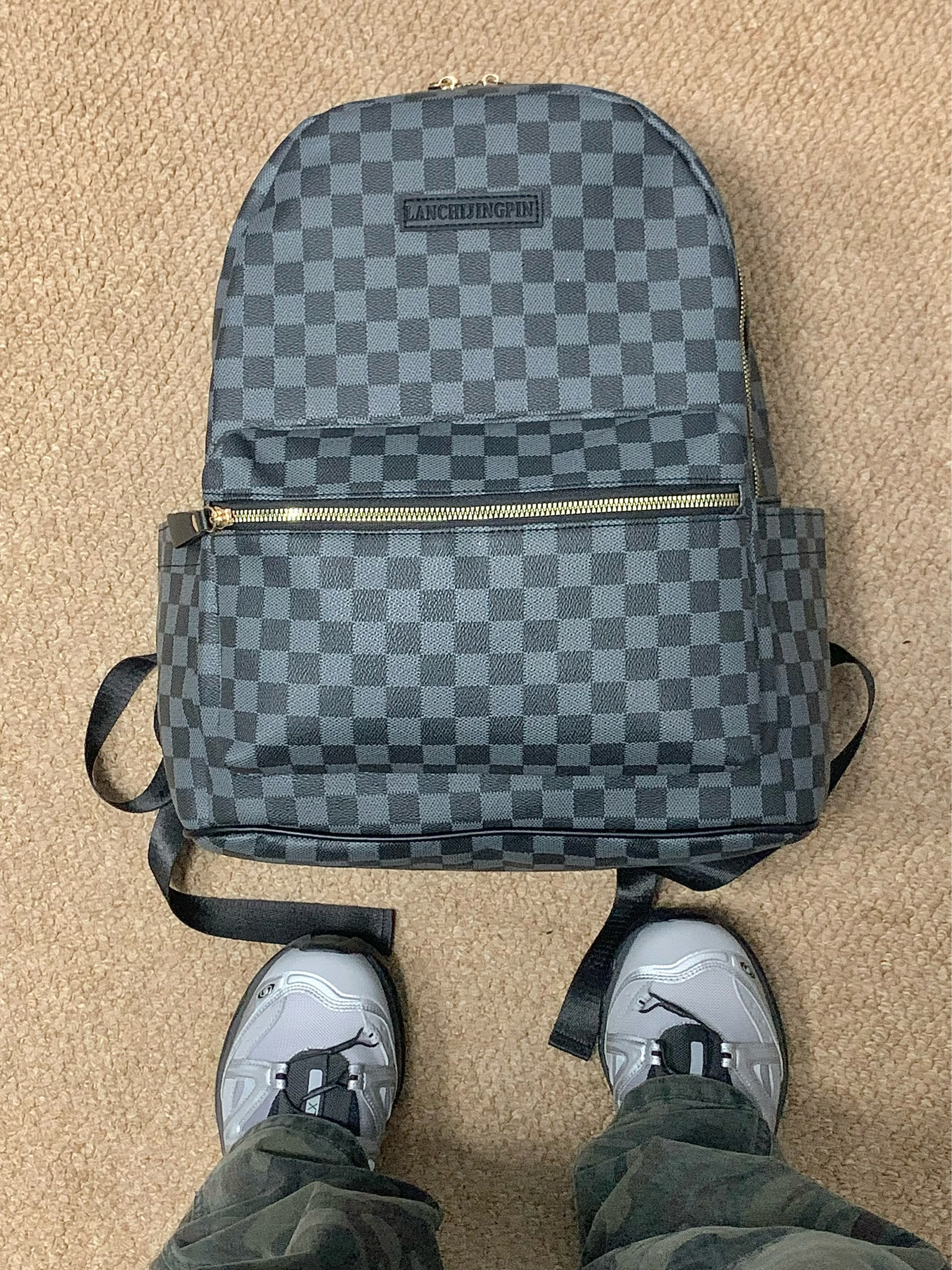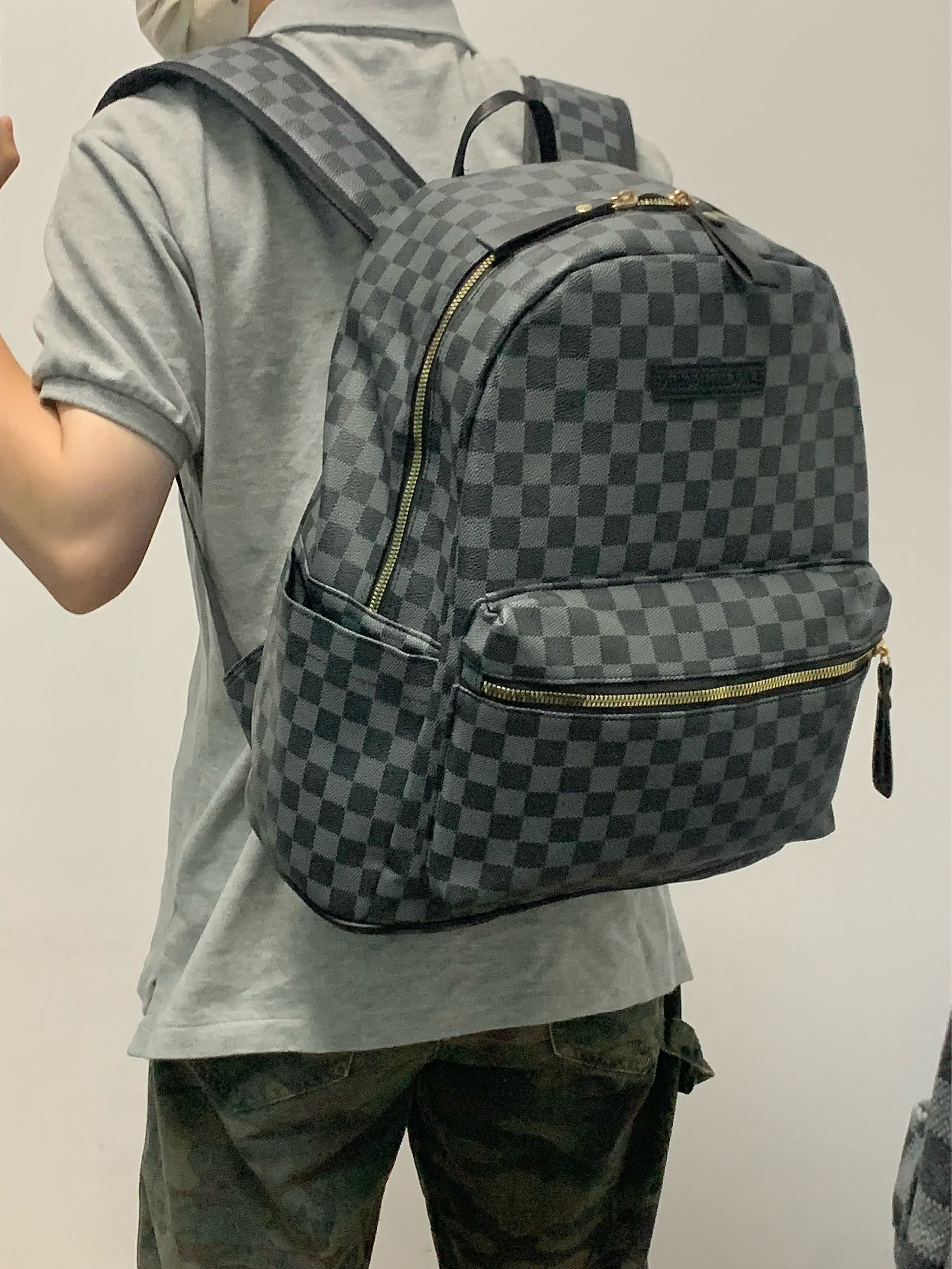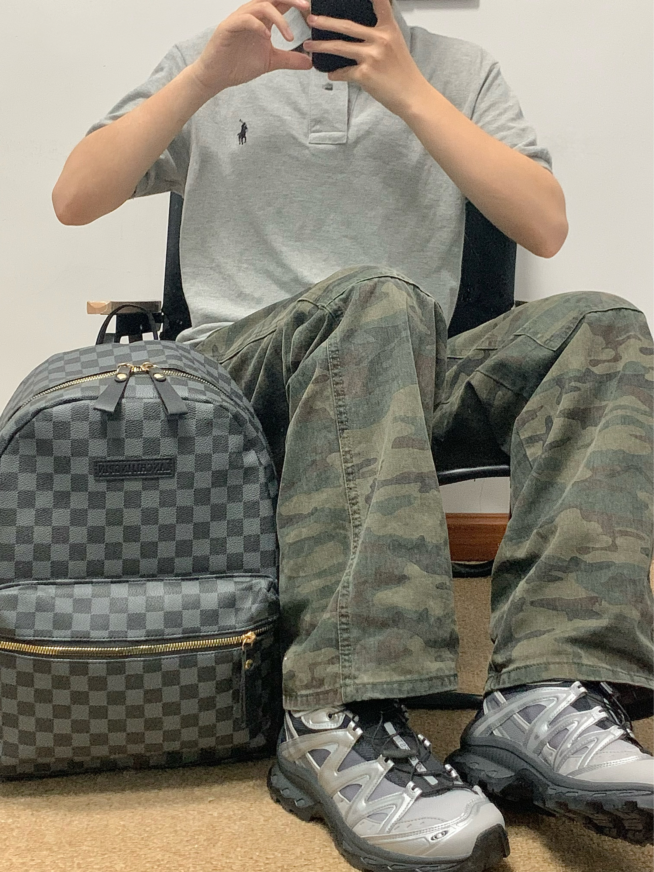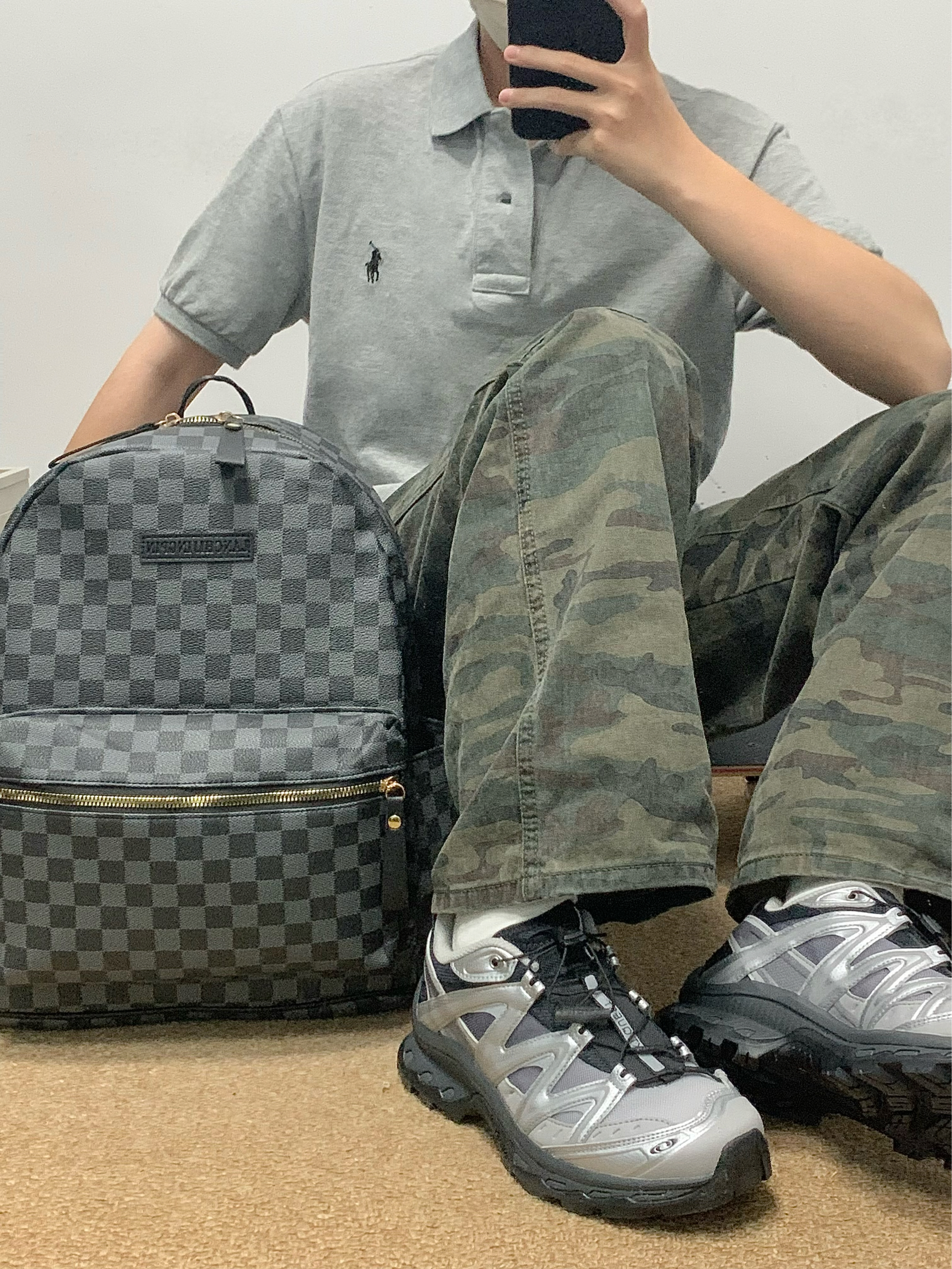 灰色polo➕迷彩色工装裤 再搭配上一个黑色双肩包 帅酷十足 整体方格满印设计 日常很百搭 上班通勤或者短途出游背它无压力 作为穿搭来说也是个不错的选择! 🎒:Bywhich