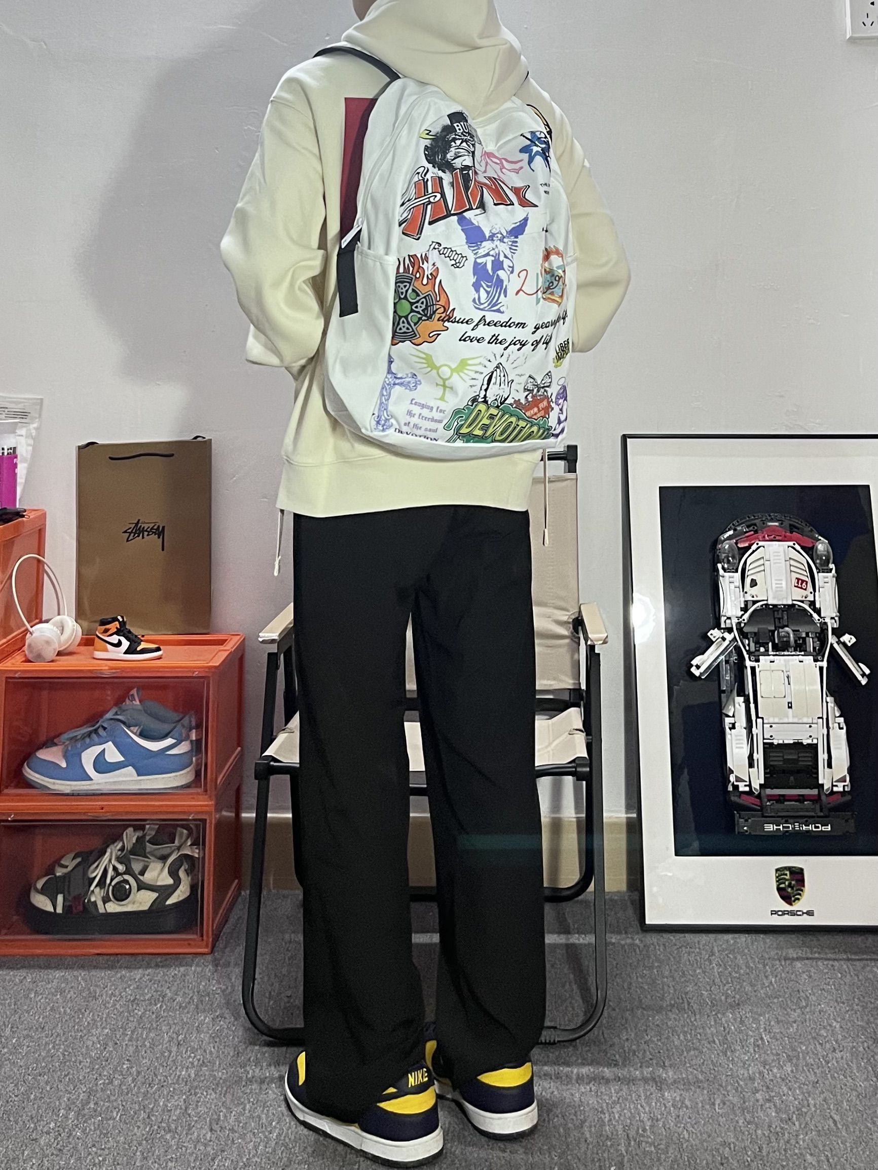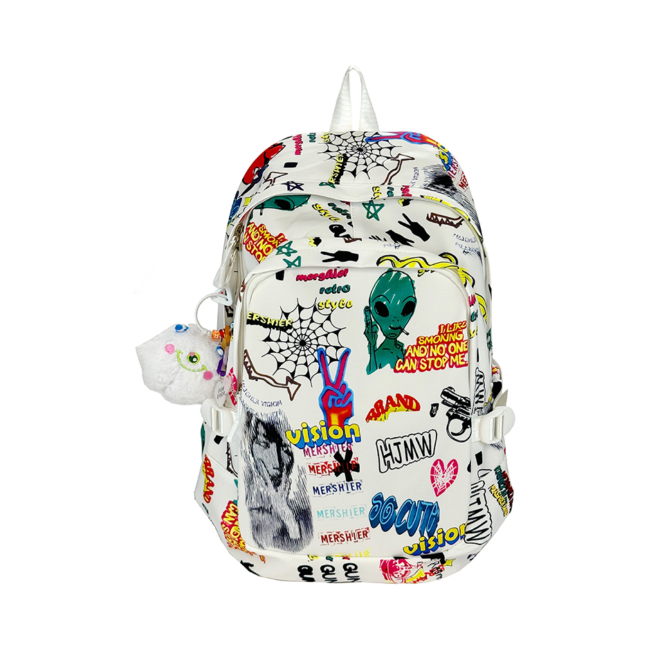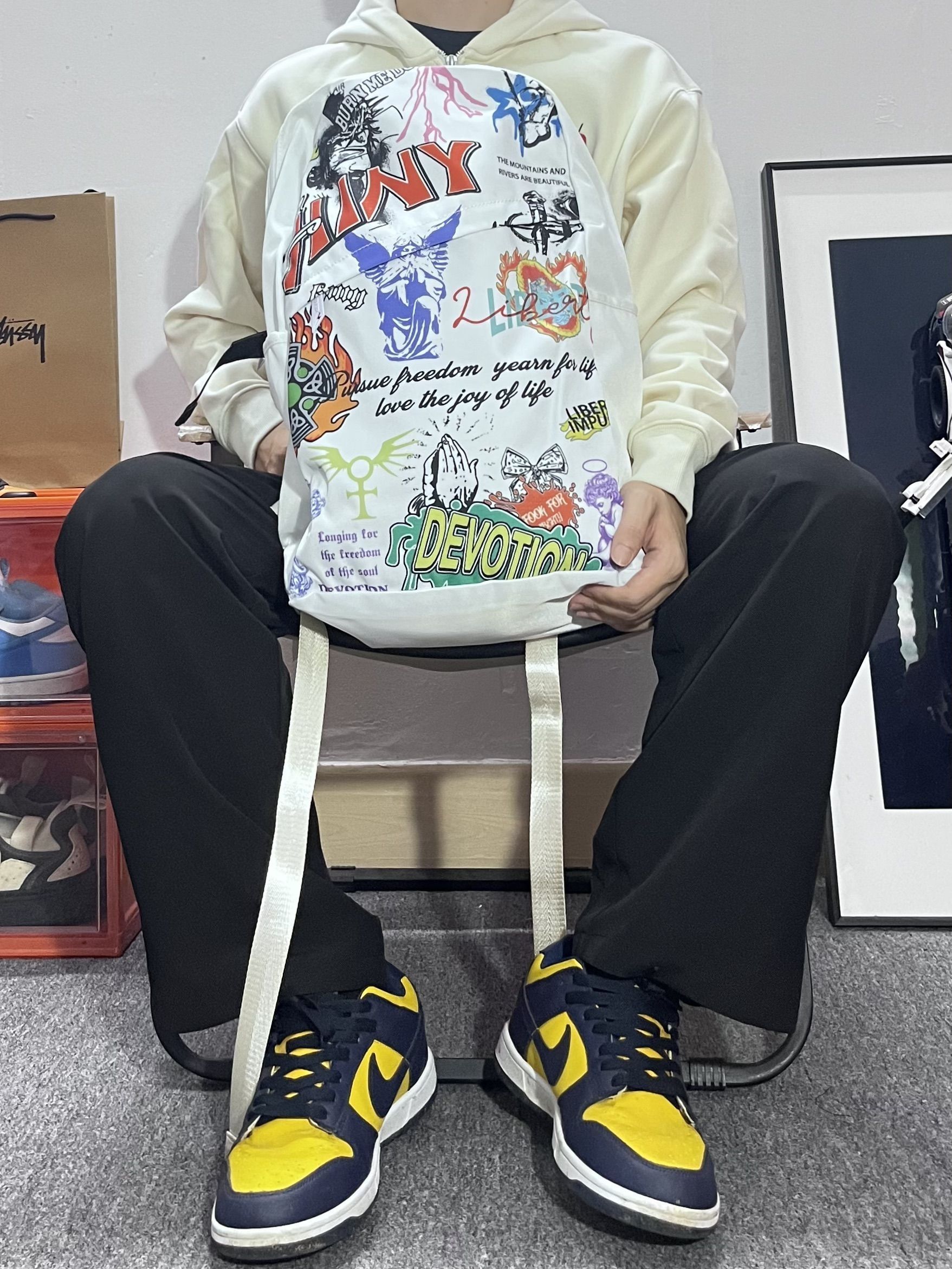 哈喽这里是pupu同鞋🏄🏻♂️ ——————————— . 🎒:HINY 美式街头涂鸦的印花吸睛好有特色 穿搭轻松搭配出美式街头的感觉 容量也很能装 早八通勤电脑也可以带上 · 👔:红炭 · 👖:有志者 · 👟:密歇根 ——————————— 💁🏻♂️:170/115 以上都是个人观点🍔欢迎讨论