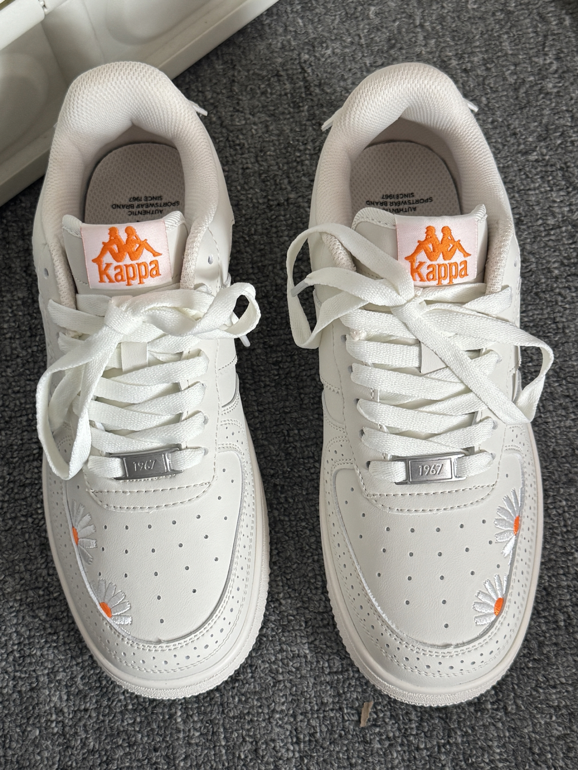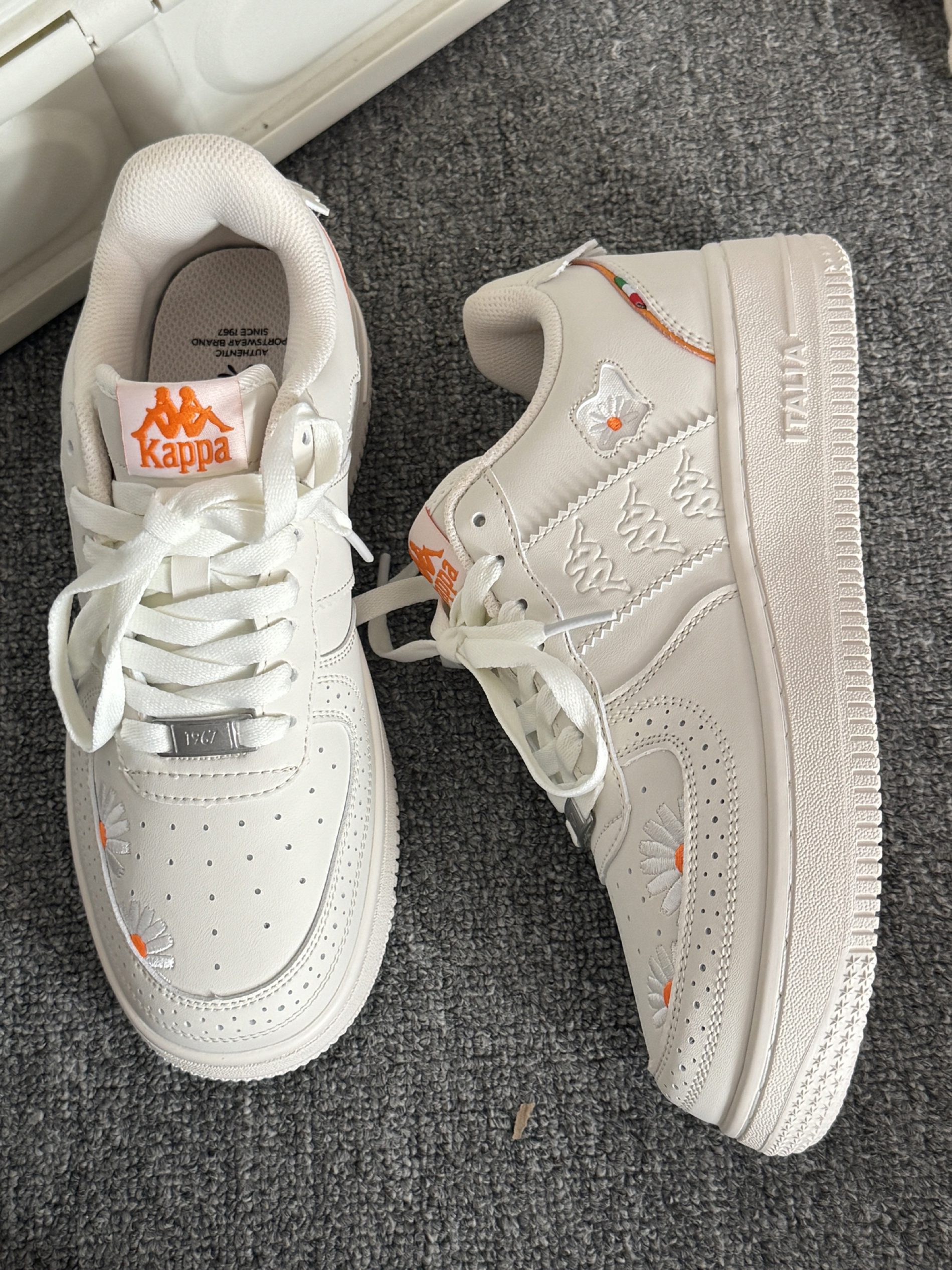 快看我的战靴小板鞋啊 米白色搭配刺绣雏菊吼吼看 我觉得这个配色也蛮适合秋天的 平时搭配裤子和裙子都hin有活力