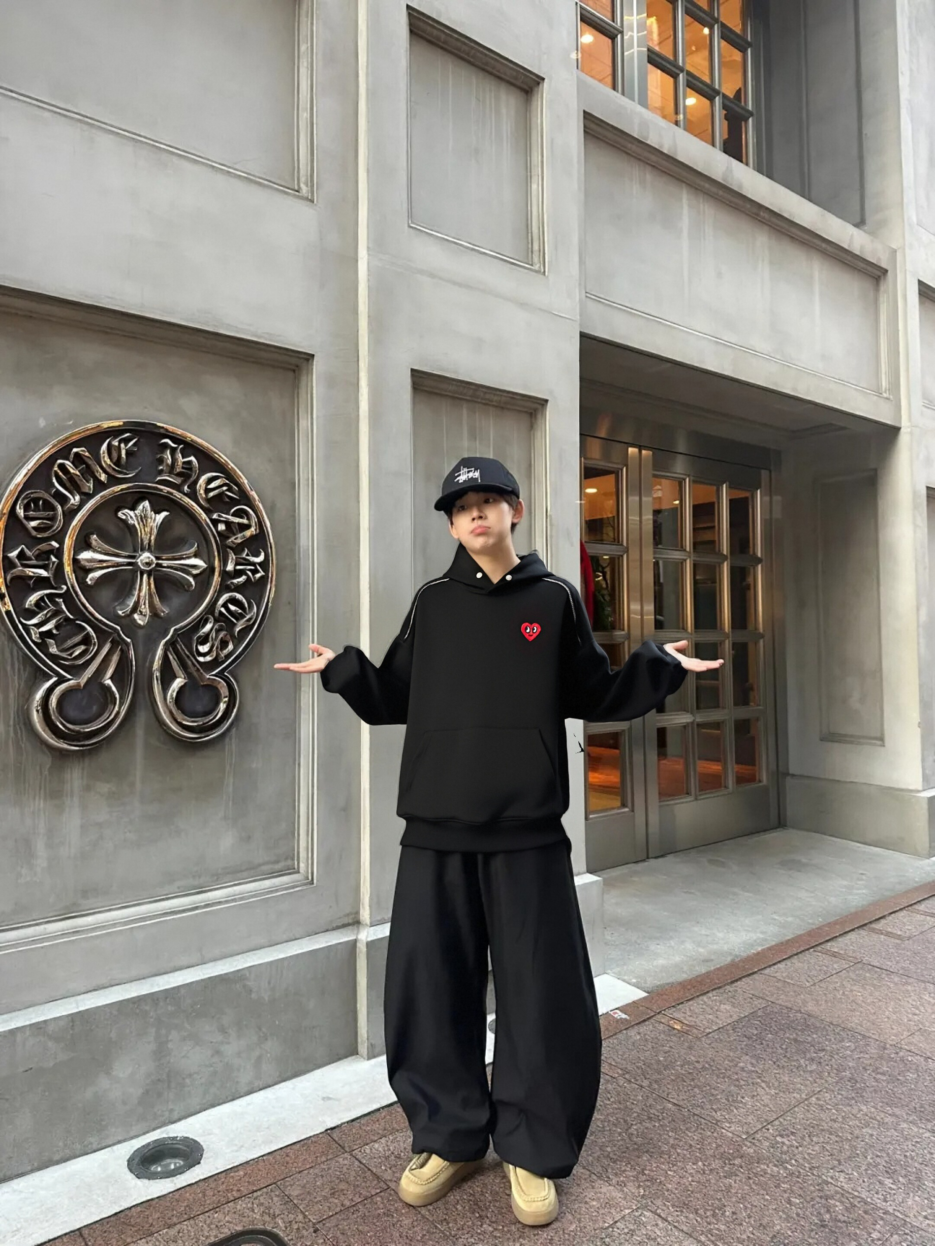 谁能拒绝这件自带高级感的黑色连帽卫衣啊!Charles Jiang's Happy Heart 的爱心刺绣太戳我了,设计感直接拉满~宽松的版型对各种身材都很友好,上身又帅又酷
