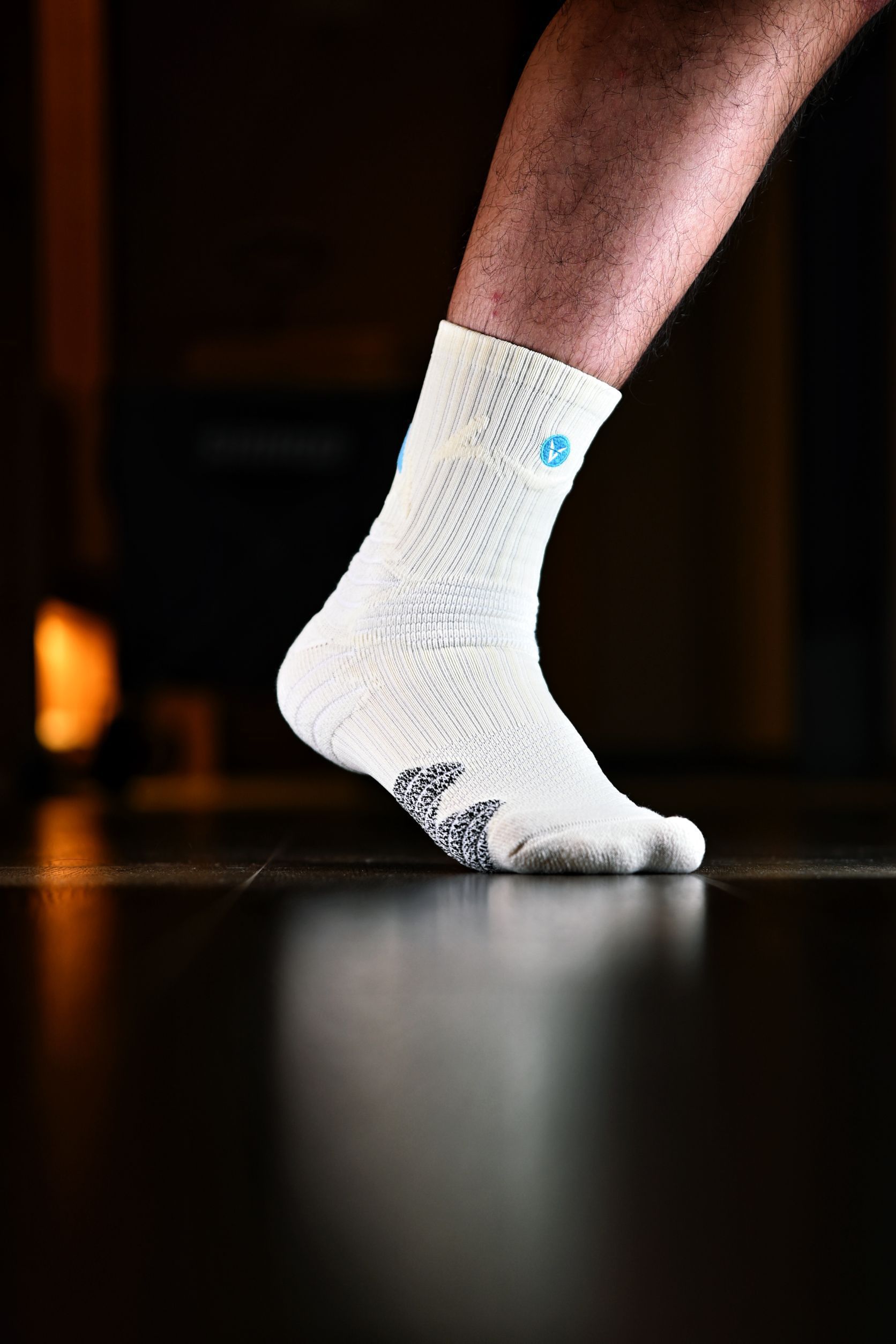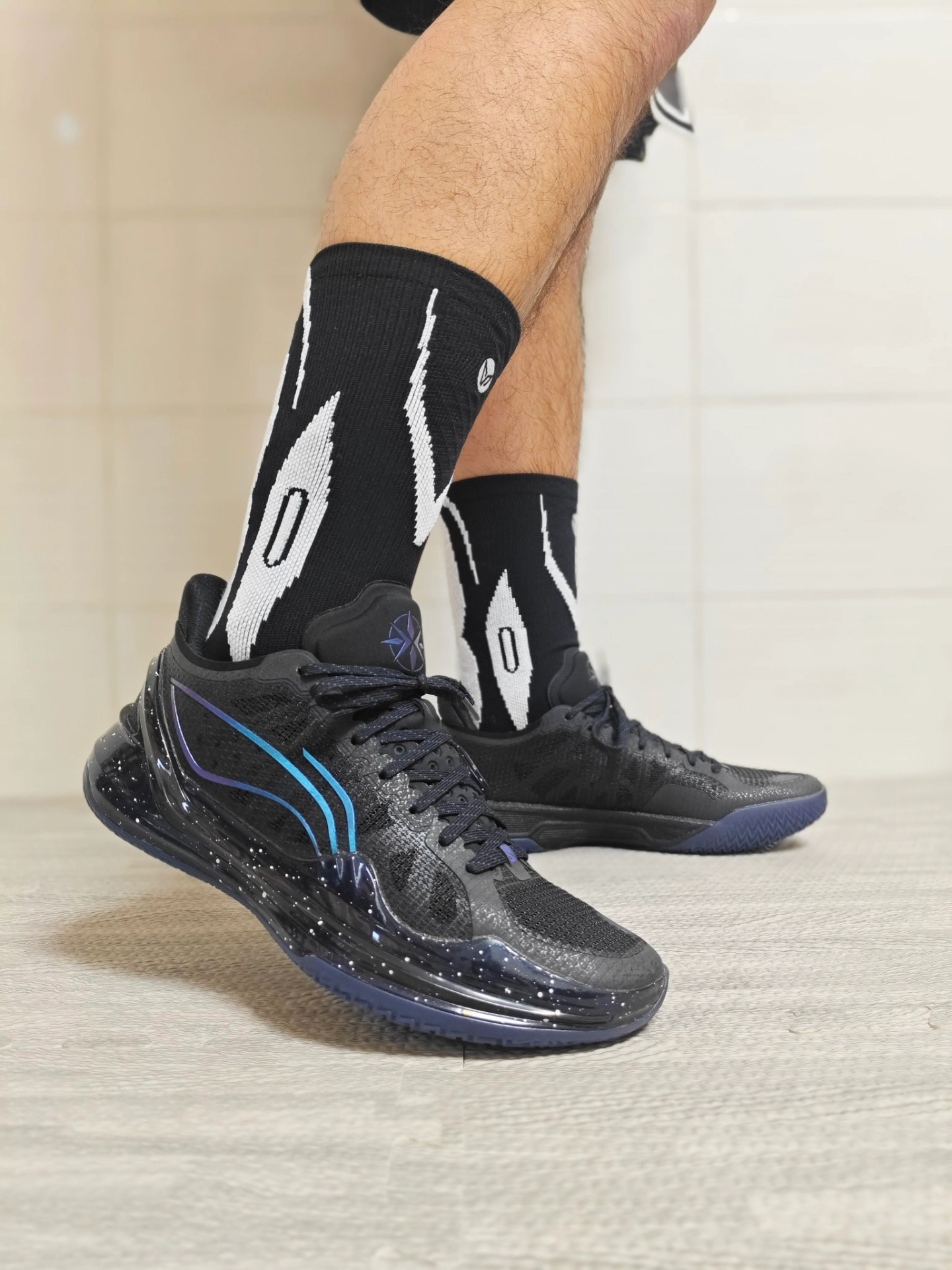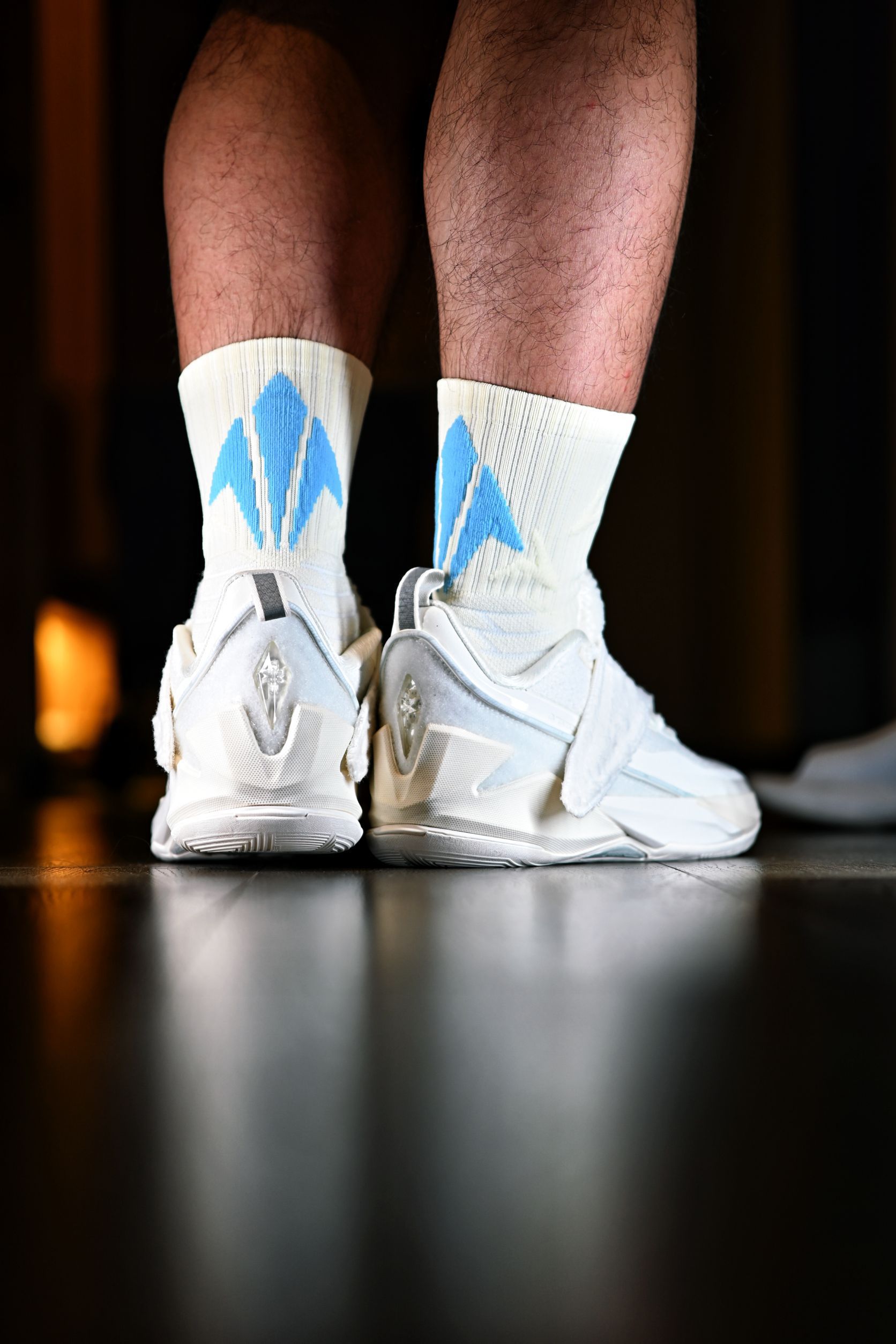 这次新入手的是维动家的这款离弦Pro 给我的第一印象就是颜值很高,特别是后跟的这个箭头标识,辨识度很高啊,整双袜子也做了分区的防护处理,脚背处也有大面积的透气网纱,打了几场球下来也很干爽 连脚踝处也有专门的保护处理,维动的这些细节还是做的很到位的