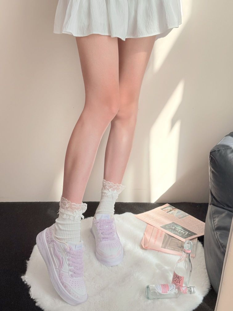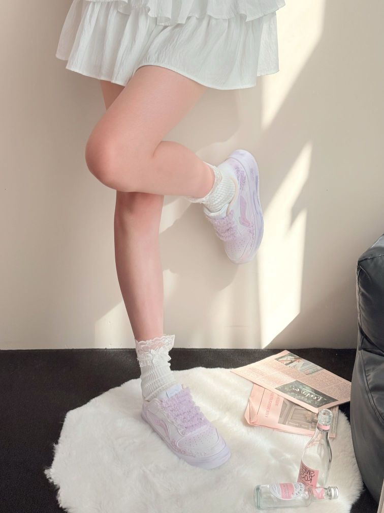 《云端漫步的少女心》 👟LiNing李宁 浮舟 薰衣草田 少女感潮流百搭 纯白鞋身晕染着梦幻紫调,仿佛将晚霞揉进了鞋边。毛绒鞋带轻覆鞋身,像踩在蓬松的棉花糖上,每一步都陷进温柔里。蕾丝袜边与百褶裙的碰撞,把少女的细腻心事都藏进这双会呼吸的鞋里,走在云朵上,连风都变得甜软。