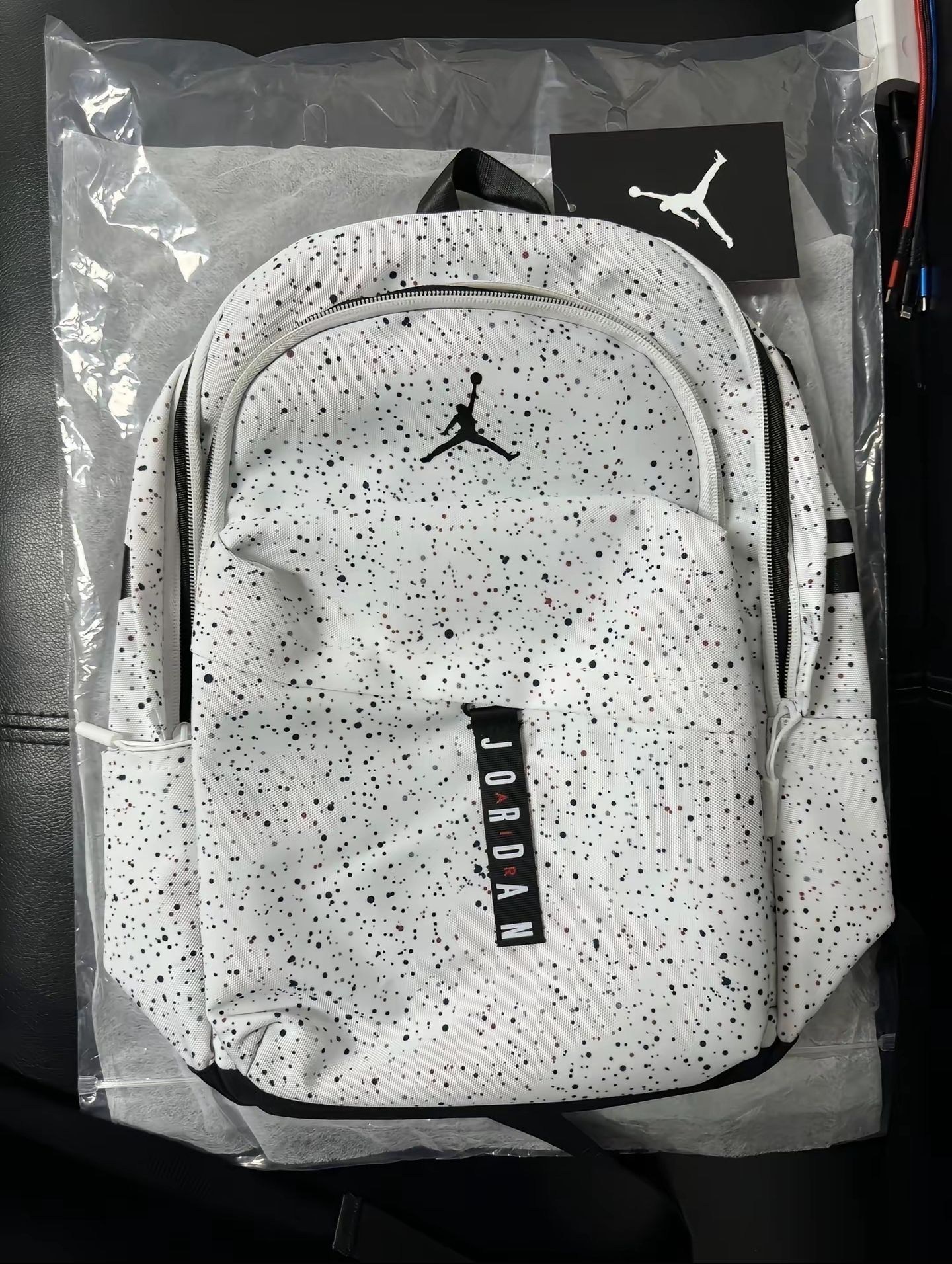 这是一款Jordan品牌的双肩包,以白色为基底,布满像素风的彩色图案,包括飞人标志、爱心、钻石、星星等元素,时尚又具童趣。包身有黑色飞人logo,还搭配了个性挂件,风格潮流,适合追求街头风、喜爱运动休闲风格的年轻人日常出行或校园使用。