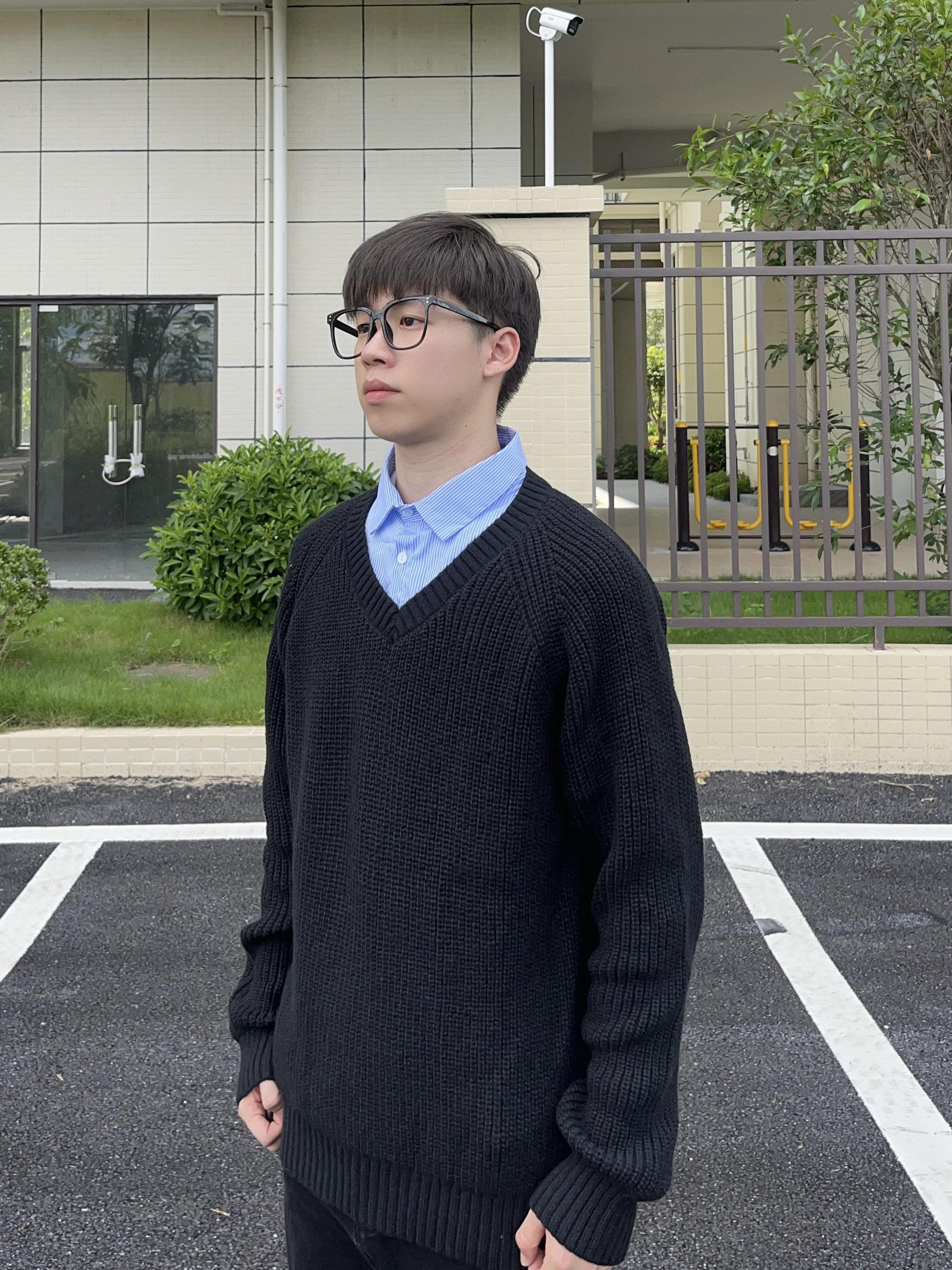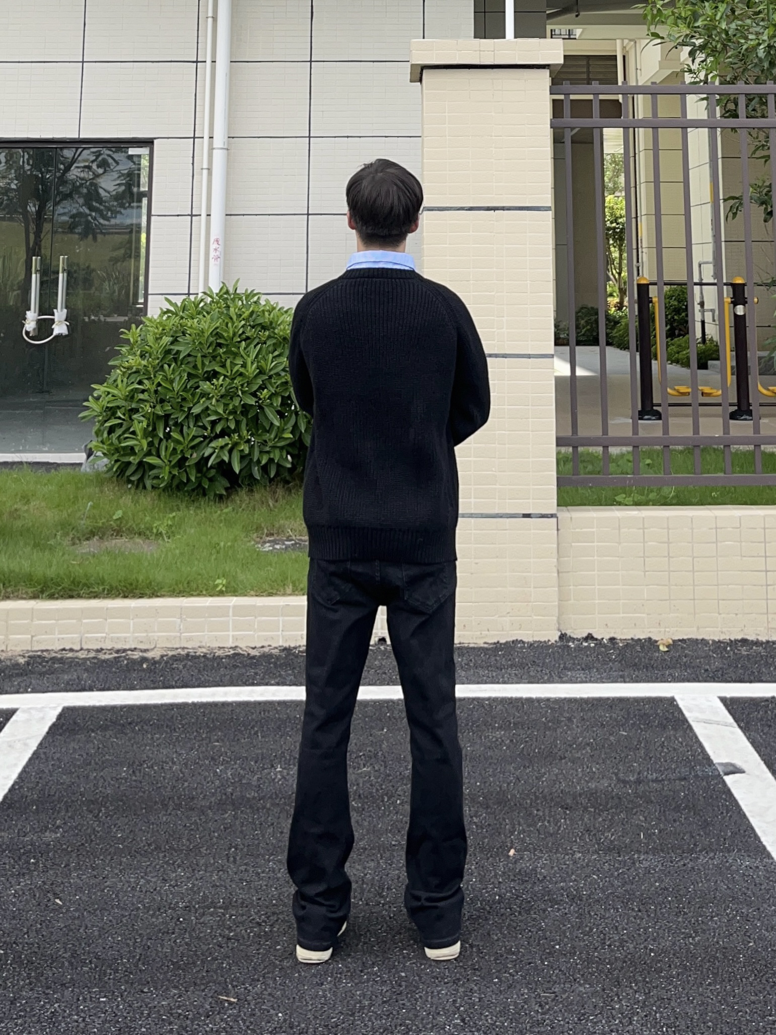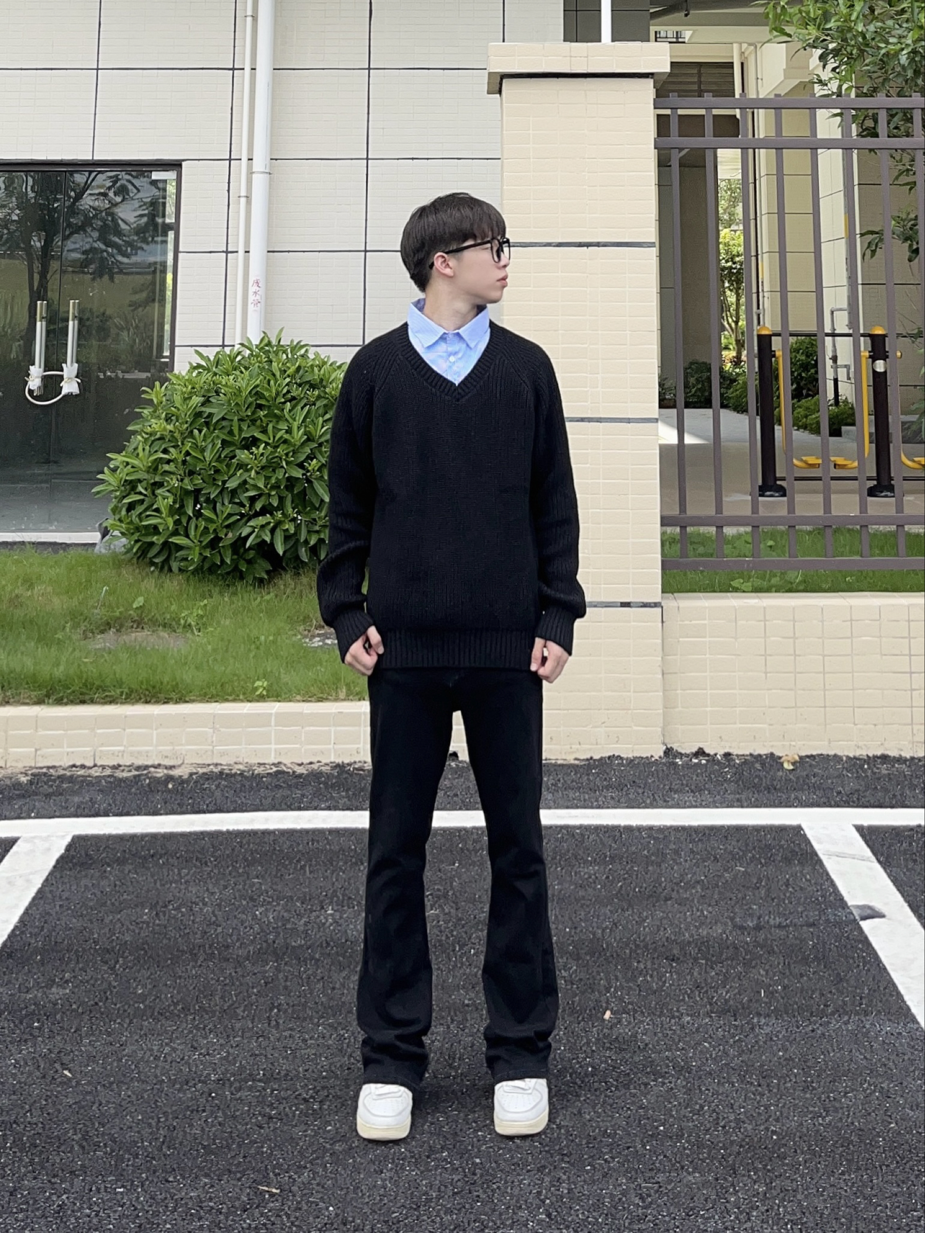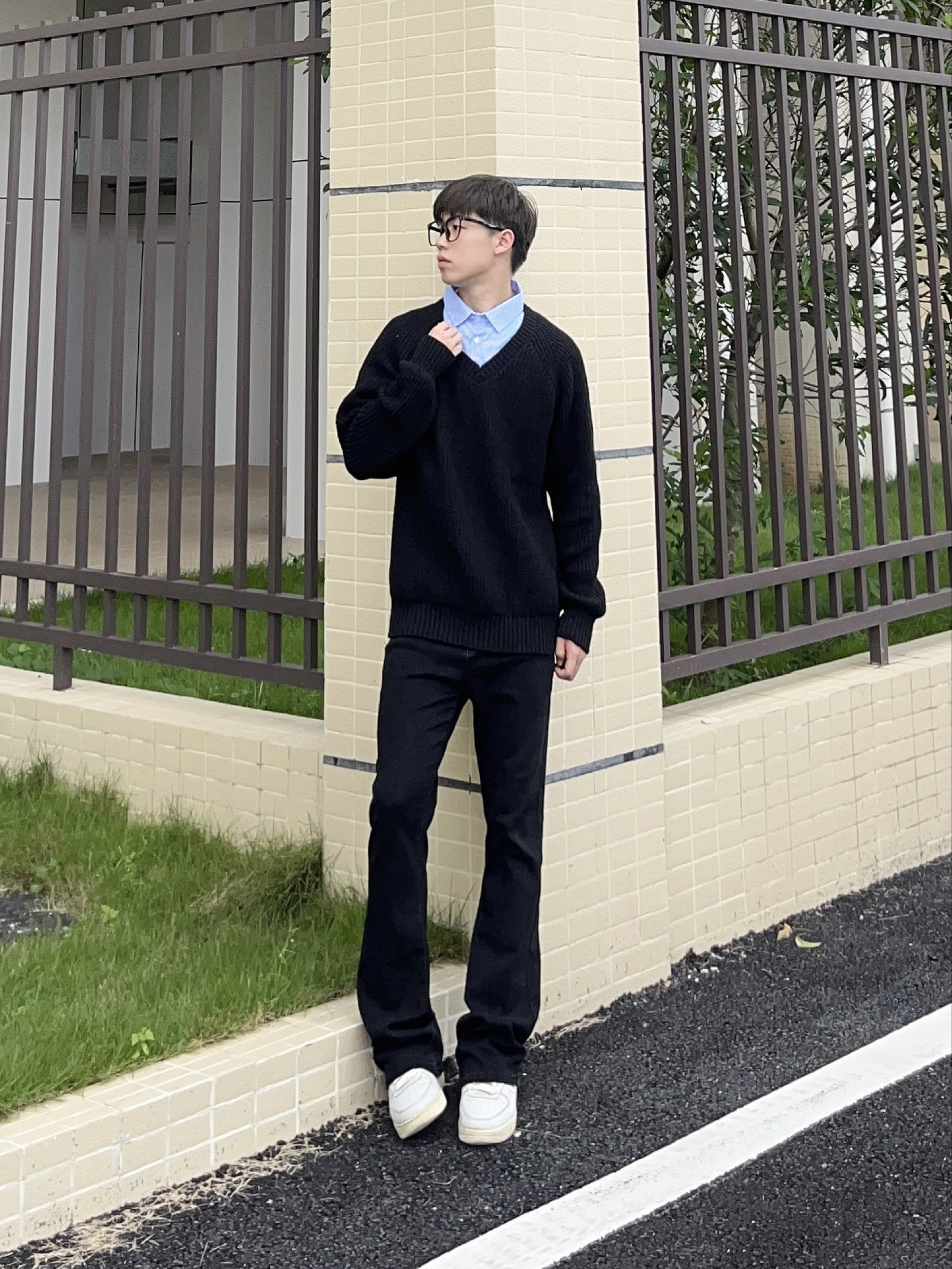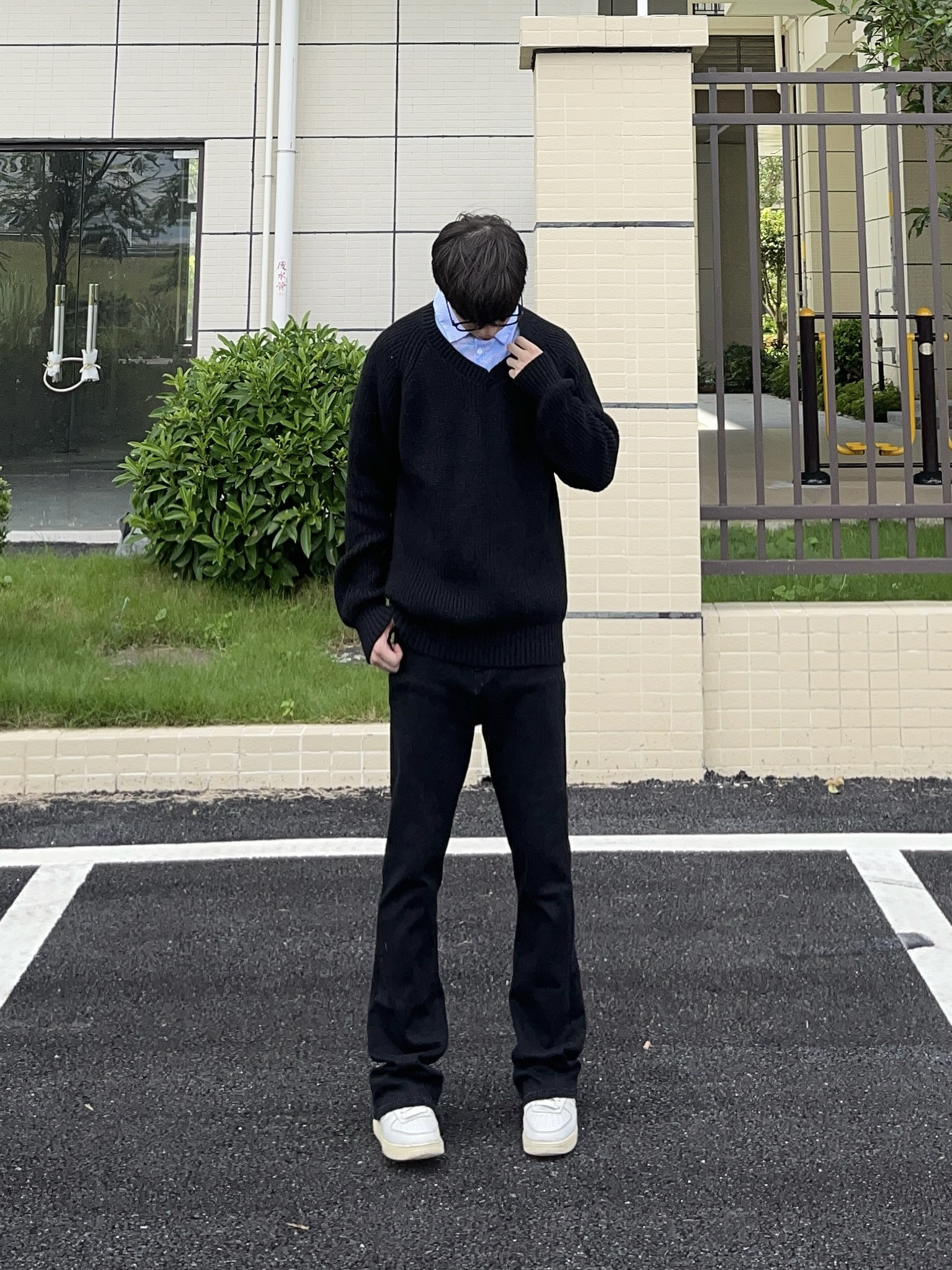 今日份穿搭分享look👀 衣服是 柏朗亚高 PAL ONGACO 的黑色 假两件毛衣卫衣衬衫👔 内领条纹设计美式复古 面料舒适透气 上身版型宽松又慵懒🔥 再搭配一条黑色微喇牛仔裤修饰腿型👖 一套搭配下来 入秋出街文艺风拉满🚶