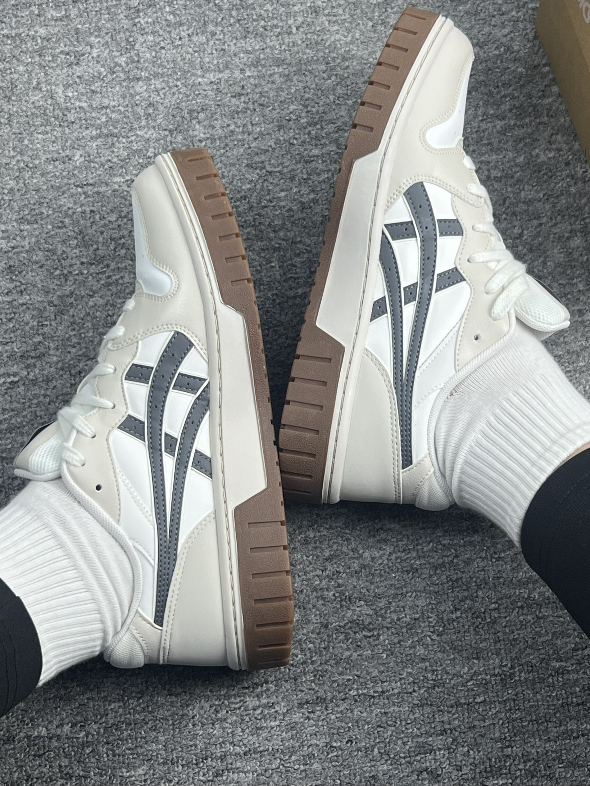 入手这双鞋有段时间了,说说真实感受~ 先说穿着体验,皮质鞋面挺有质感,但刚上脚那几天,鞋帮处有点磨脚踝,得穿厚袜子缓冲下,这点还挺让人糟心的😔。鞋底的话,日常走路是够用的,不过要是长时间逛公园、走山路,就会觉得有点硬,脚底板会发酸。 搭配上倒是挺灵活,配运动裤、牛仔裤都不违和,米白加灰的配色比较百搭。但有次下雨穿它,鞋面溅了泥点,擦的时候得仔细点,不然容易留痕迹。 整体来说,它就是双普普通通...