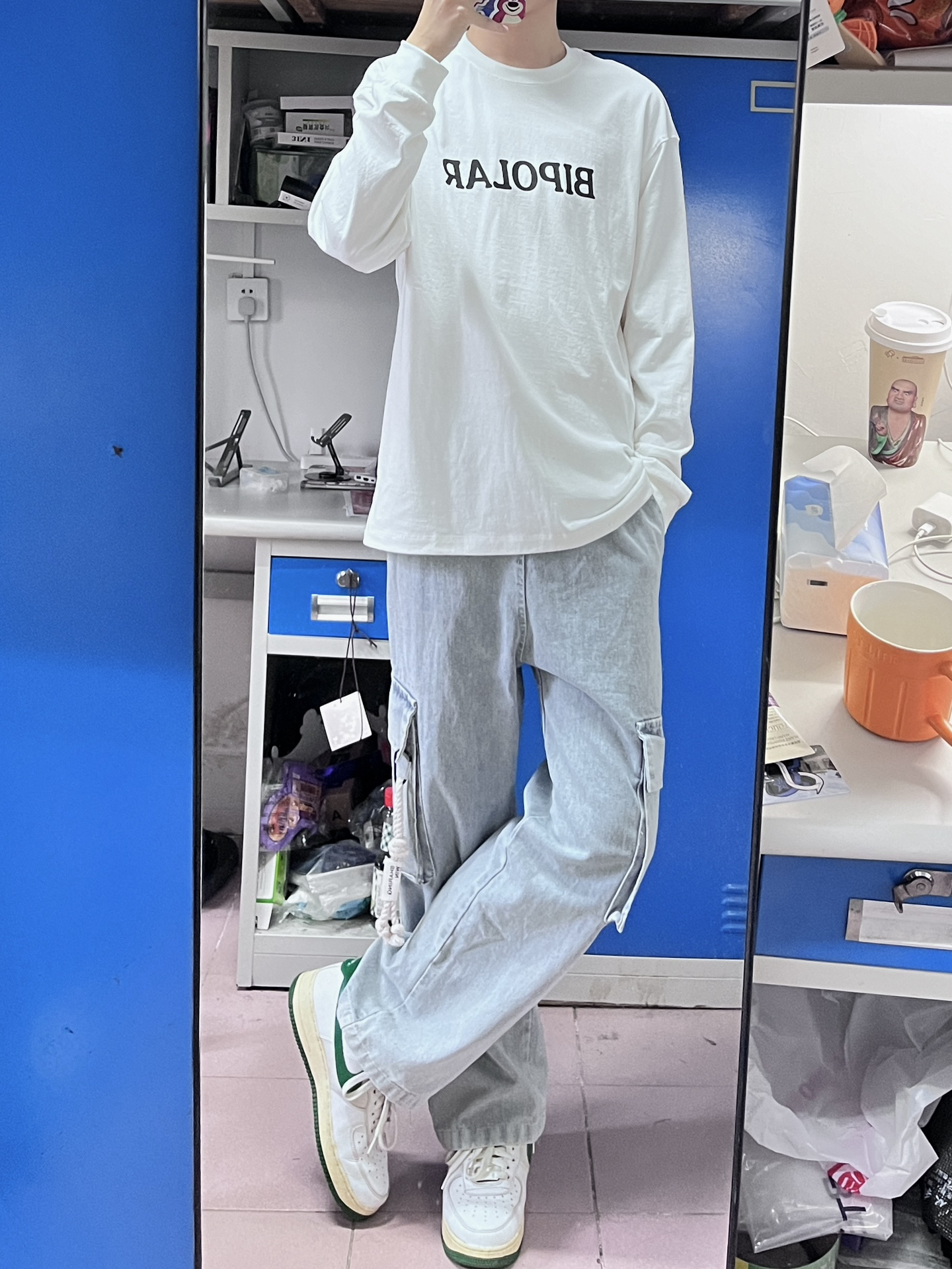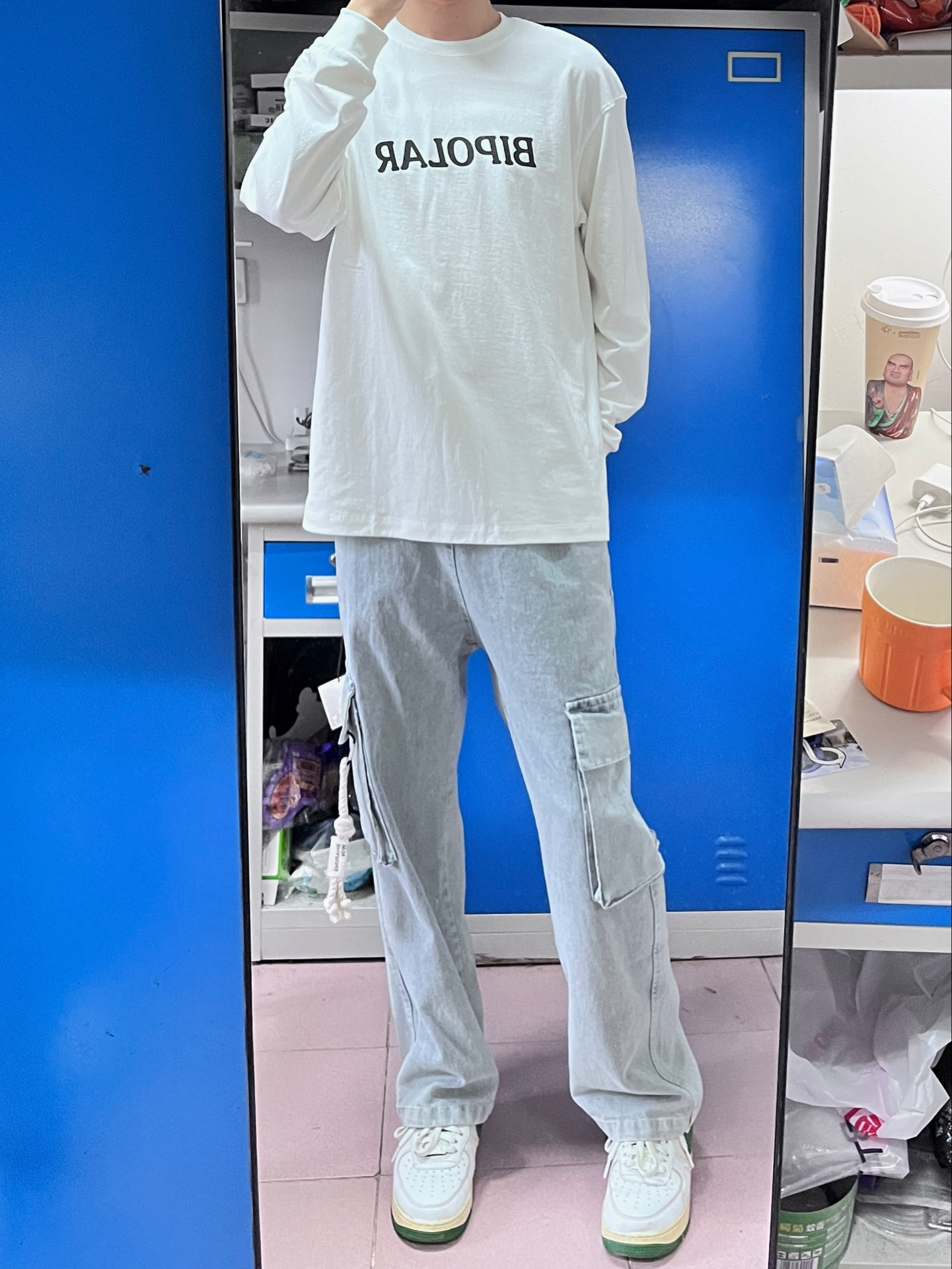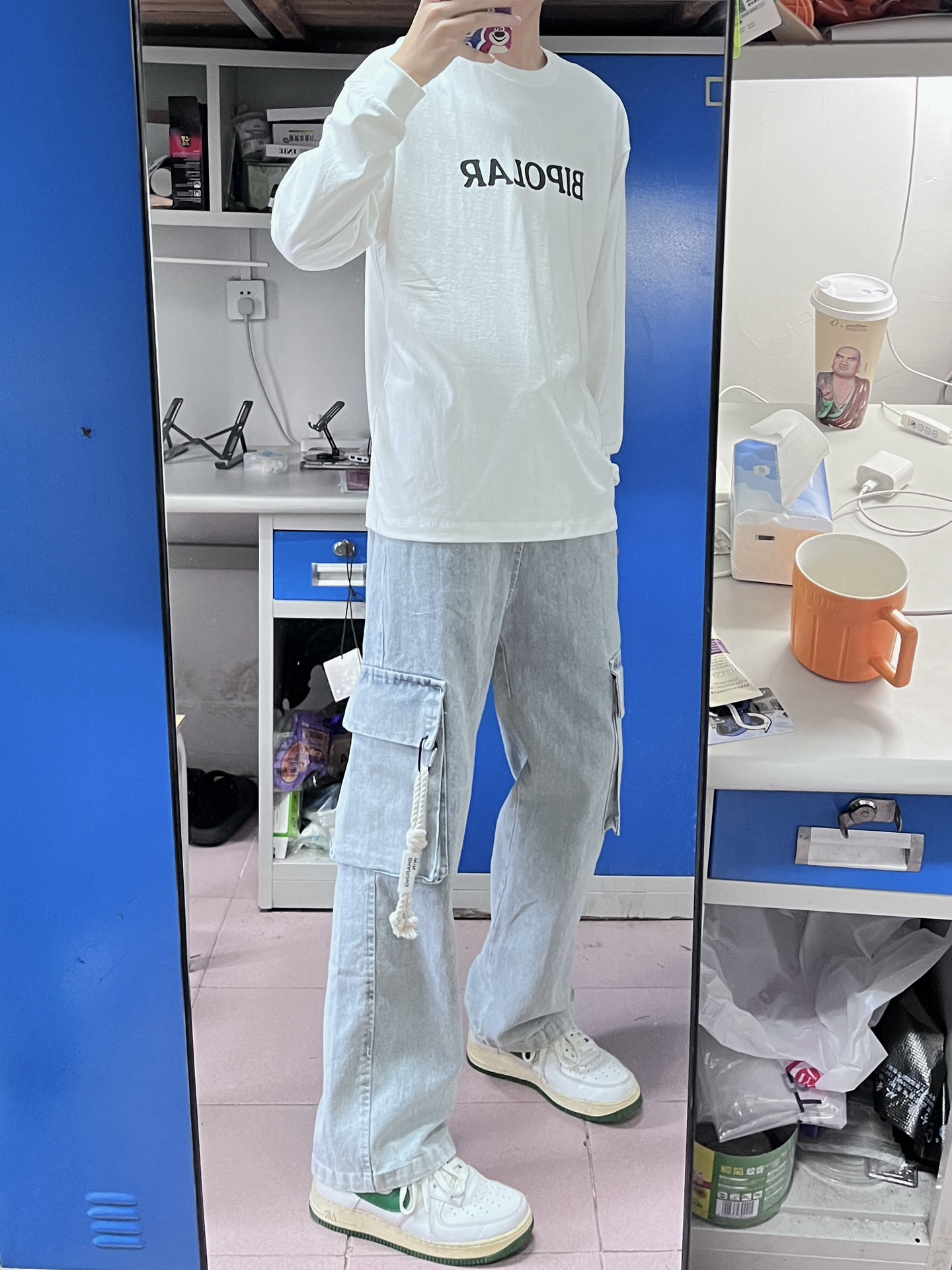 今天穿这条牛仔裤 这条真很好看,工装裤的感觉,口袋的绳结设计也很帅气时尚 搭配这件白色长袖T恤就不错,日常还可以搭配卫衣 简约又好看🤩