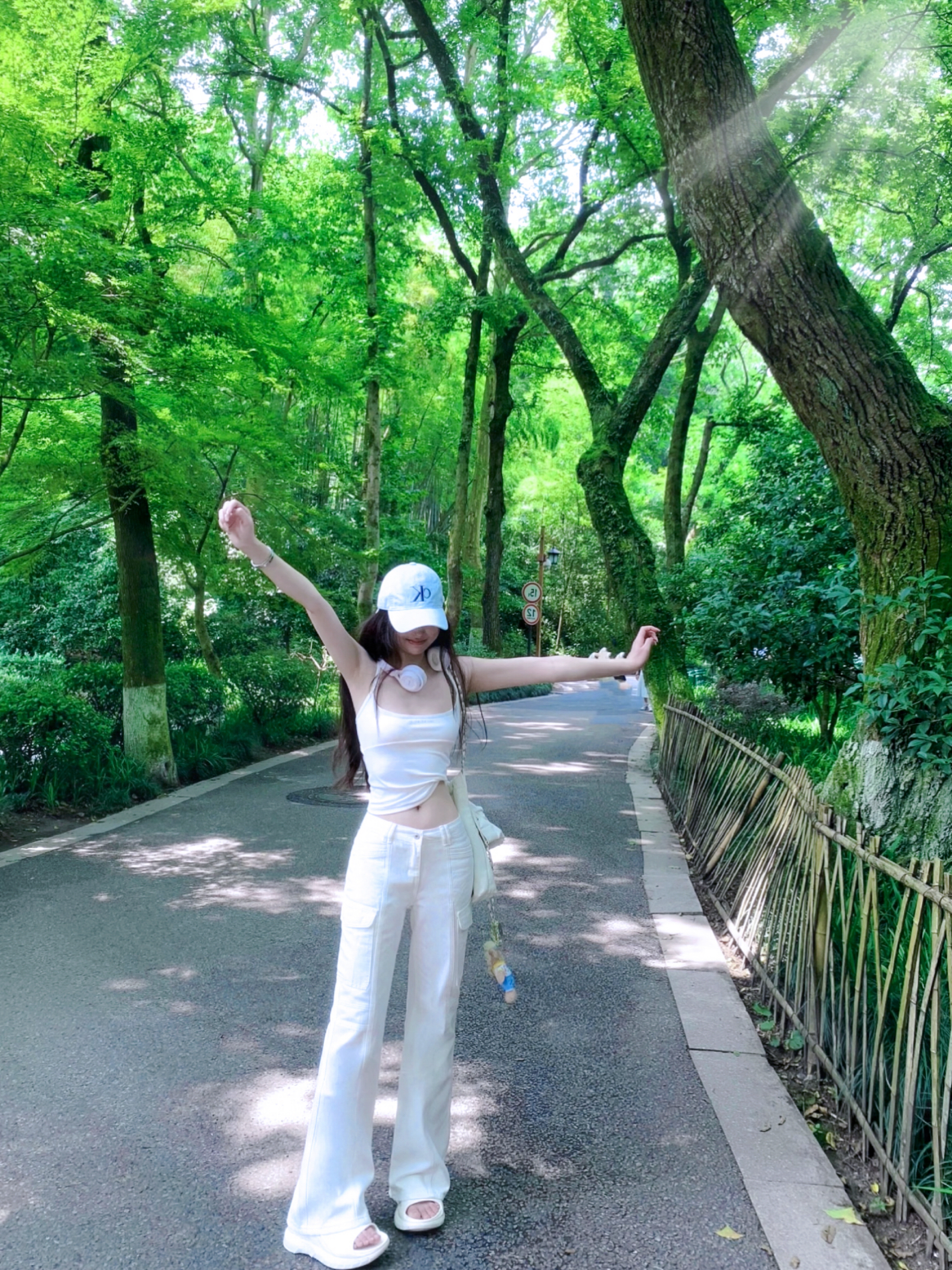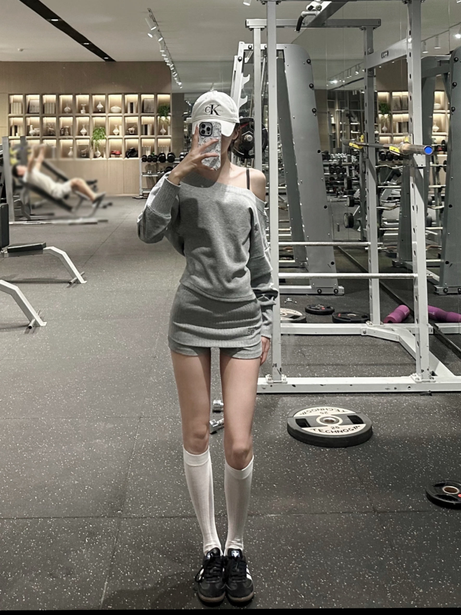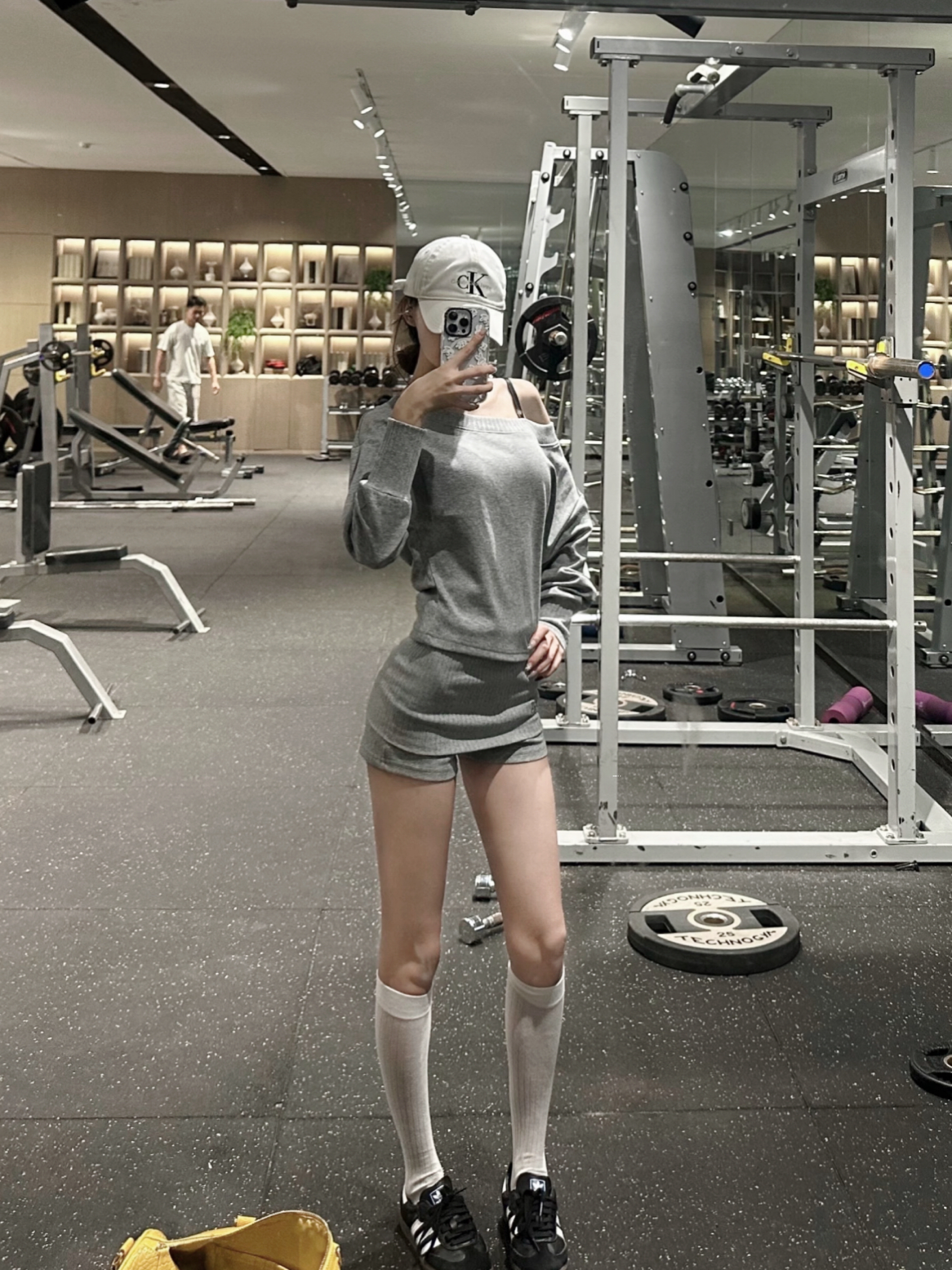 健身房里,浅灰露肩套装搭配白袜黑鞋,头戴白帽,在器械环绕中自拍,运动氛围感直接拉满~