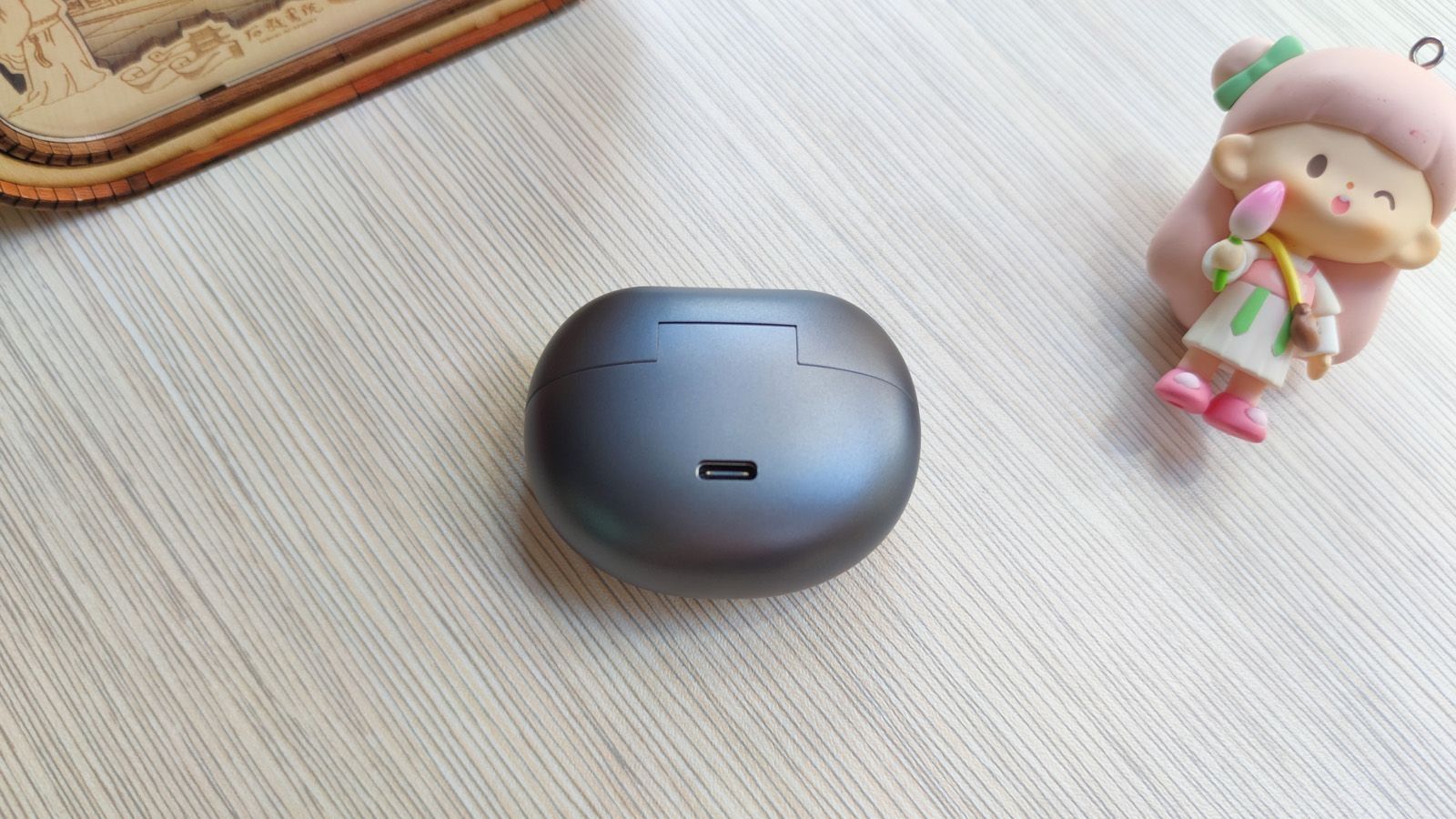 磨砂黑的扁椭圆充电盒,随身携带也不会觉得累赘,而且触感很好,不容易留下指纹印。