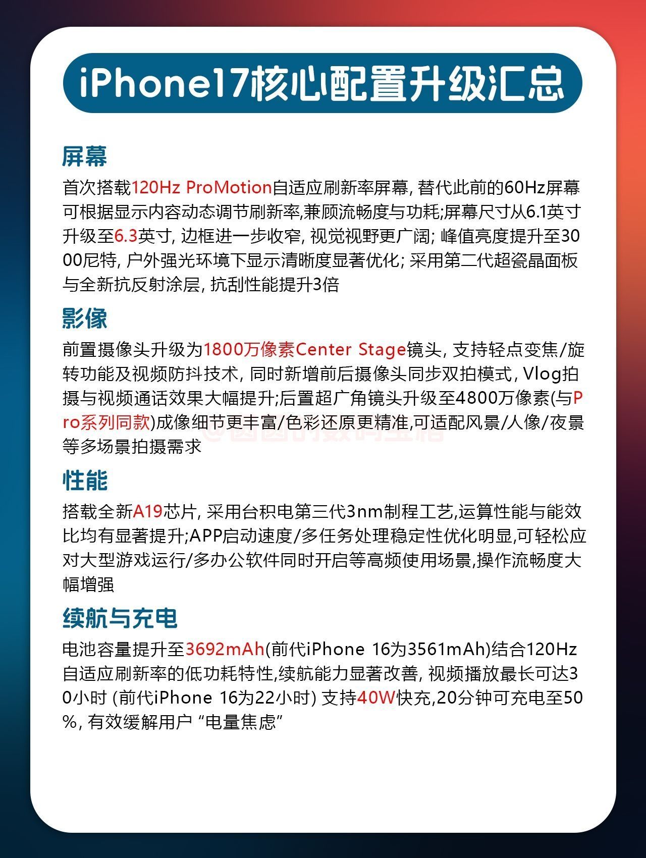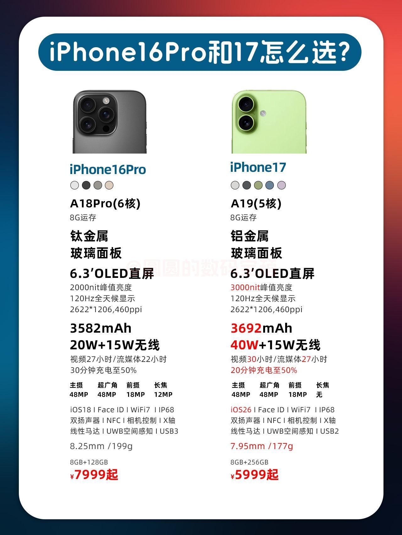 宝子们👋🏻是不是还在纠结苹果16 Pro和苹果17到底应该选哪个?今天圆圆这篇帖子一次性帮你分析透彻,看完就知道怎么选啦👇 📌配置差异对比 🗣芯片性能 📱苹果16 Pro:A18 Pro芯片(6核设计,主频4.05GHz,GeekBench 6多核9376分,多1个GPU核心)复杂图形处理/大型游戏更流畅 📱苹果17:A19芯片(单核成绩接近A18 Pro,多核跑分略低),满足日常使用无压...