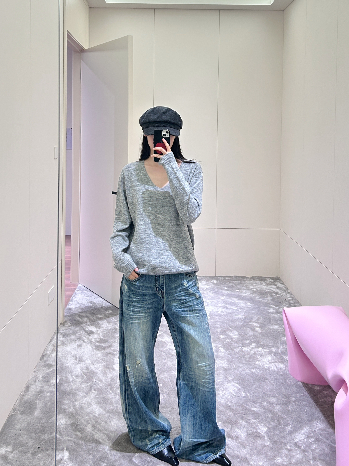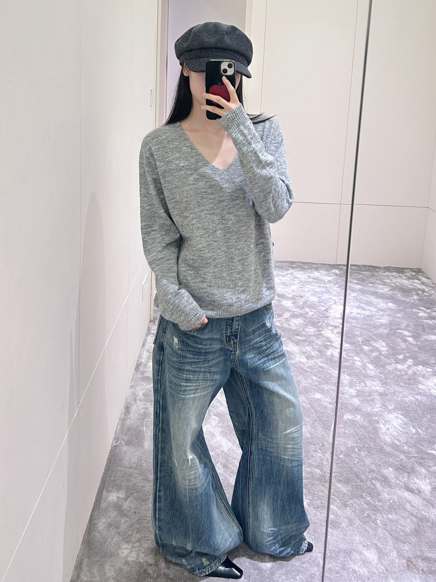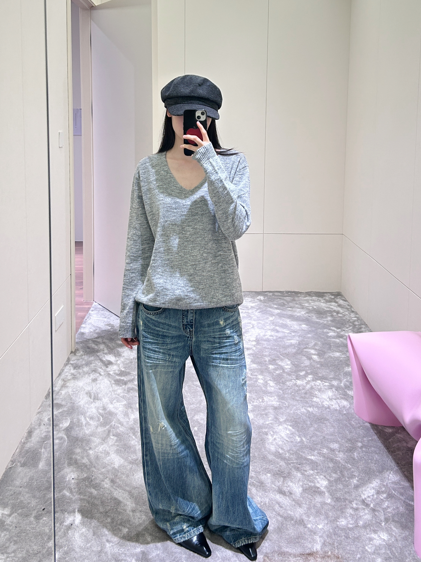 上衣单品:浅灰色V领毛衣是核心,柔和的灰色调自带高级质感,V领设计巧妙修饰颈部线条,拉长视觉比例,宽松的版型营造随性慵懒的氛围,亲肤的材质在秋日能给予恰到好处的温暖,单穿就很有格调,也可根据气温叠加外套。 下装搭配:依旧选择那条做旧水洗阔腿牛仔裤,宽松的裤型与毛衣的松弛感相得益彰,复古的水洗纹理和破洞细节,为整体造型增添了几分街头复古韵味,阔腿剪裁对各种腿型都很友好,行走间尽显随性洒脱。 配饰...