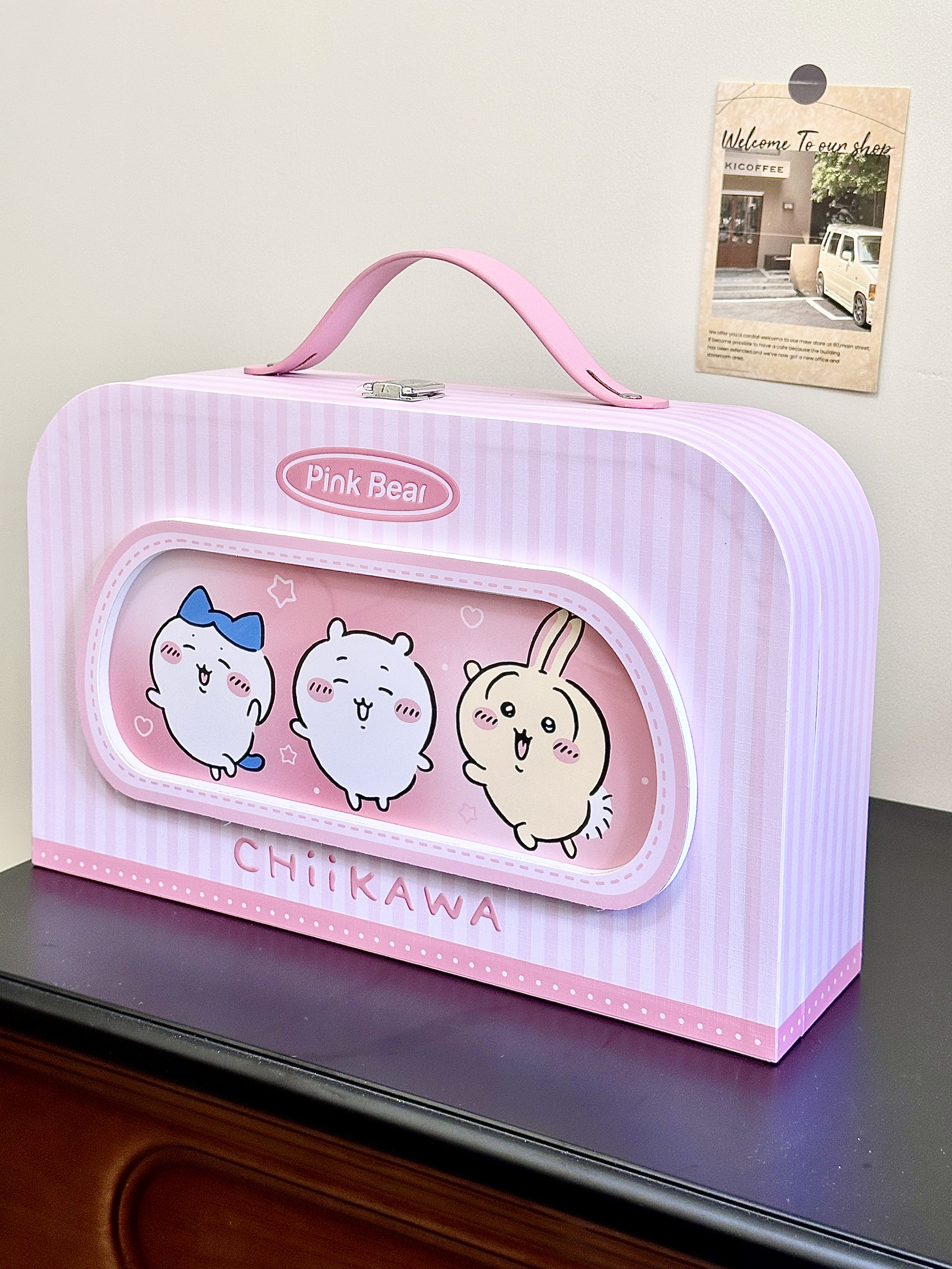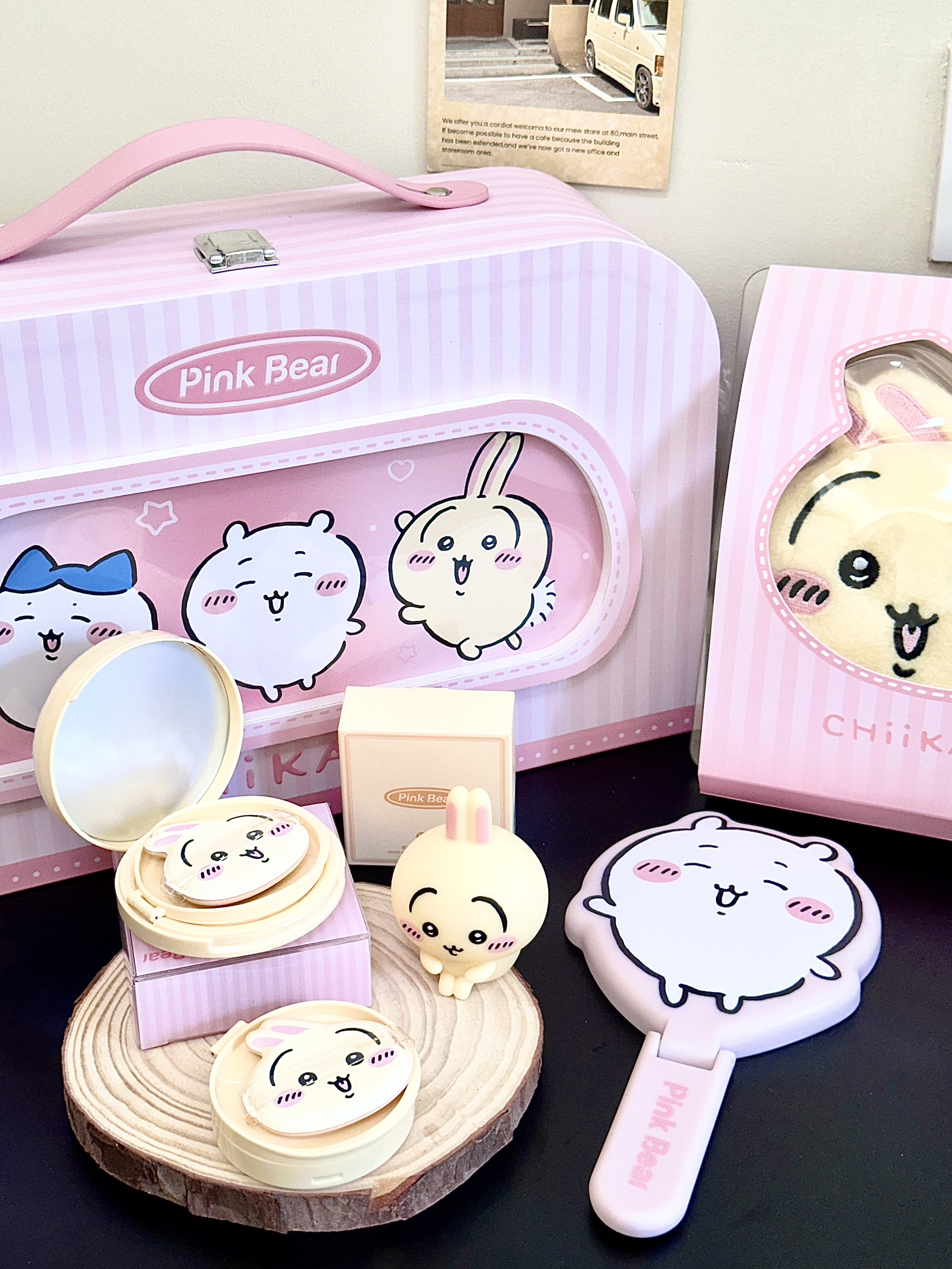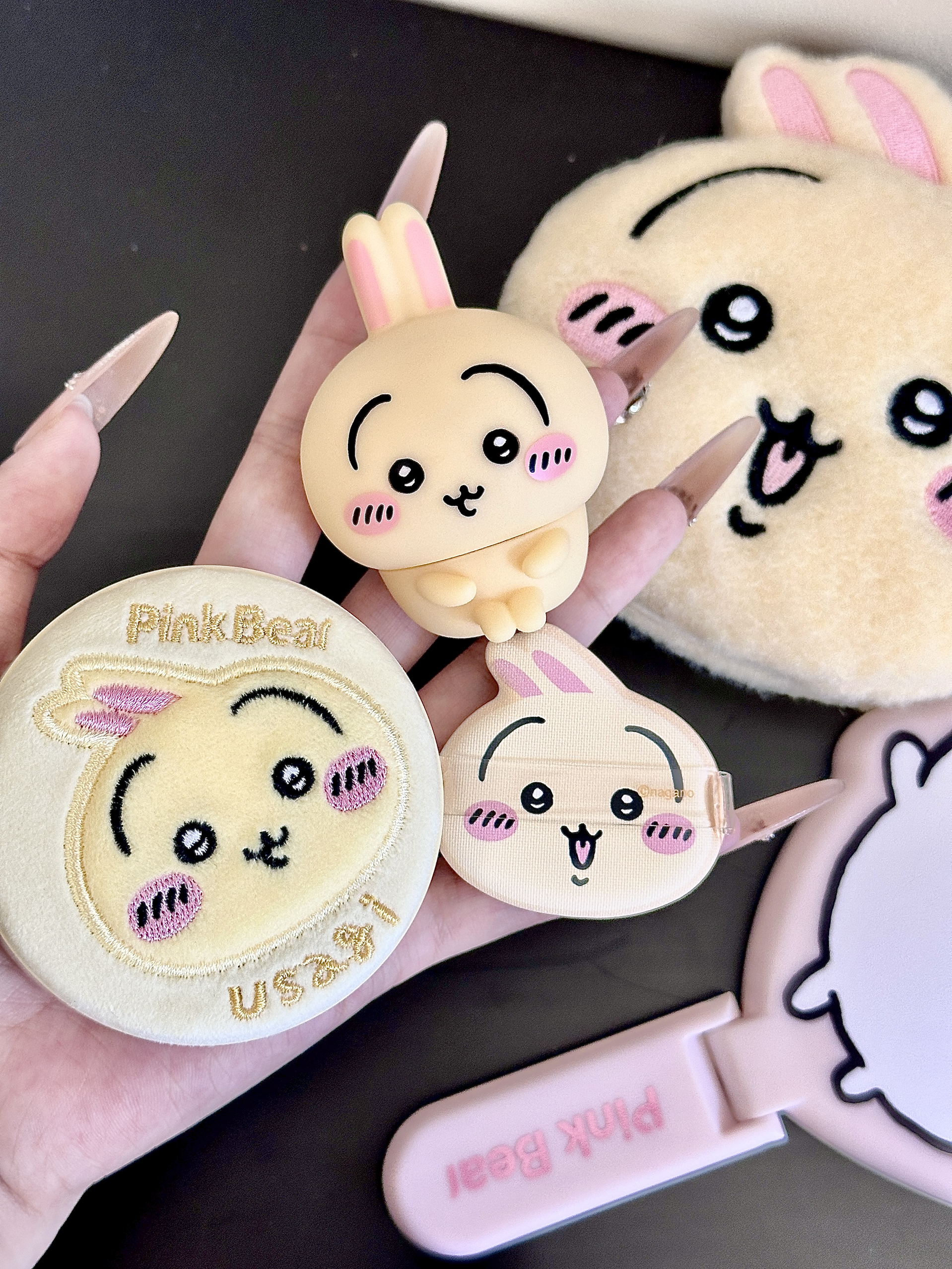 pinkbear 你是真的很懂我们女孩子 介个 CHIIKAWA 新品好戳我的少女心💗 手提箱彩妆礼盒的设计 上面印着三小只耶~可可爱爱 打开里边有气垫➕唇泥➕眼影盘➕手持镜 气垫是那种奶油质地,亲肤好推开 裸杏色的唇泥薄涂厚涂是两种风格 日常素颜涂也不会踩雷 眼影盘是橘粉色调,色号挺齐全 毛茸茸的外壳摸起来好舒服 这一大箱子尊嘟很满足🧳