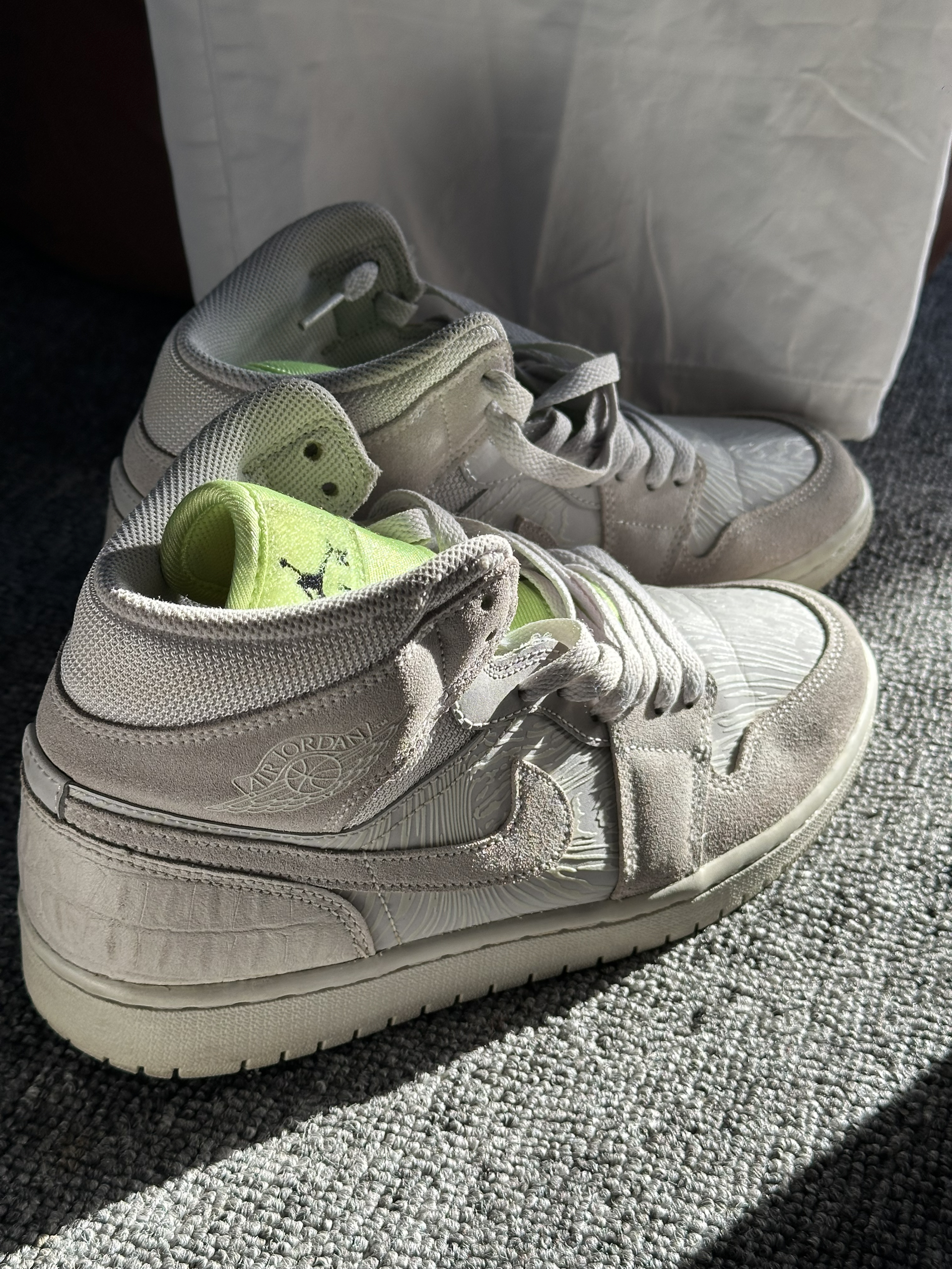 本篇笔记关联了Air Jordan 1 板鞋 运动休闲鞋 复古潮流支撑合成革 中帮/米灰/绿色等商品,为用户提供真实的使用体验和购买参考。