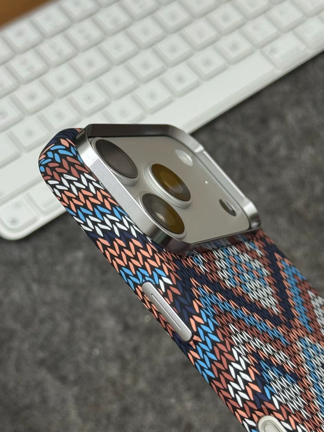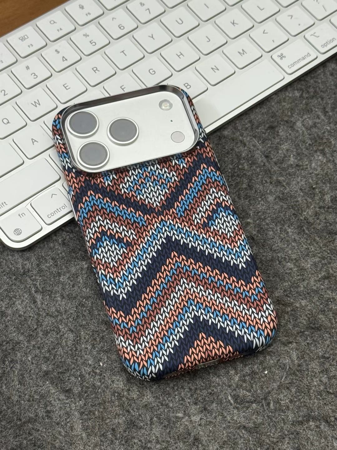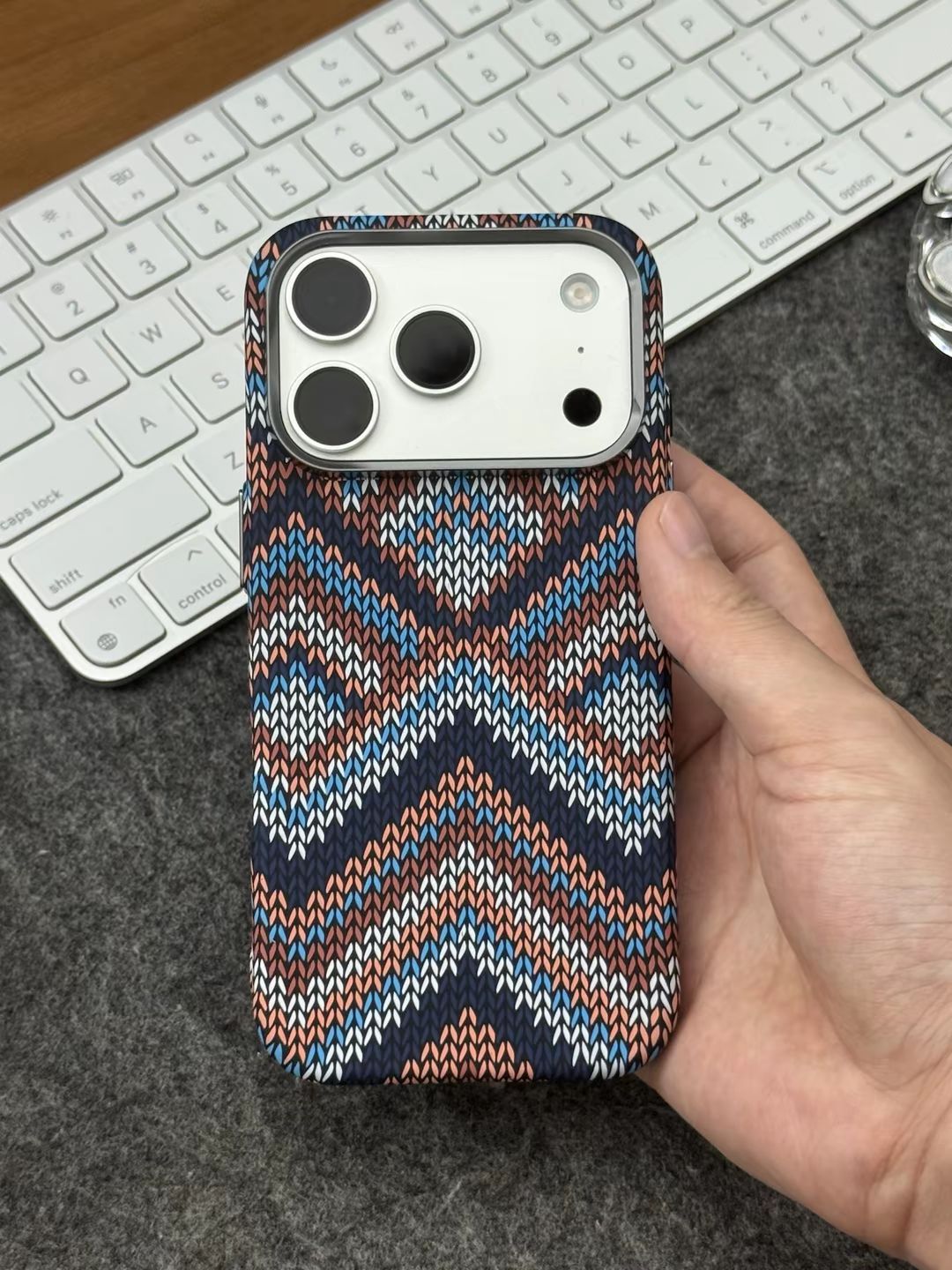 波西米亚风格蓝白款,真的小众又好看 个人很喜欢这种稻穗纹的编织纹理,看起来规整又好看 虽然不是真的编织工艺,🆒但是摸起来依旧有条纹的凹凸感,确实手感微妙 - 整体轻薄,只有1.6mm不到的厚度,套上也不觉得臃肿,小手拿着也不累 令我满意的是,🧲它的磁力超强,可以吸附磁吸充电宝等磁吸设备,并且特别牢固