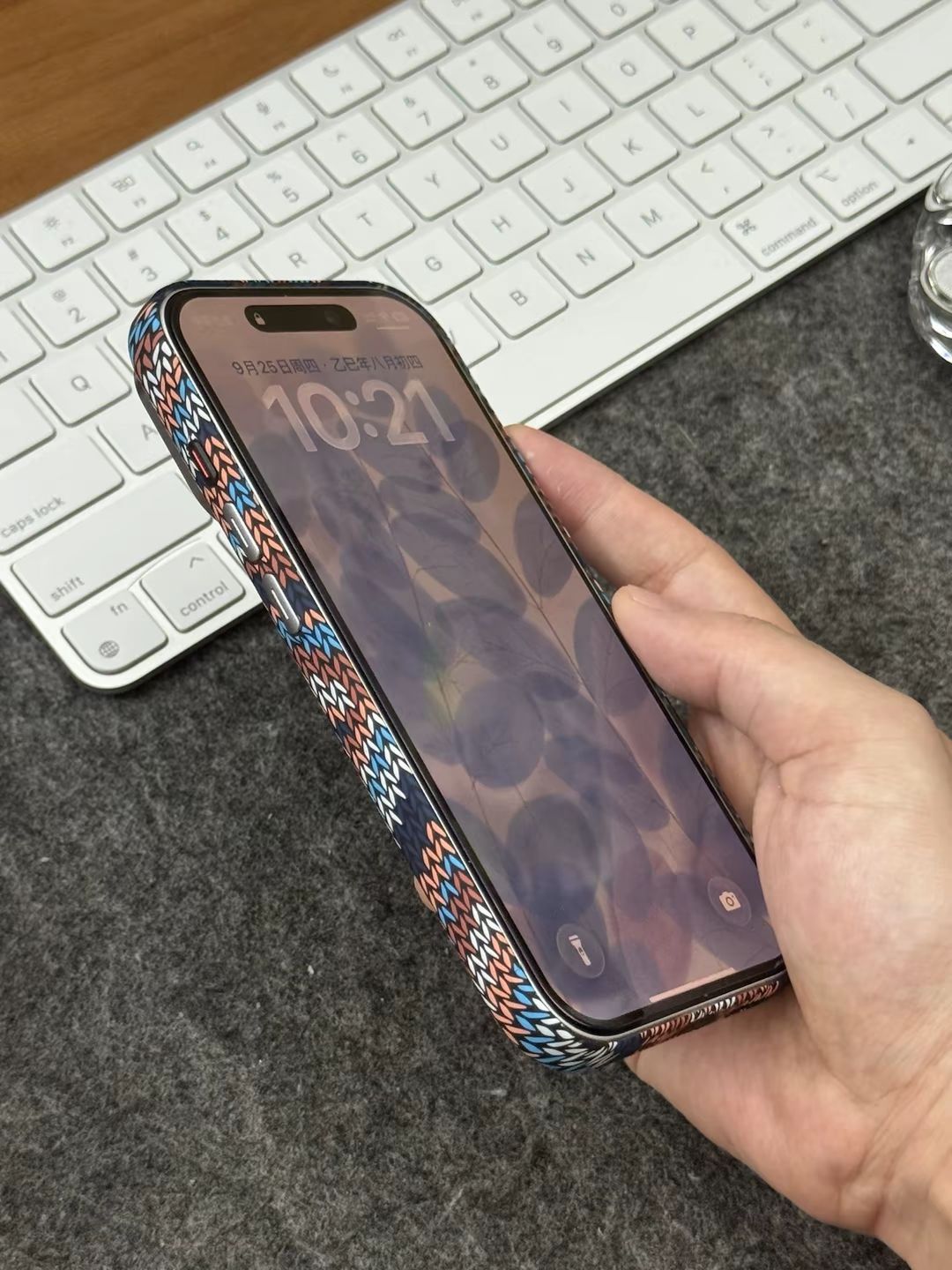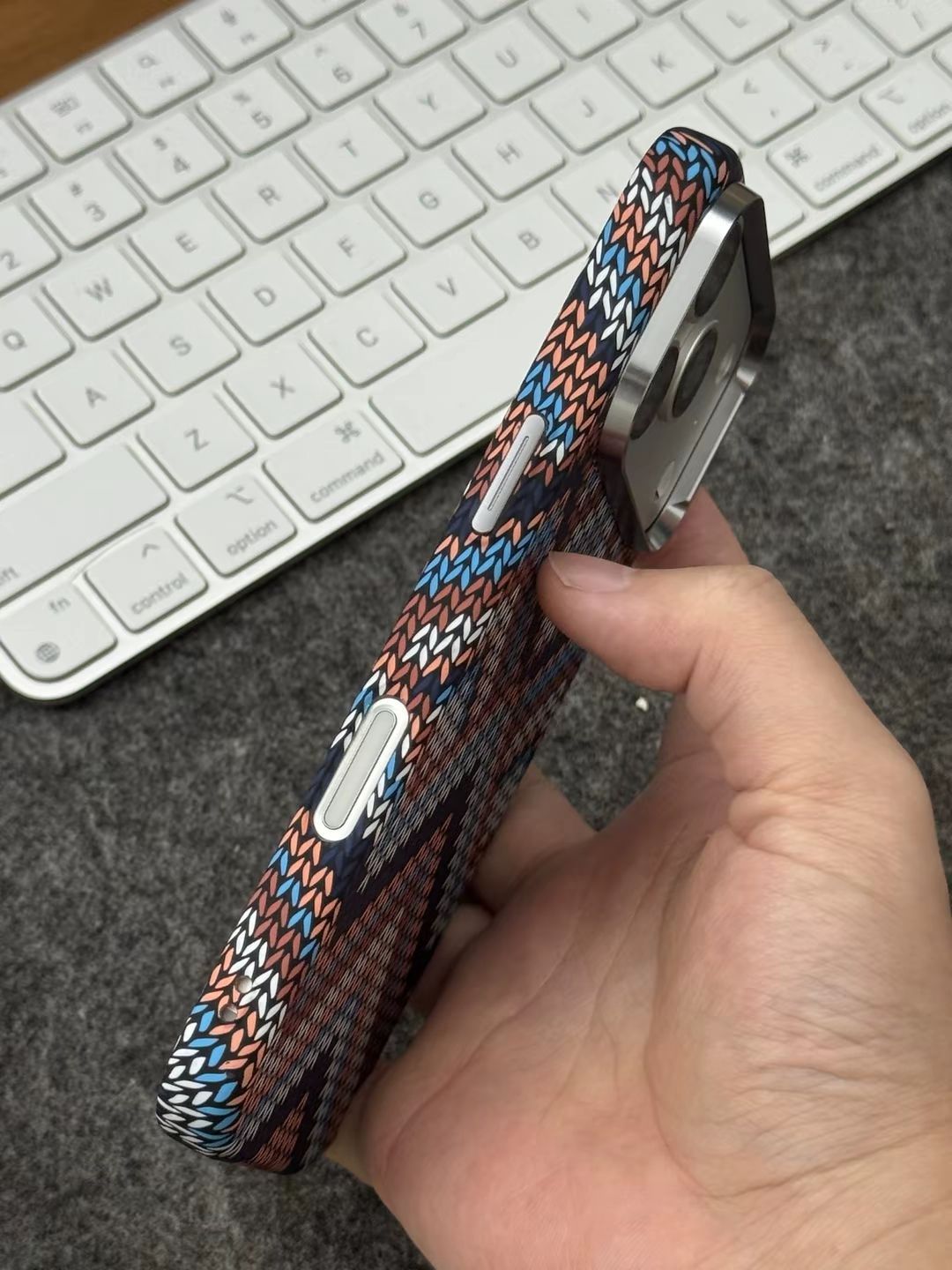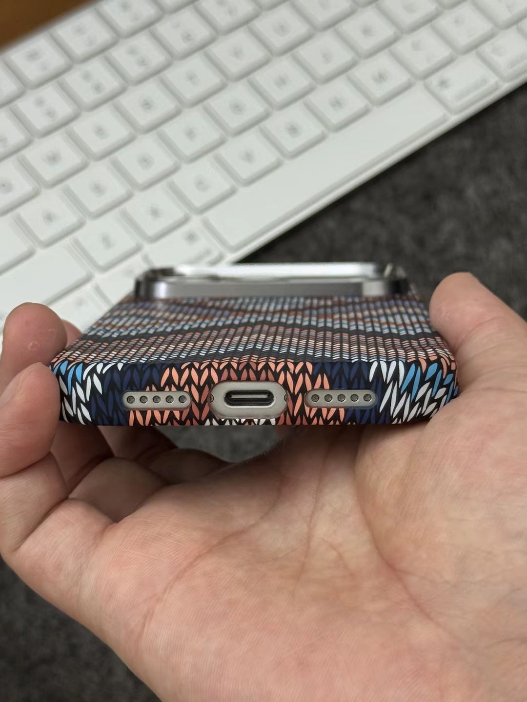 波西米亚风格蓝白款,真的小众又好看 个人很喜欢这种稻穗纹的编织纹理,看起来规整又好看 虽然不是真的编织工艺,🆒但是摸起来依旧有条纹的凹凸感,确实手感微妙 - 整体轻薄,只有1.6mm不到的厚度,套上也不觉得臃肿,小手拿着也不累 令我满意的是,🧲它的磁力超强,可以吸附磁吸充电宝等磁吸设备,并且特别牢固
