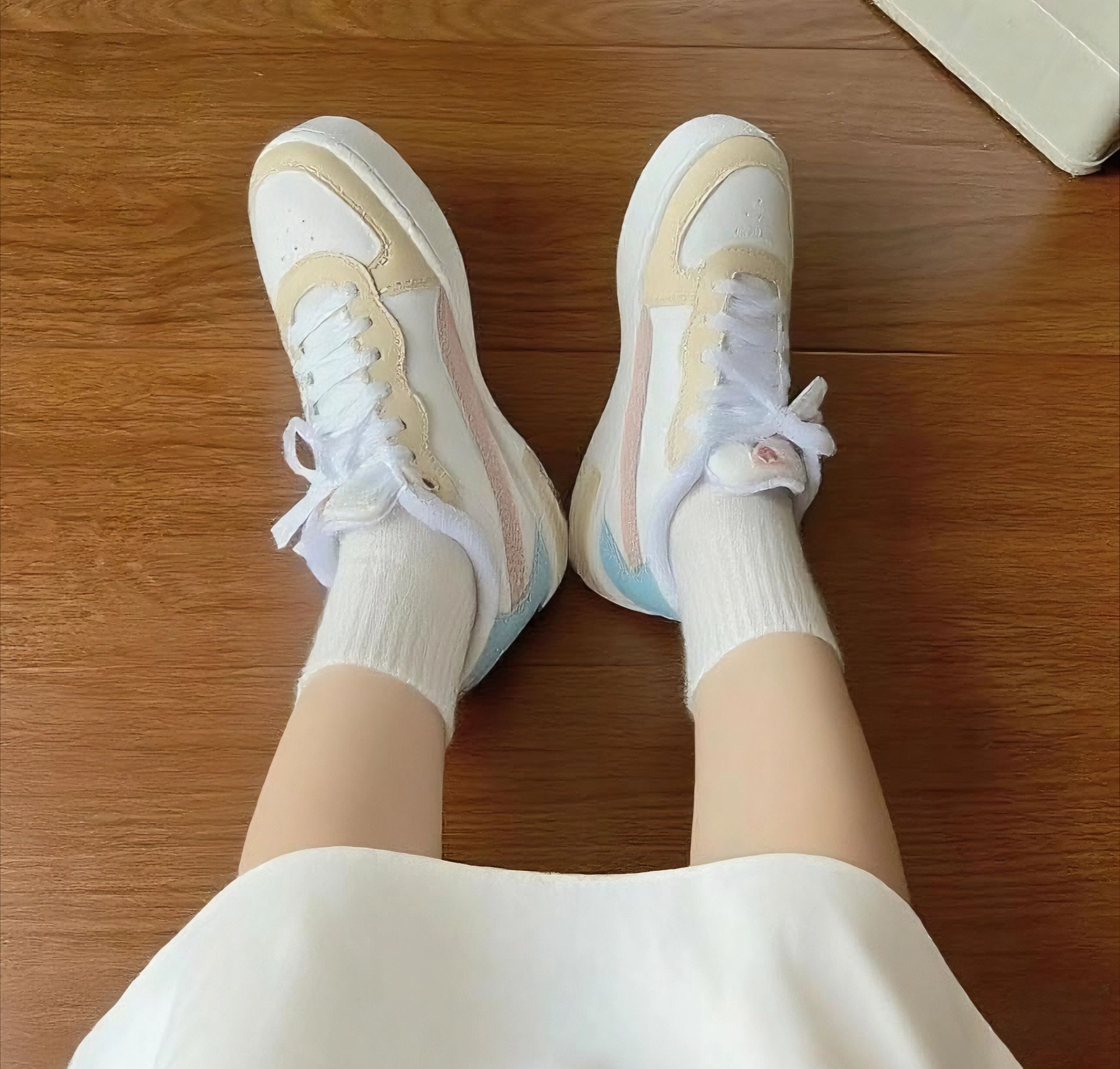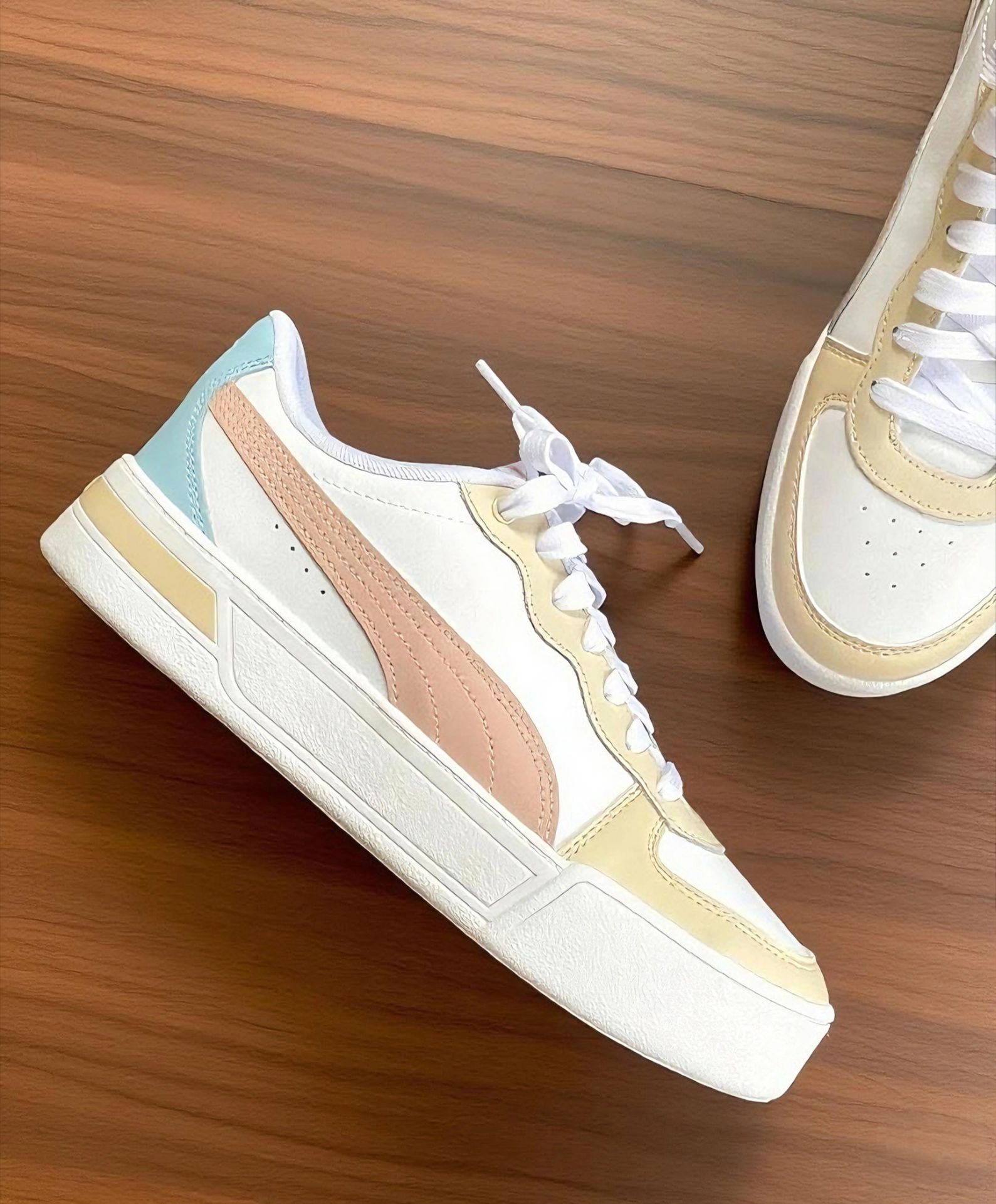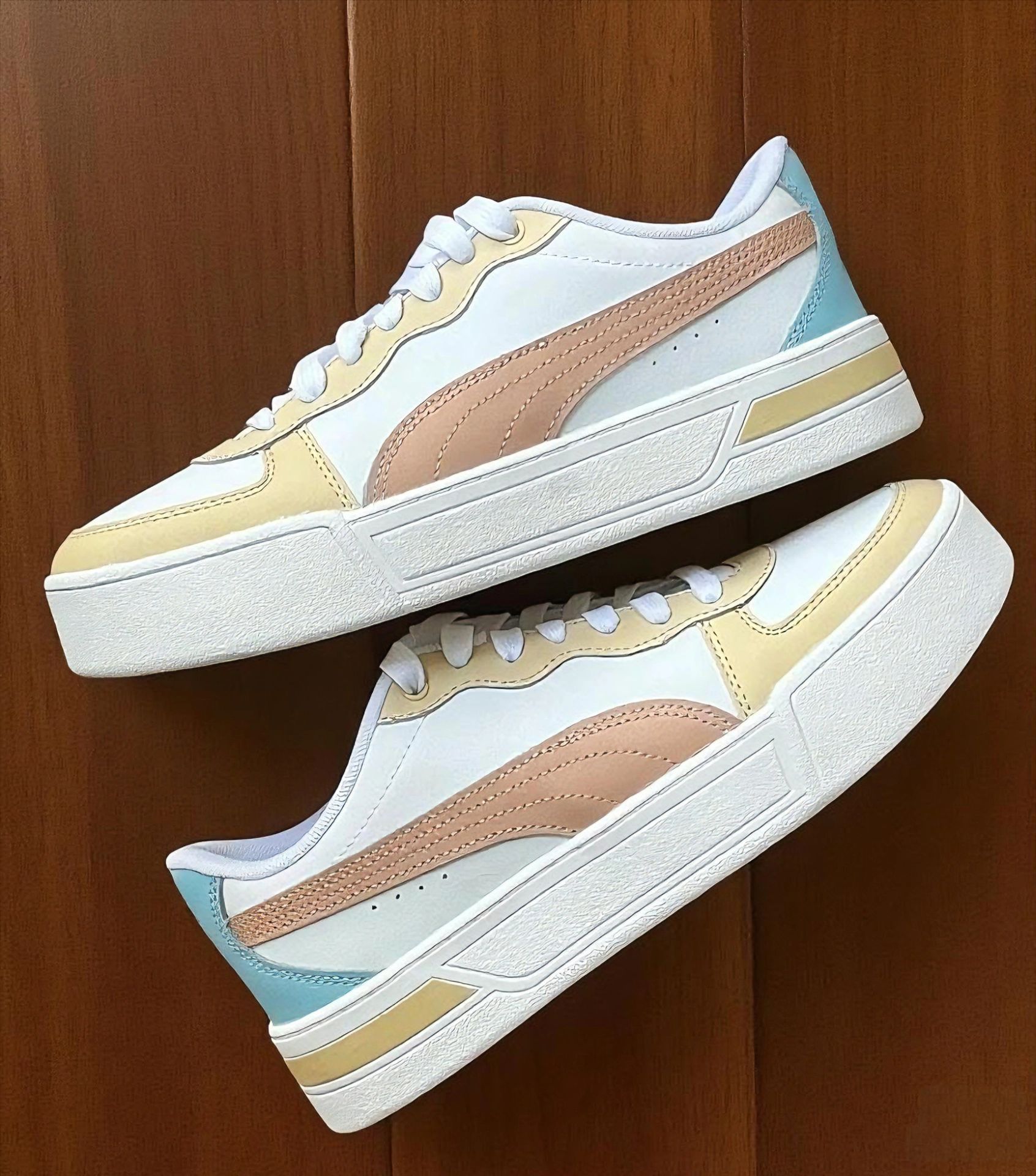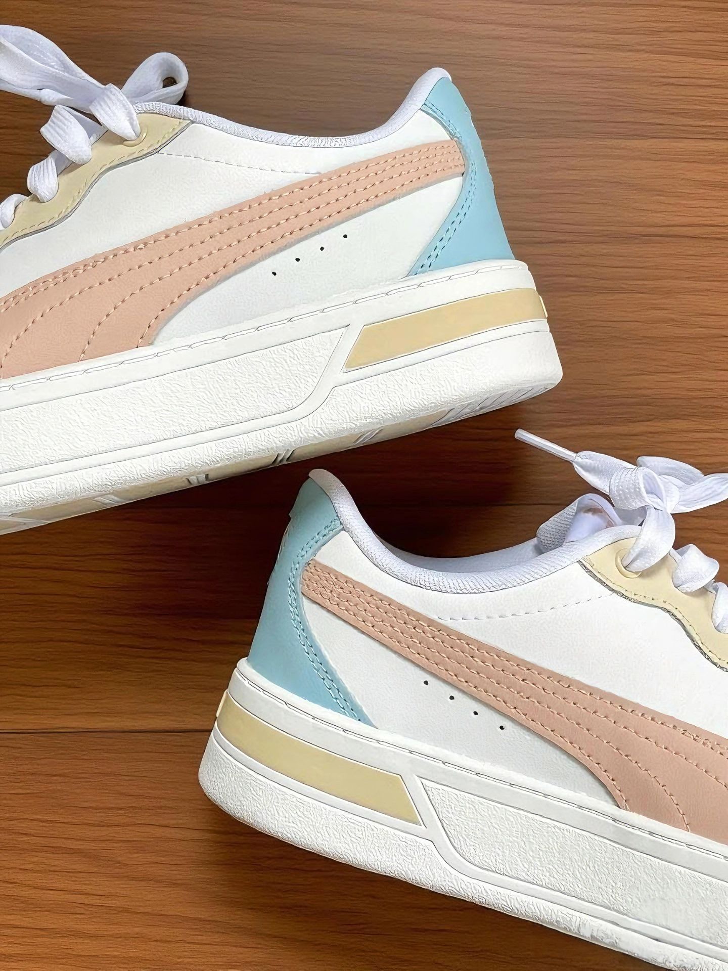 被这双Puma板鞋拿捏了✨ 真实上脚体验 刚上脚,软乎乎的!鞋底有厚度但不笨重,日常逛街、通勤暴走都不累脚,对我这种爱逛的人太友好啦。 做工很在线,鞋面拼接处缝线细密,材质耐磨又有质感。穿了几天,鞋型依旧挺括,没出现开胶、变形,国货(Puma也算经典啦)质量稳稳的👍 配色也是绝绝子!奶油黄+粉棕+浅蓝,清新又复古,配牛仔裤、裙子都百搭;脚感舒适,兼顾颜值与实用;质量抗打,性价比在线