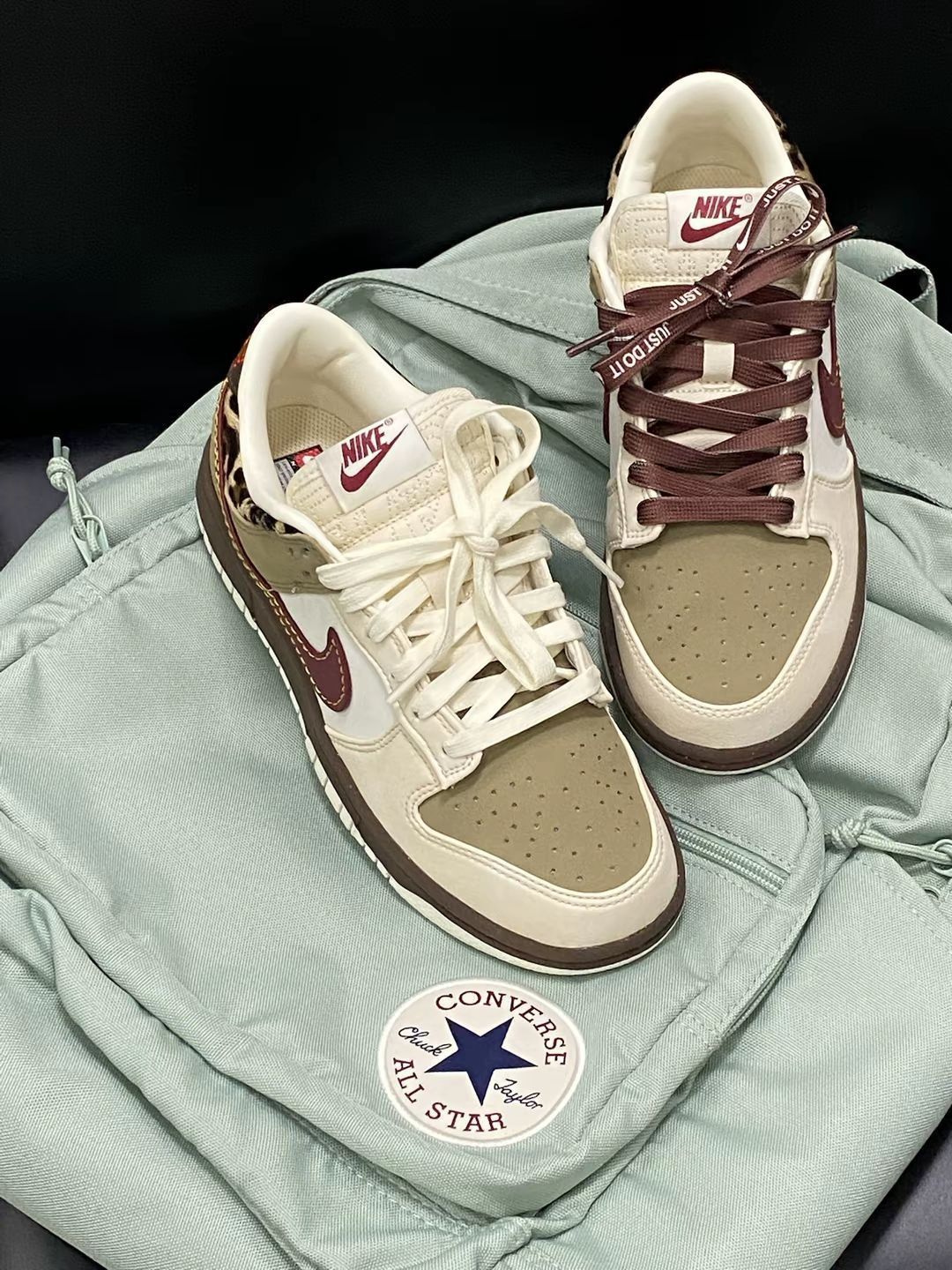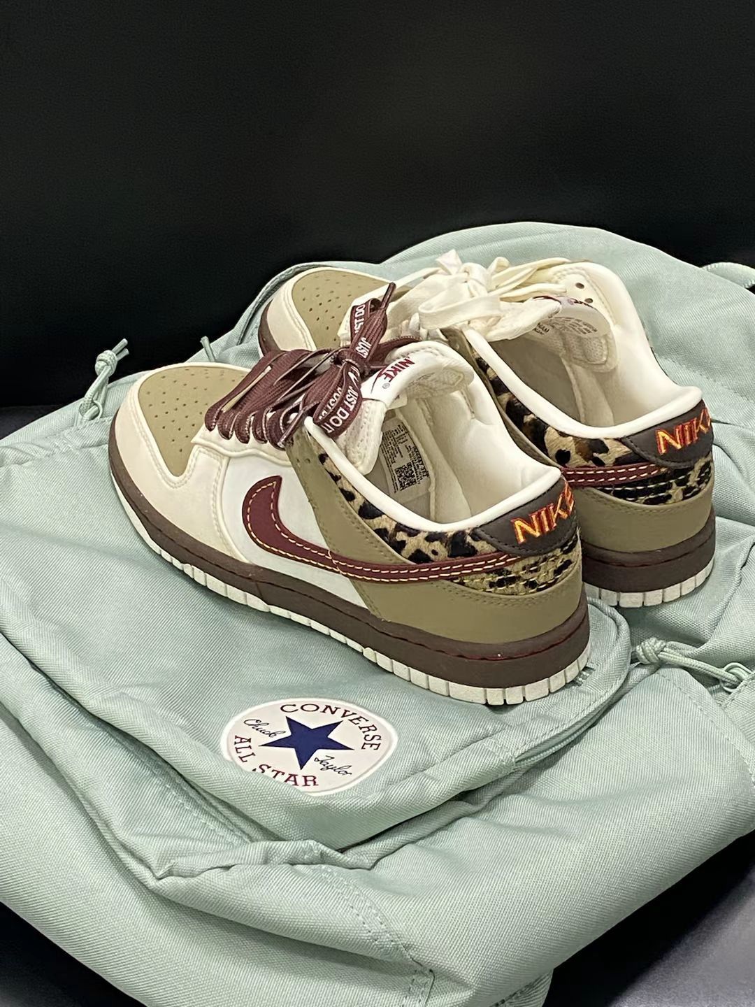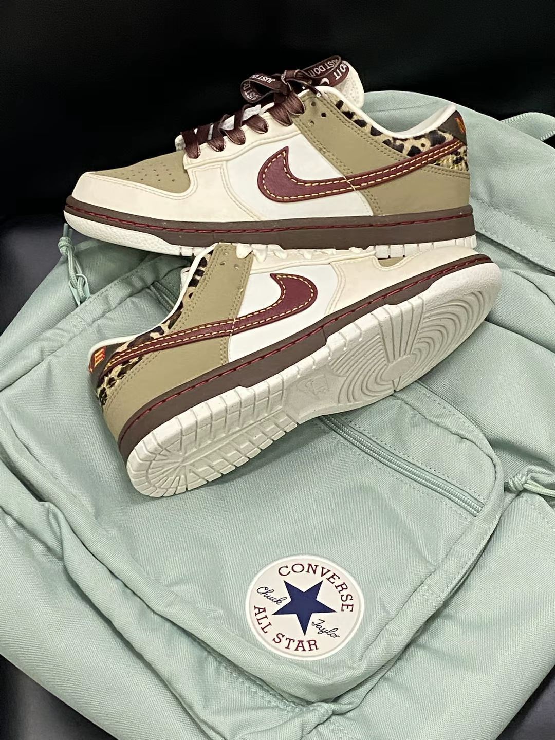 💖秋天的第一双dunk来咯 一眼就把我拿捏的dunk‼️ 🤪棕色拼接栗色侧边logo 也太好看了吧🥰 呜呜呜呜 而且豹纹的图案很有特点呀🧚 搭配我的薄荷绿书包 😱不要太配啦