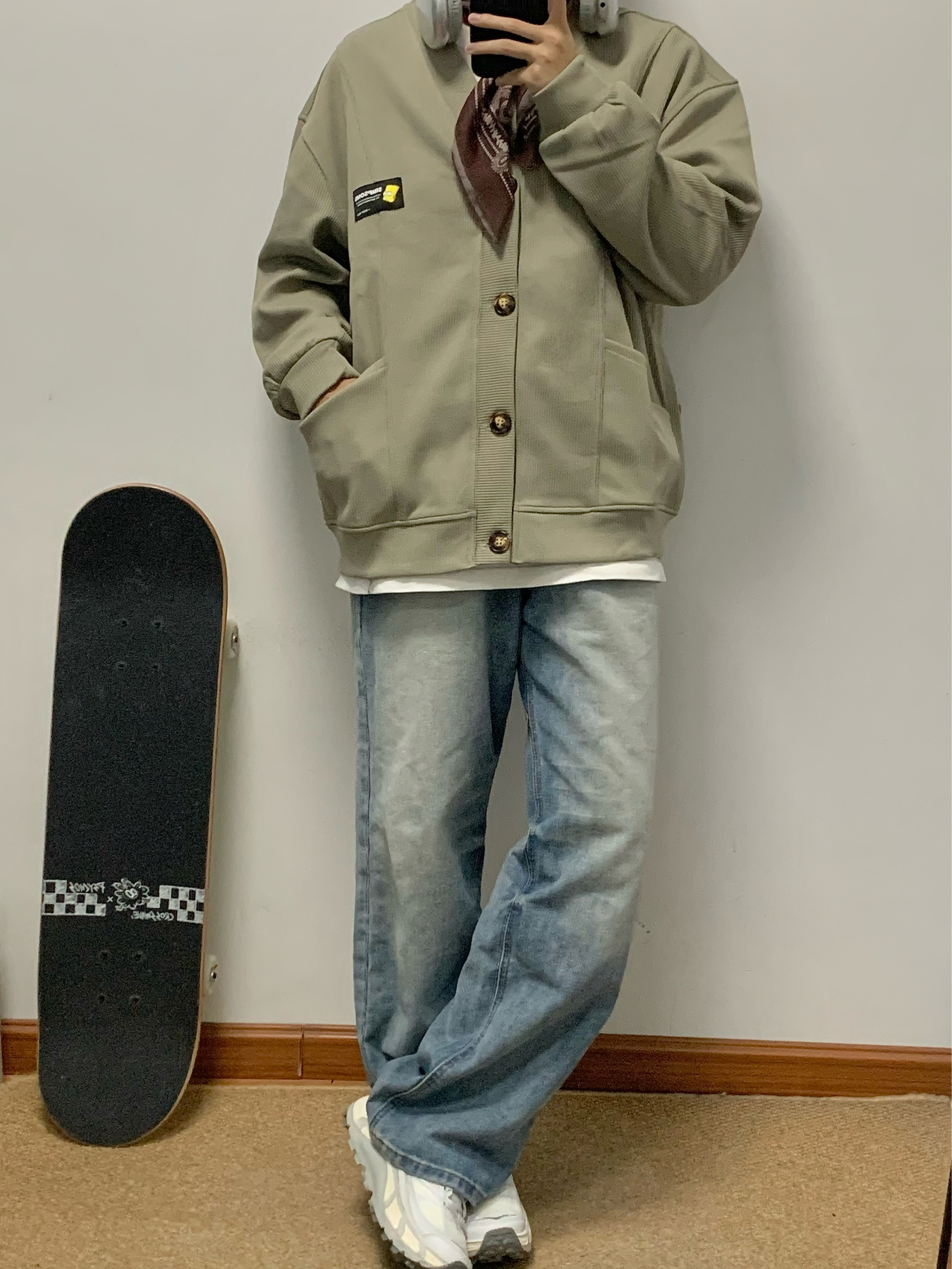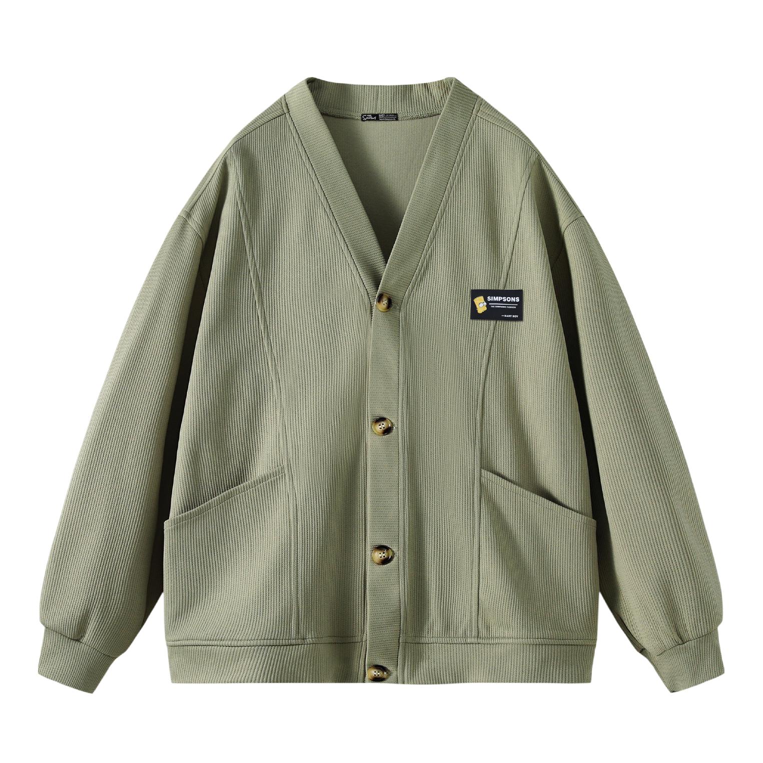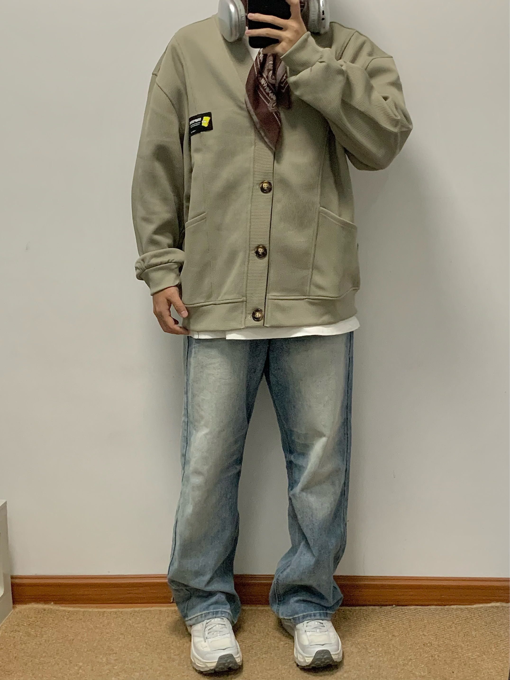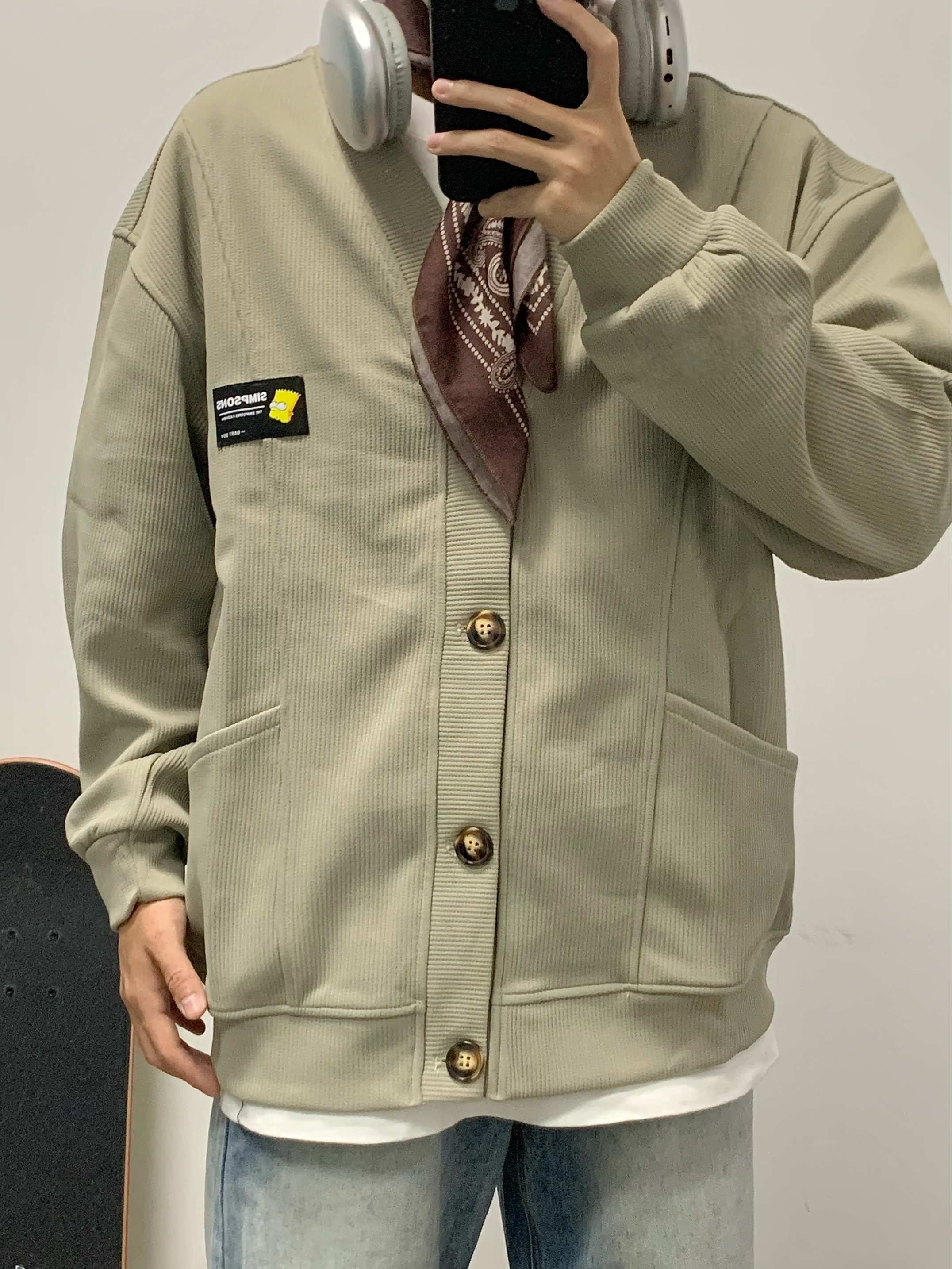 灰绿色外套搭配蓝色牛仔裤 少年感十足 V领开衫的版型 松弛感拿捏 简约百搭 类似华夫格的面料 上身很舒服 日常搭配牛仔裤或者休闲裤都可 入秋就穿这一身 包帅的! 👔:辛普森