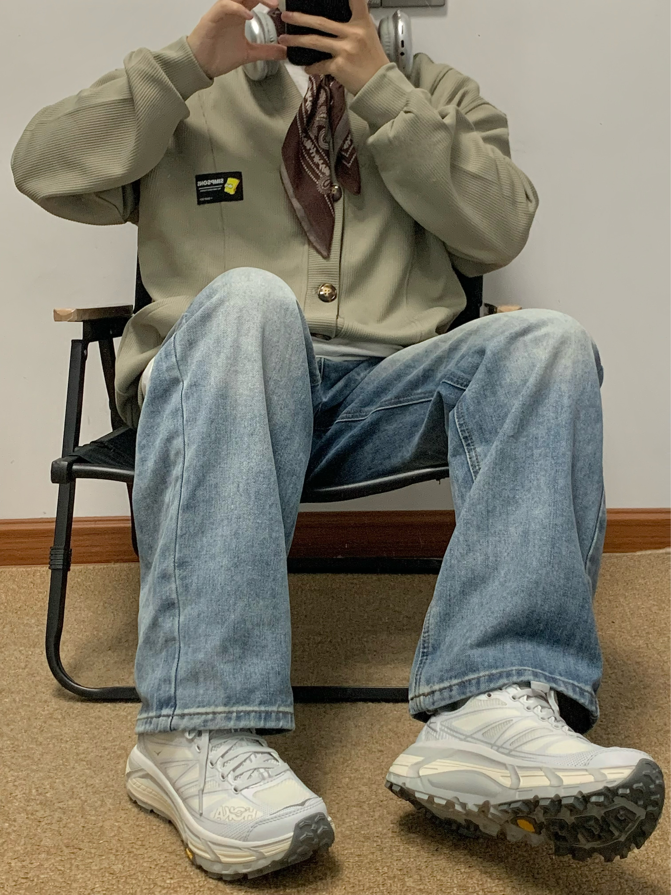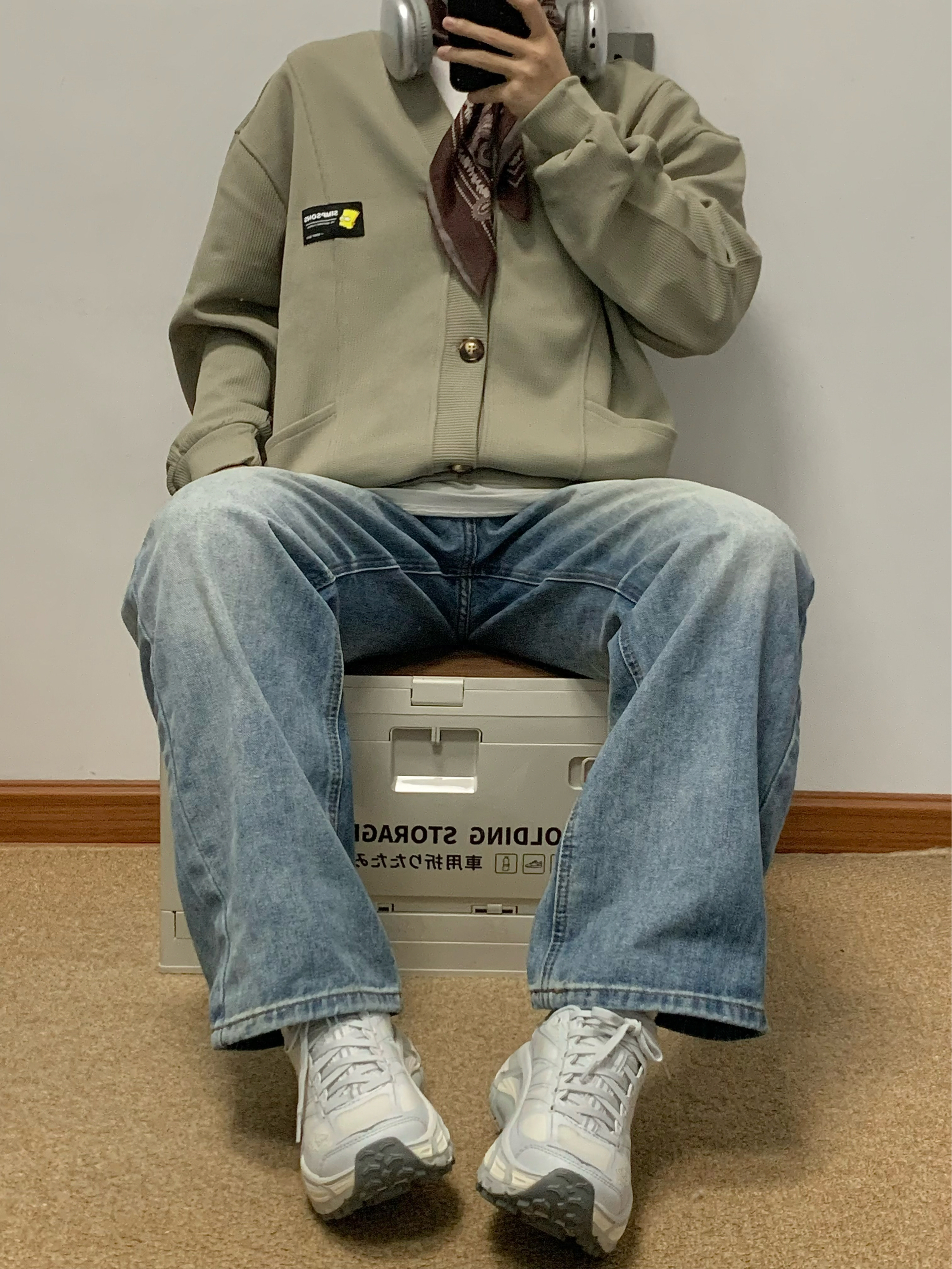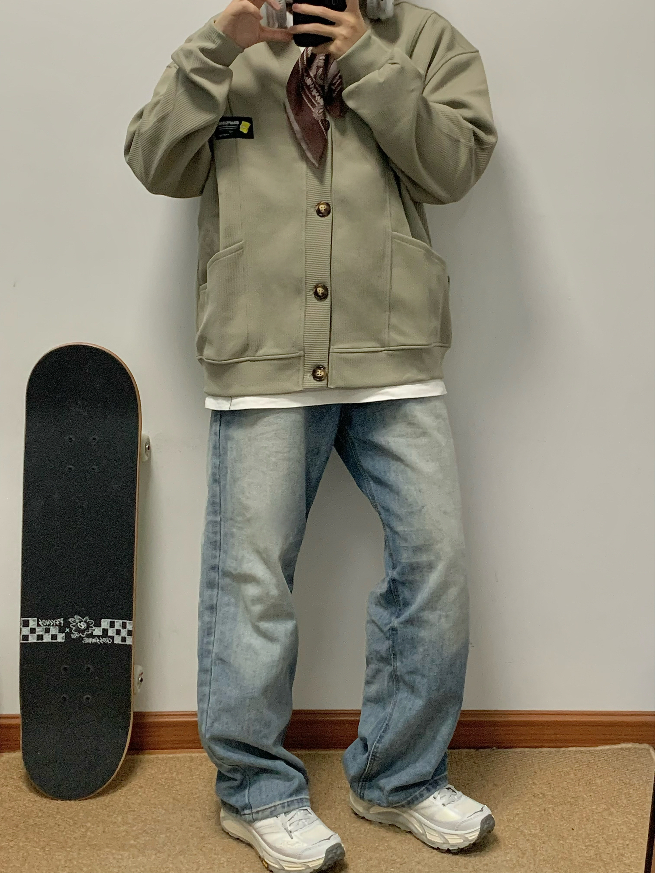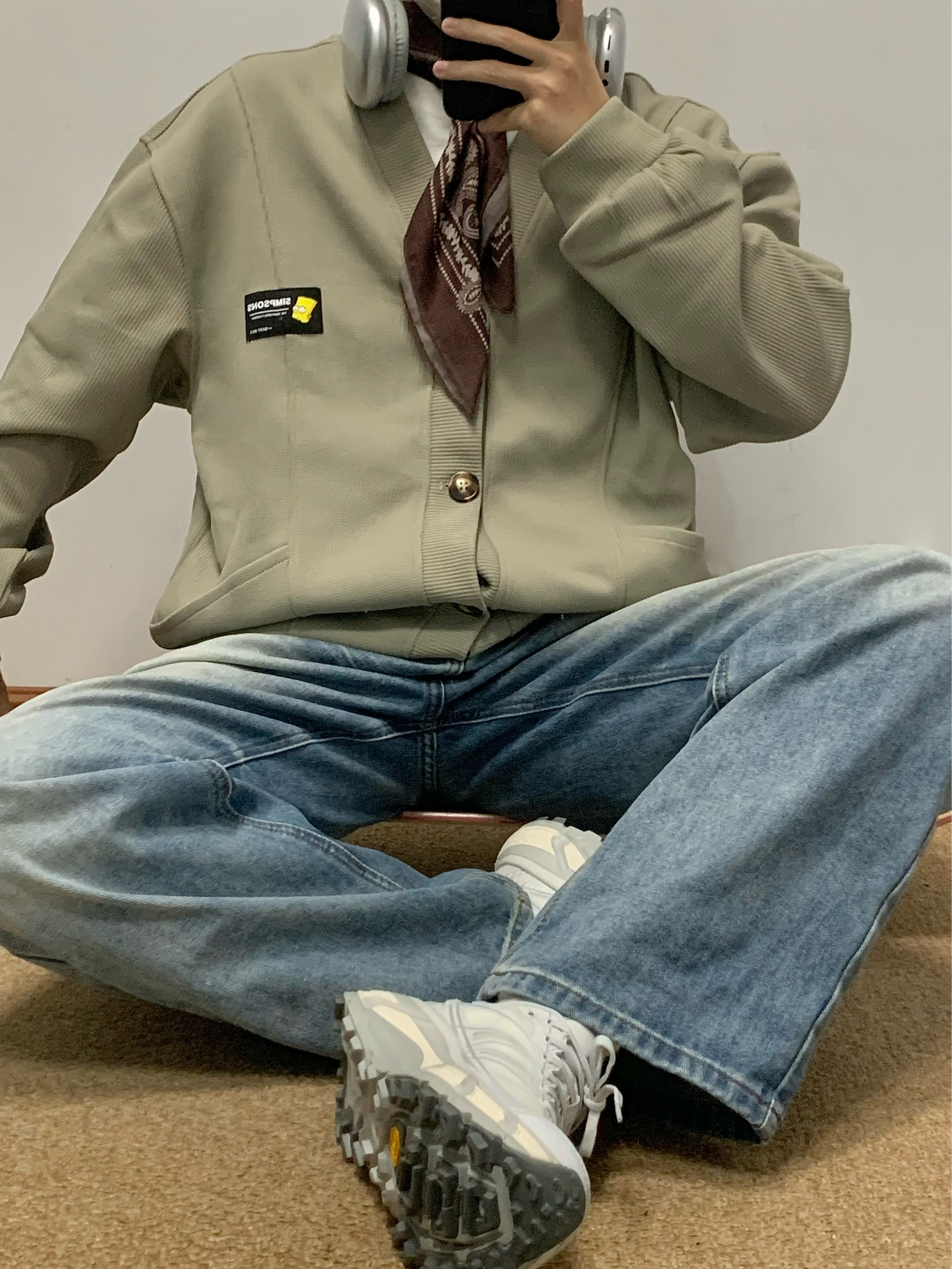 灰绿色外套搭配蓝色牛仔裤 少年感十足 V领开衫的版型 松弛感拿捏 简约百搭 类似华夫格的面料 上身很舒服 日常搭配牛仔裤或者休闲裤都可 入秋就穿这一身 包帅的! 👔:辛普森