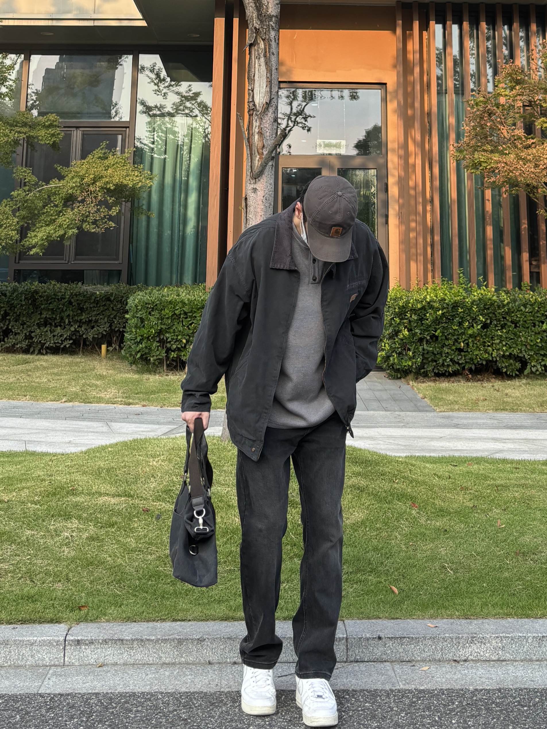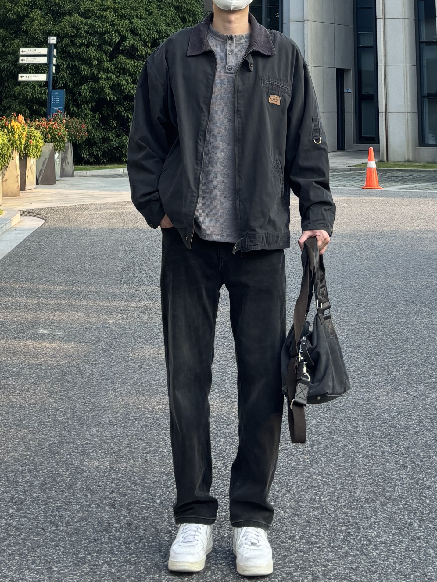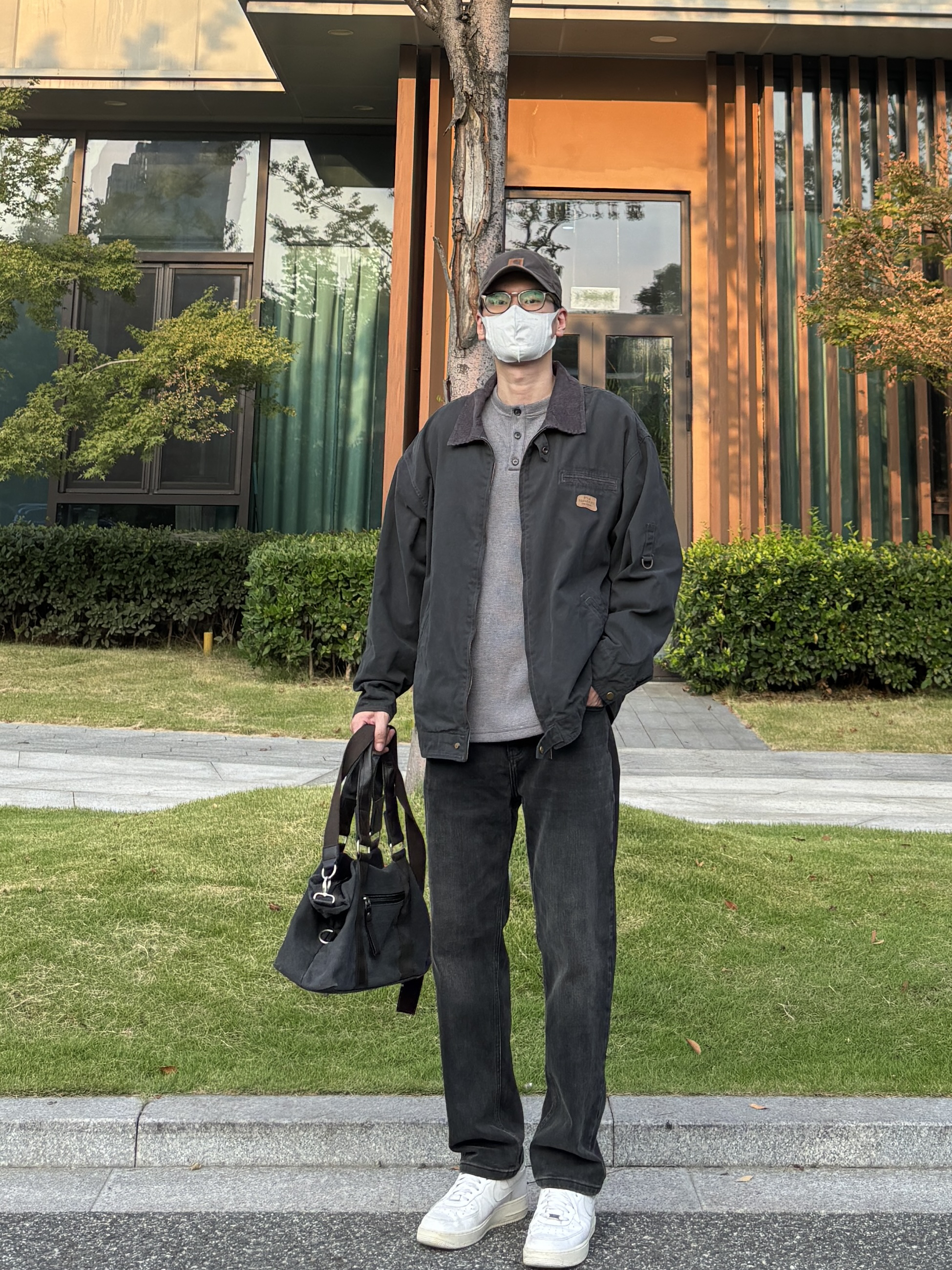 今天这套先用灰色重磅华夫格亨利领卫衣做内搭 ⬇️ 裤子选择简约大方的黑灰色直筒水洗牛仔裤 ⬇️ 鞋子上脚清爽干净的纯白色af1 ⬇️ 接着套一件深灰色宽松阔版翻领工装夹克 ⬇️ 最后拿一个大容量帆布拼接手提包 - 今日搭配 衣服裤子:NICE LILI 鞋子:AF1纯白