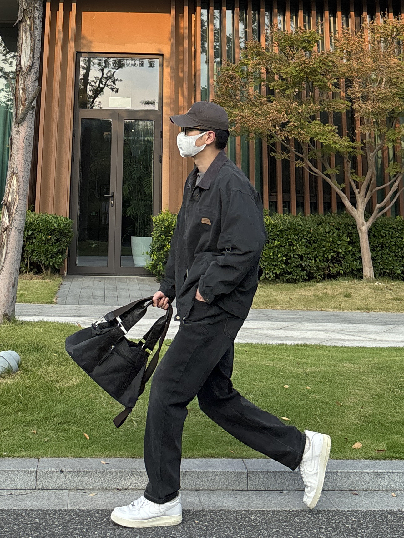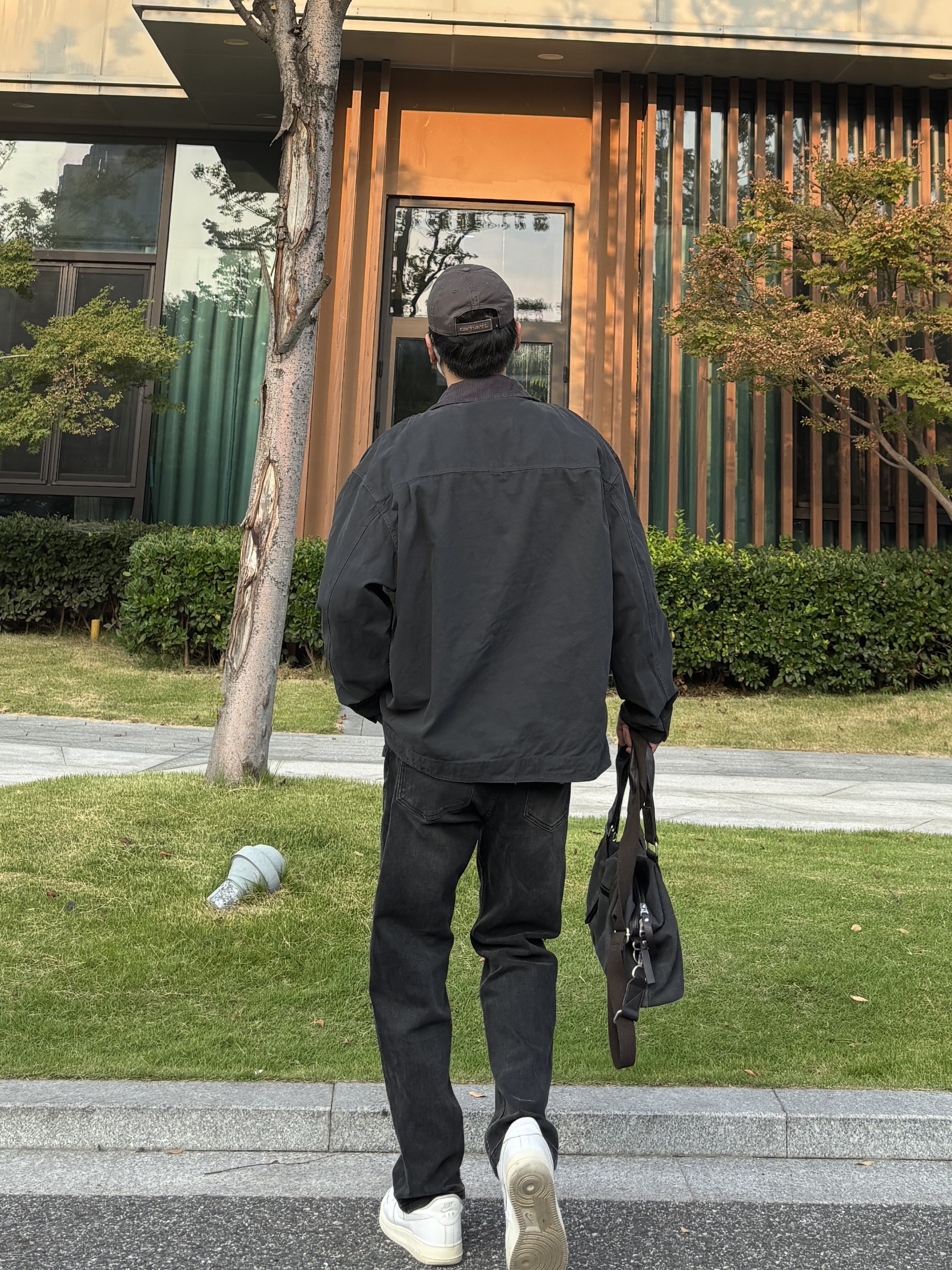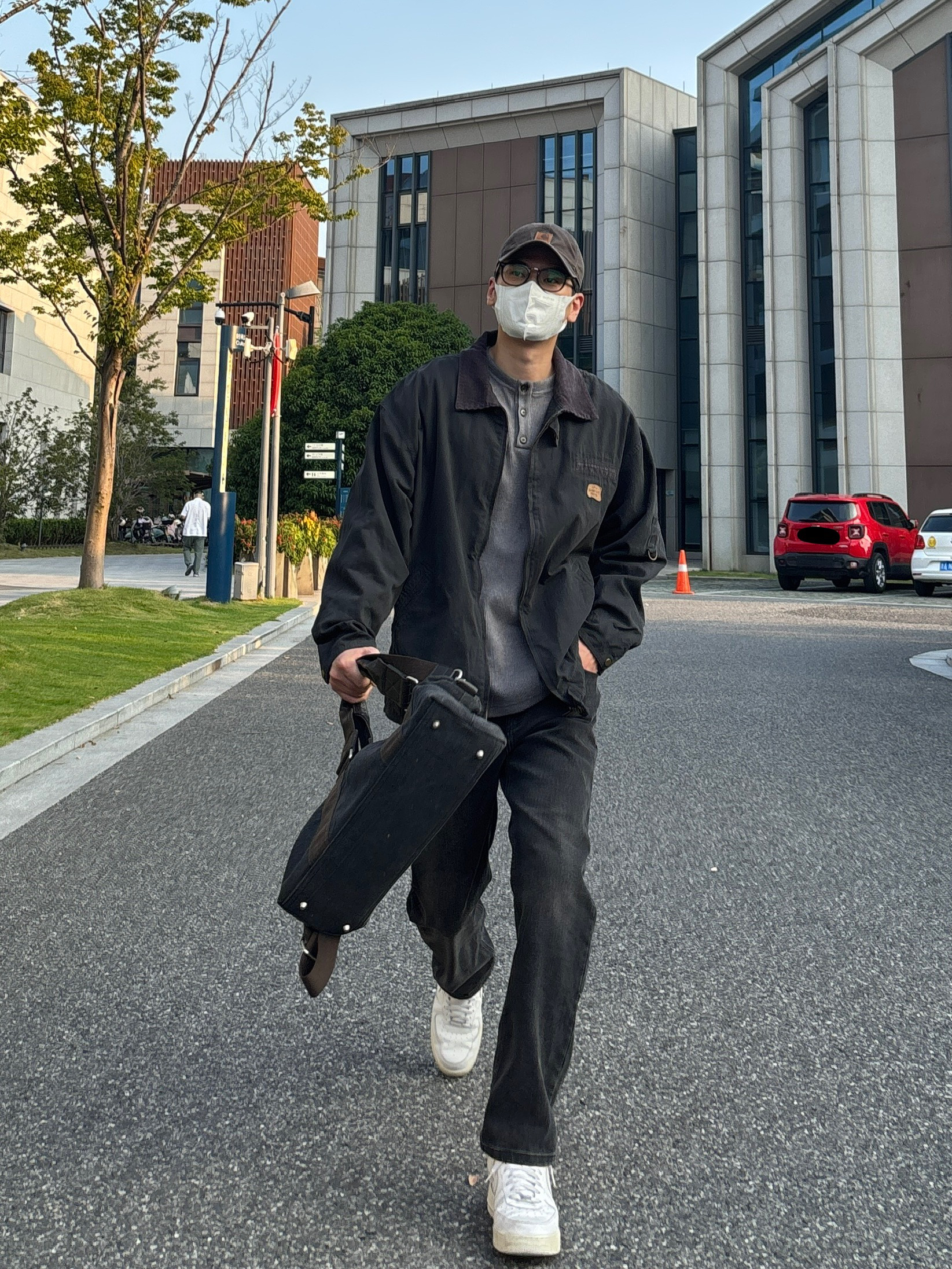 今天这套先用灰色重磅华夫格亨利领卫衣做内搭 ⬇️ 裤子选择简约大方的黑灰色直筒水洗牛仔裤 ⬇️ 鞋子上脚清爽干净的纯白色af1 ⬇️ 接着套一件深灰色宽松阔版翻领工装夹克 ⬇️ 最后拿一个大容量帆布拼接手提包 - 今日搭配 衣服裤子:NICE LILI 鞋子:AF1纯白