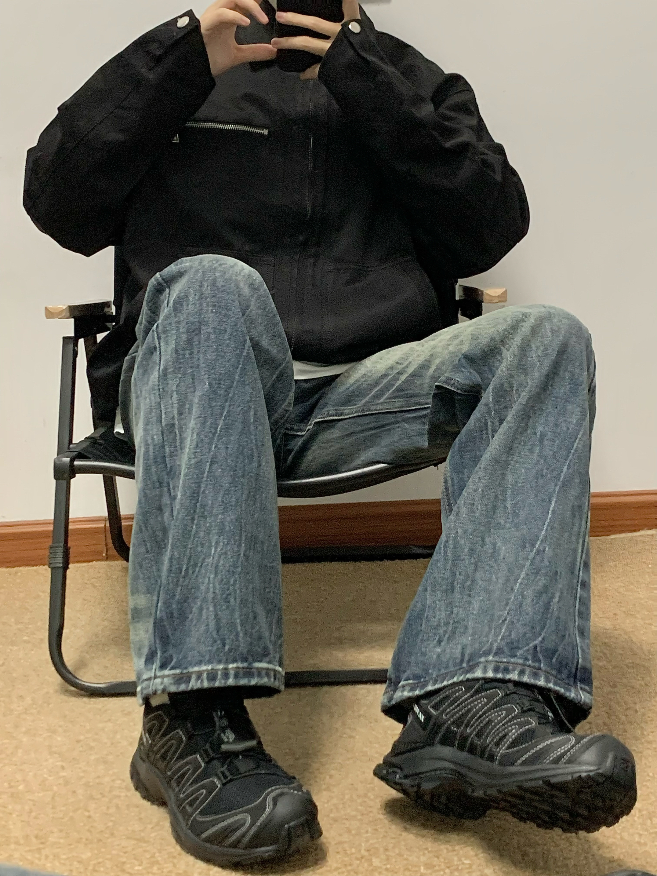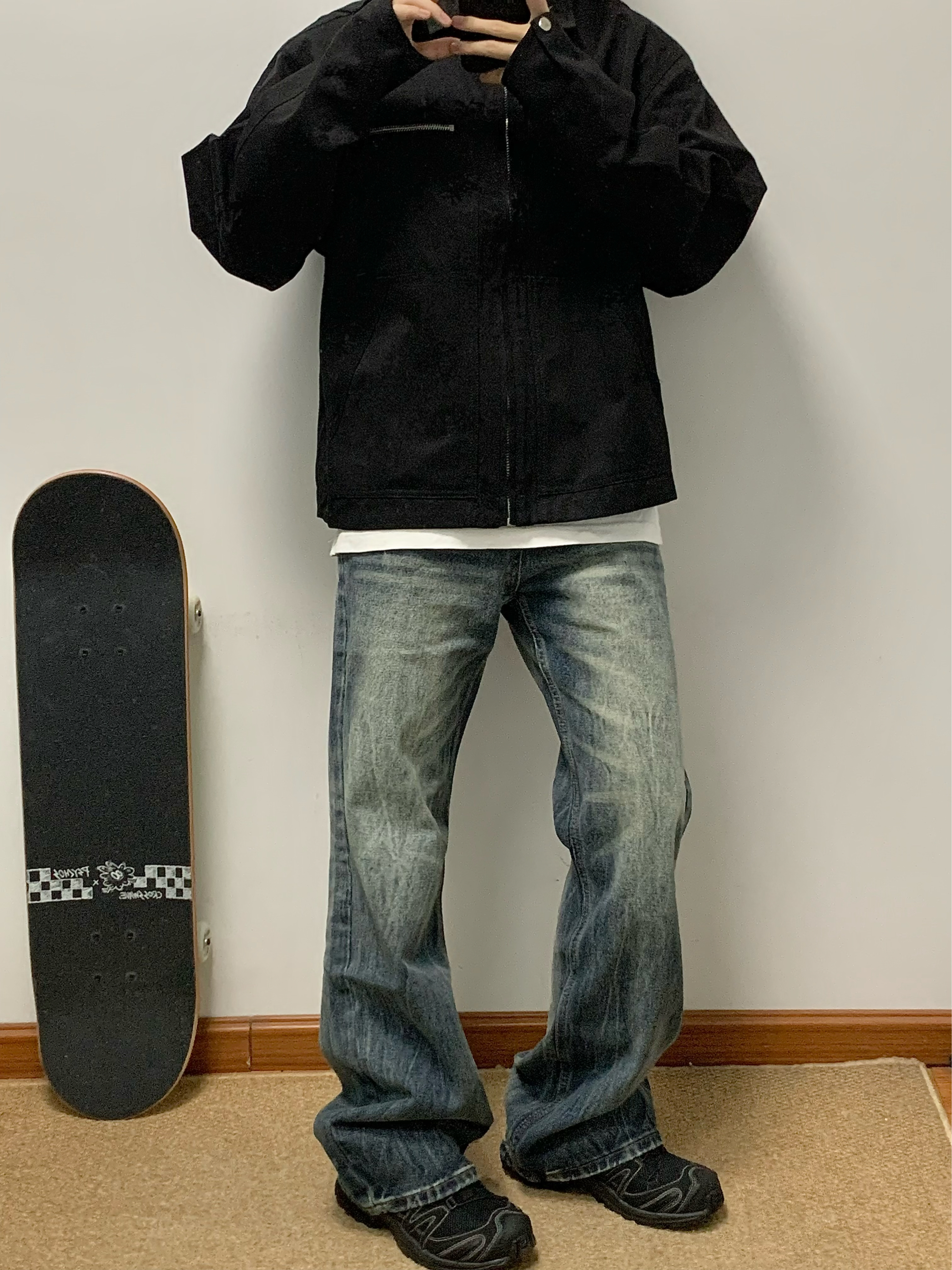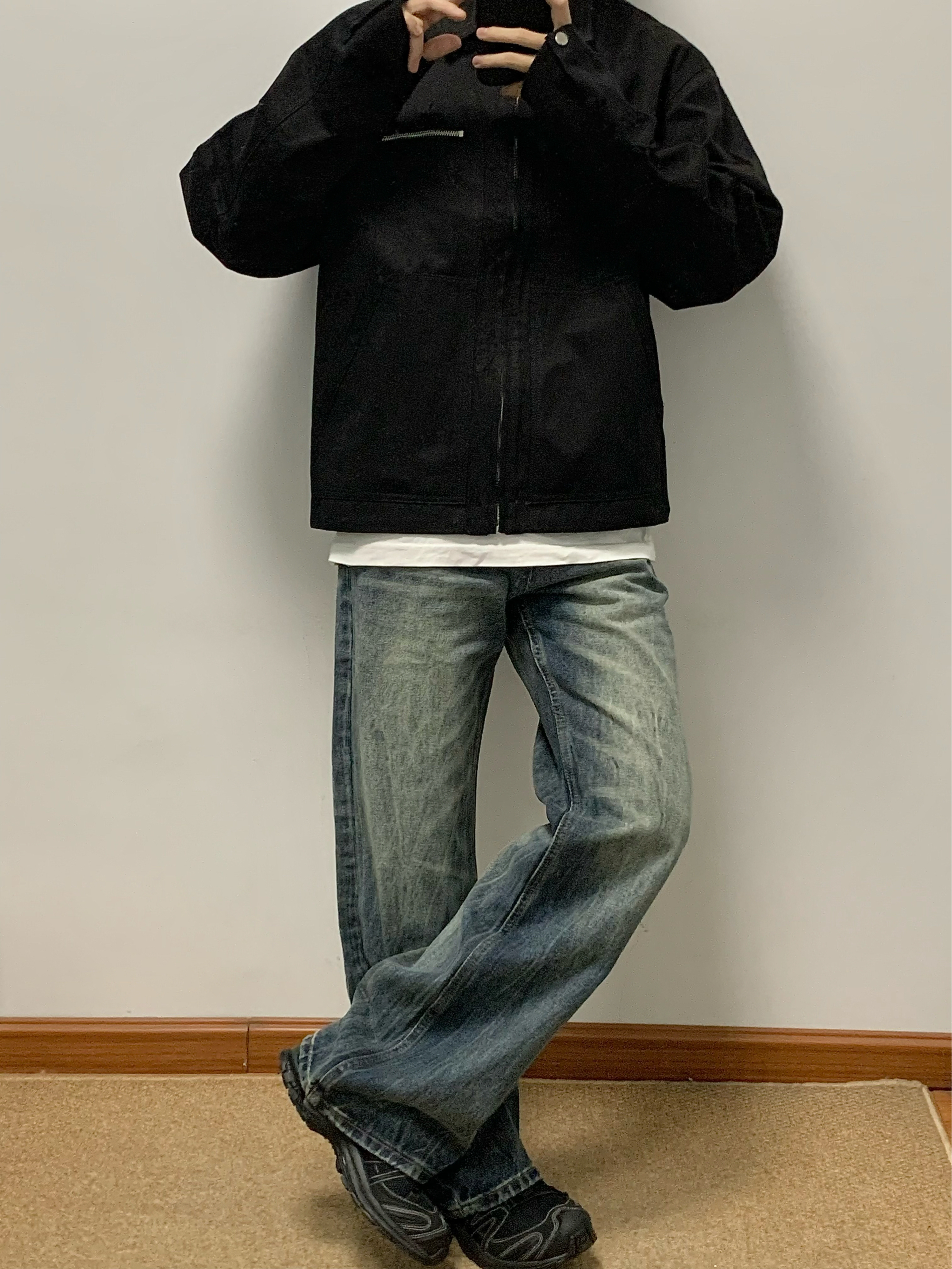 黑色夹克搭配蓝色牛仔裤 帅酷拿捏 整体水洗爆裂闪电纹理 很特别 裤脚处微喇设计 显高显瘦 日常搭配卫衣或者外套都可 入秋就穿这一身 包帅的! 👖:URS GGON