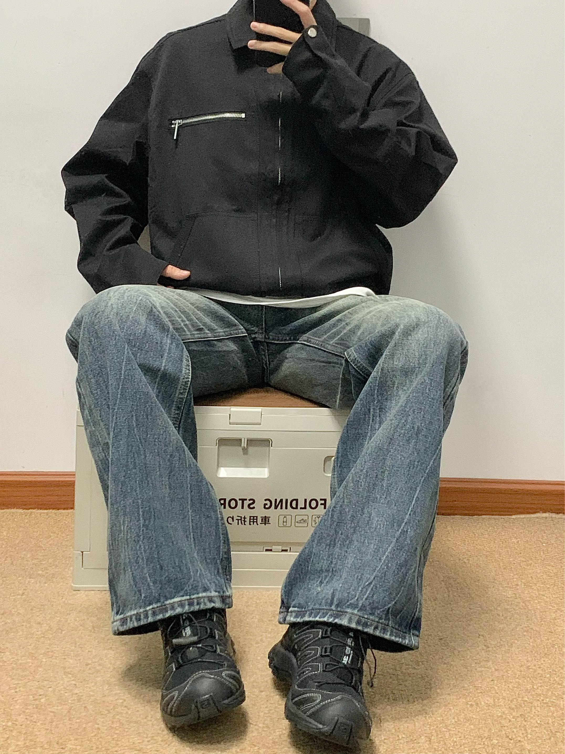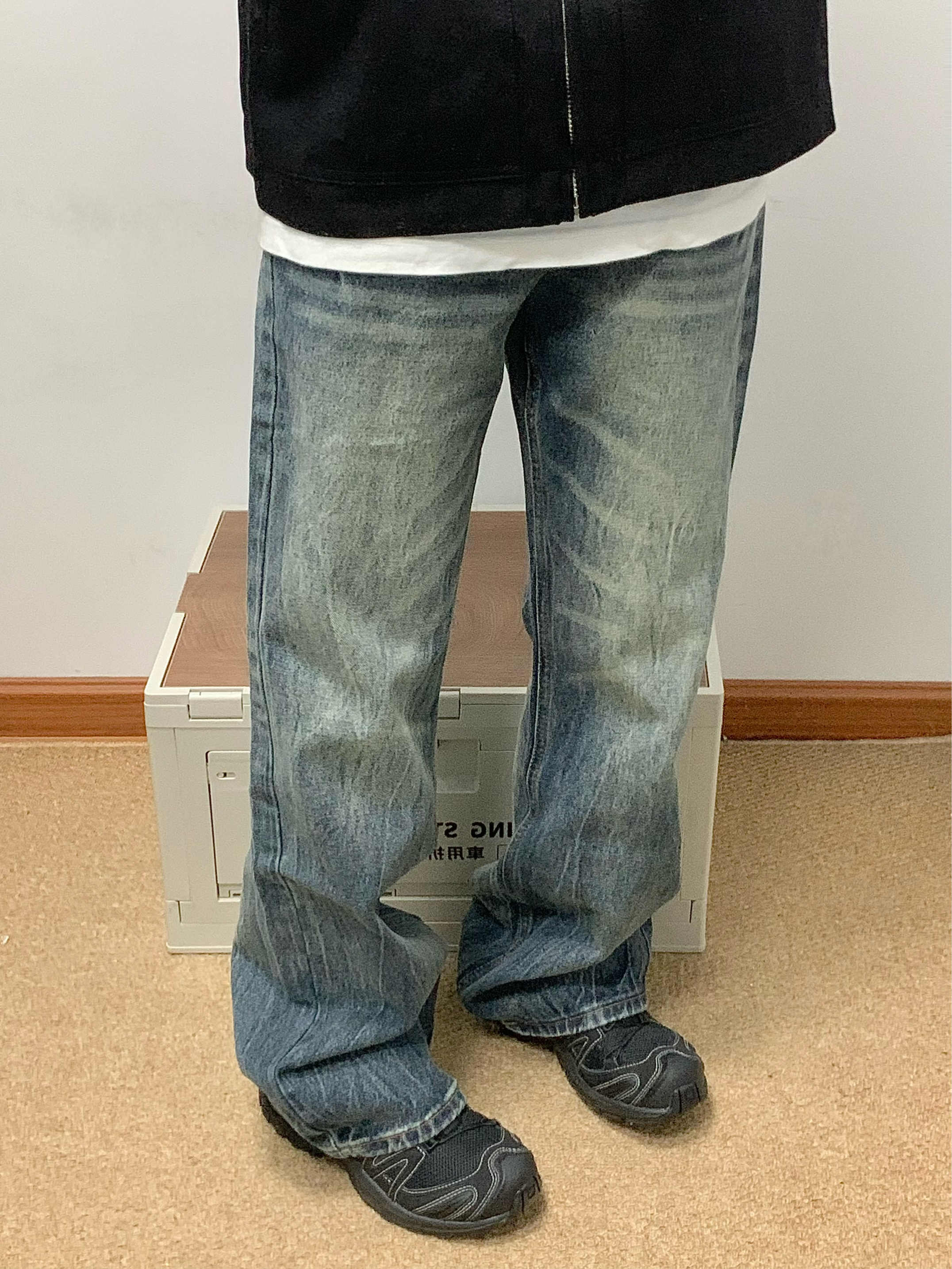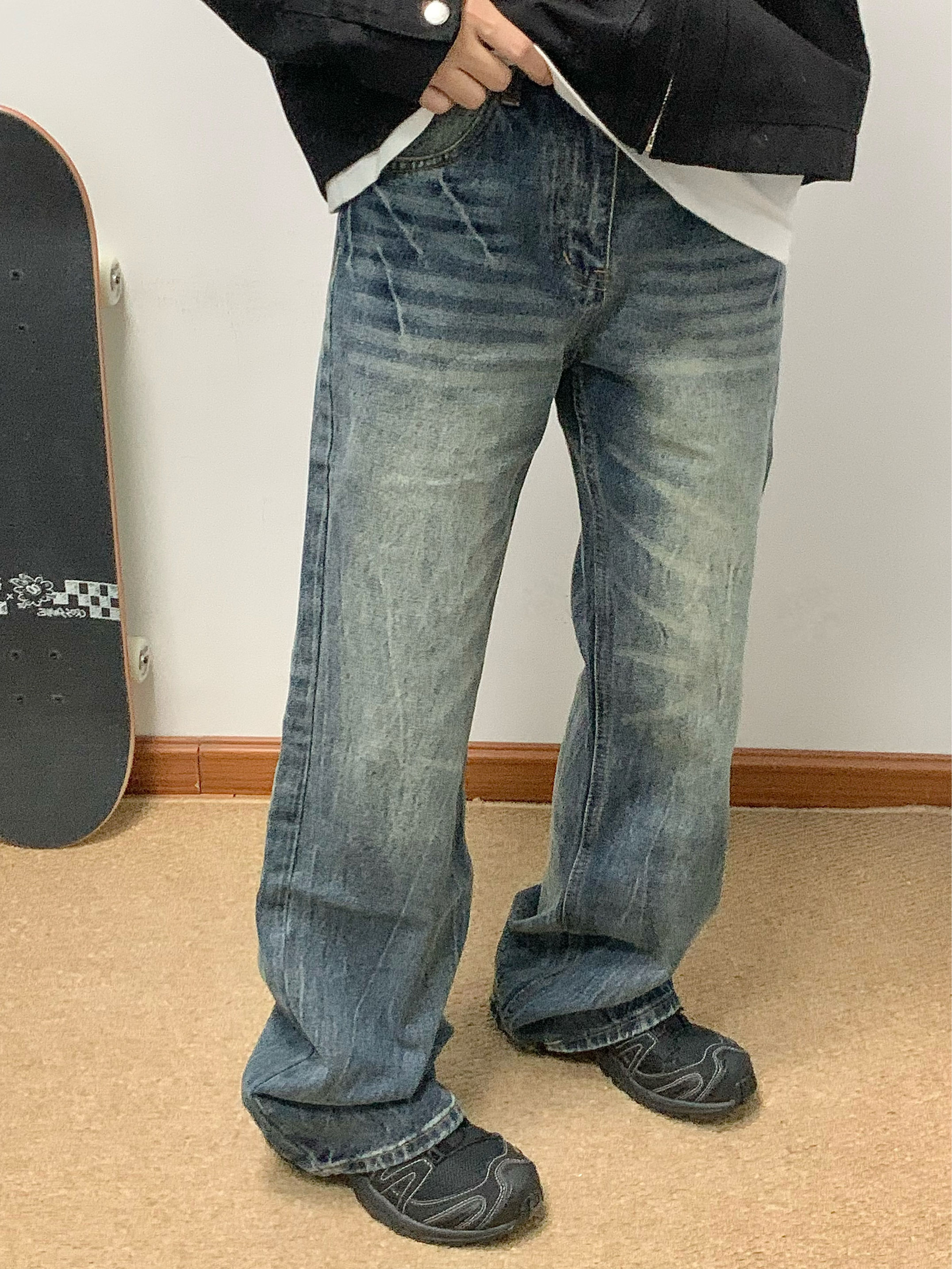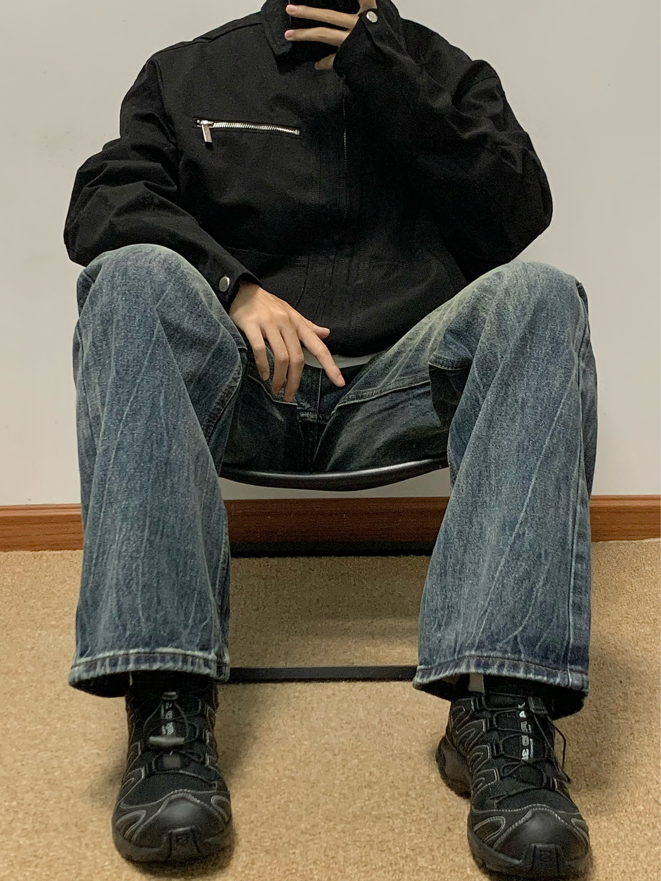 黑色夹克搭配蓝色牛仔裤 帅酷拿捏 整体水洗爆裂闪电纹理 很特别 裤脚处微喇设计 显高显瘦 日常搭配卫衣或者外套都可 入秋就穿这一身 包帅的! 👖:URS GGON