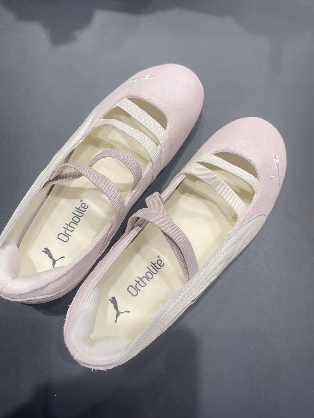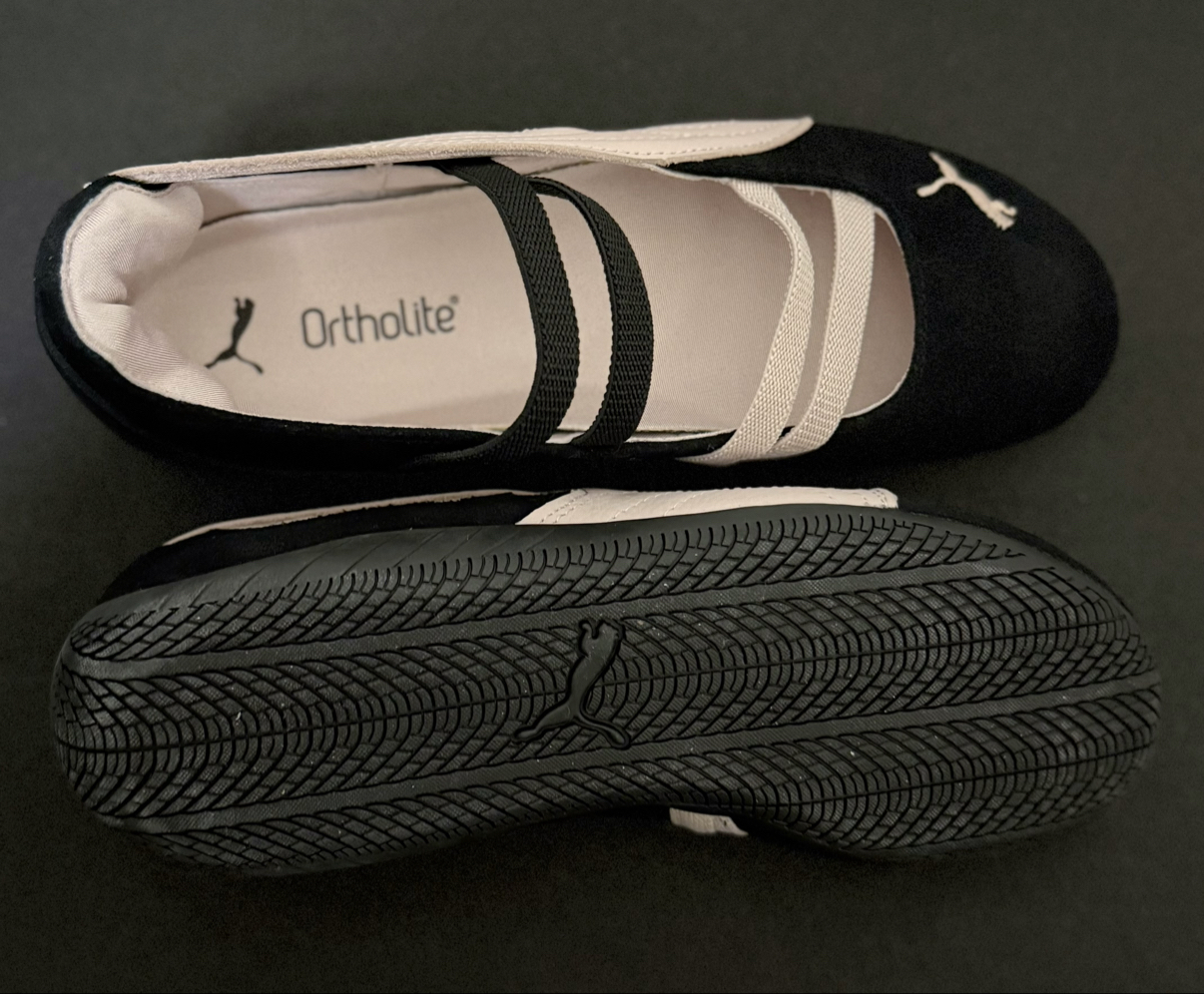 谁能拒绝一双又甜又酷的芭蕾玛丽珍鞋啊✨ 最近被朴彩英的同款PUMA SPEEDCAT薄底芭蕾鞋疯狂种草,果断入手后直接爱上! 经典的黑裸配色太绝了,复古芭蕾鞋型自带甜妹滤镜,绑带设计又添了几分俏皮感,日常搭配裙装、裤装都很出挑,甜酷风轻松拿捏~ 而且上脚巨舒服,Ortholite鞋垫踩上去软乎乎的,暴走一天也不磨脚,通勤、逛街都很合适!