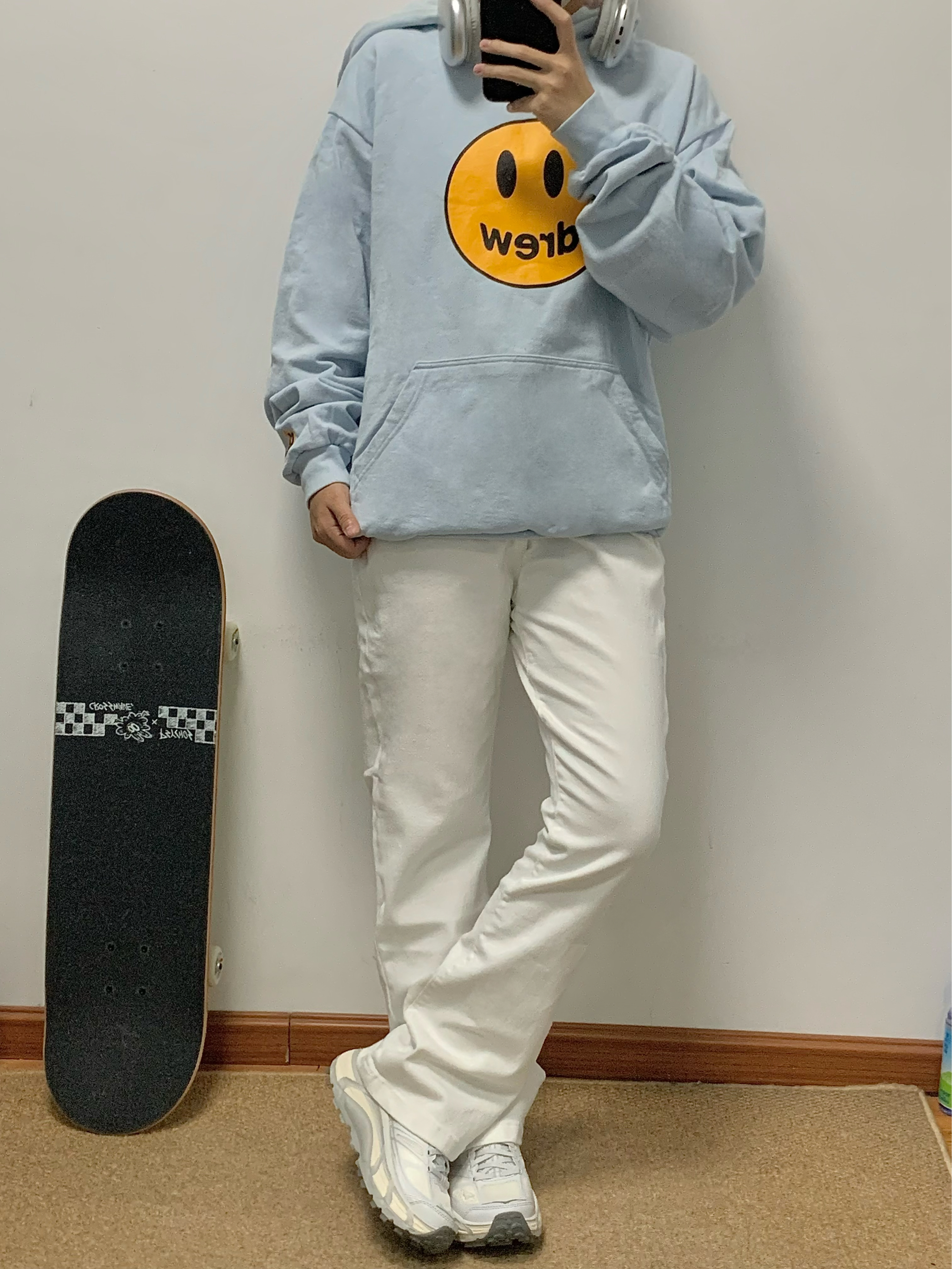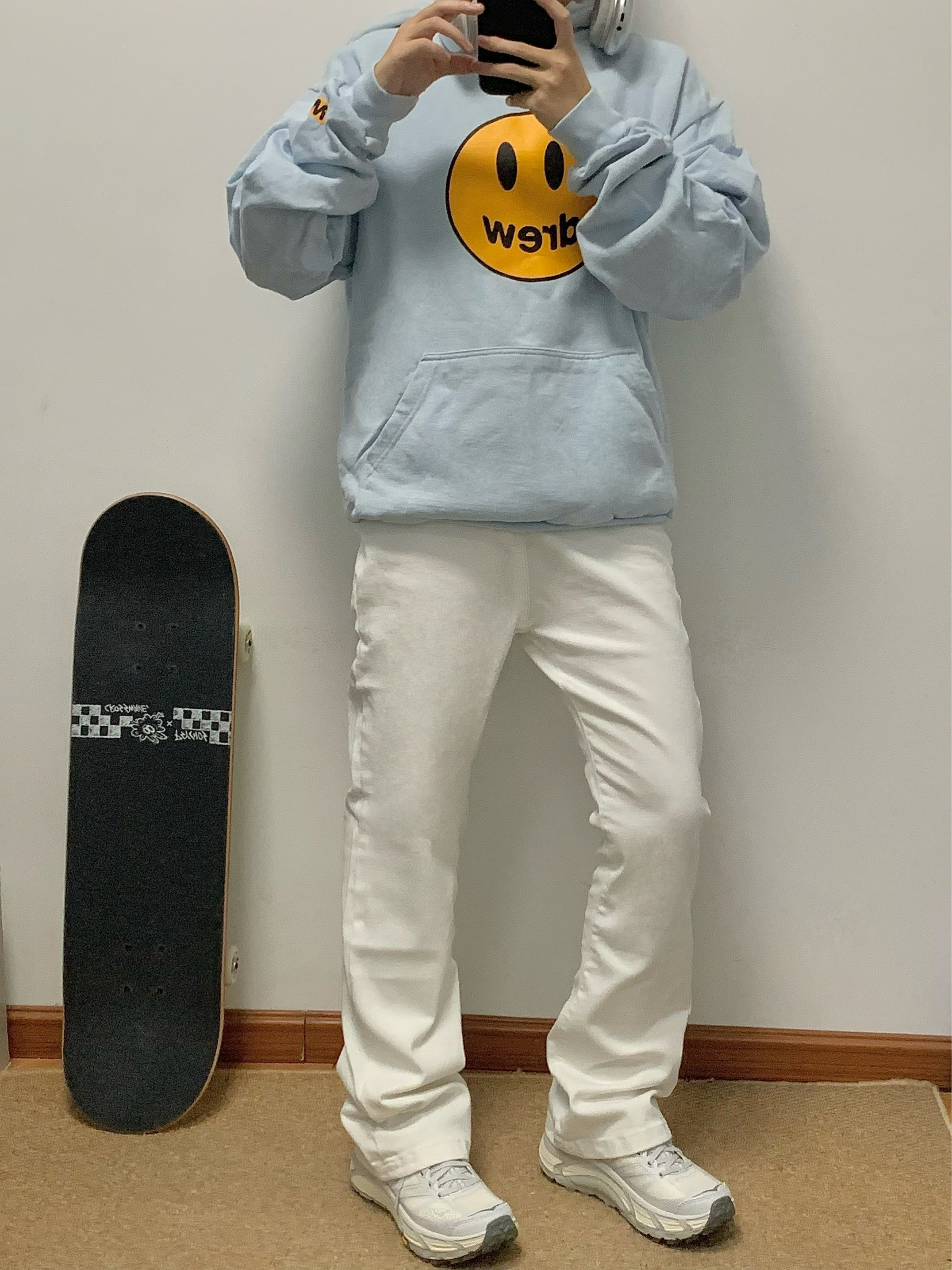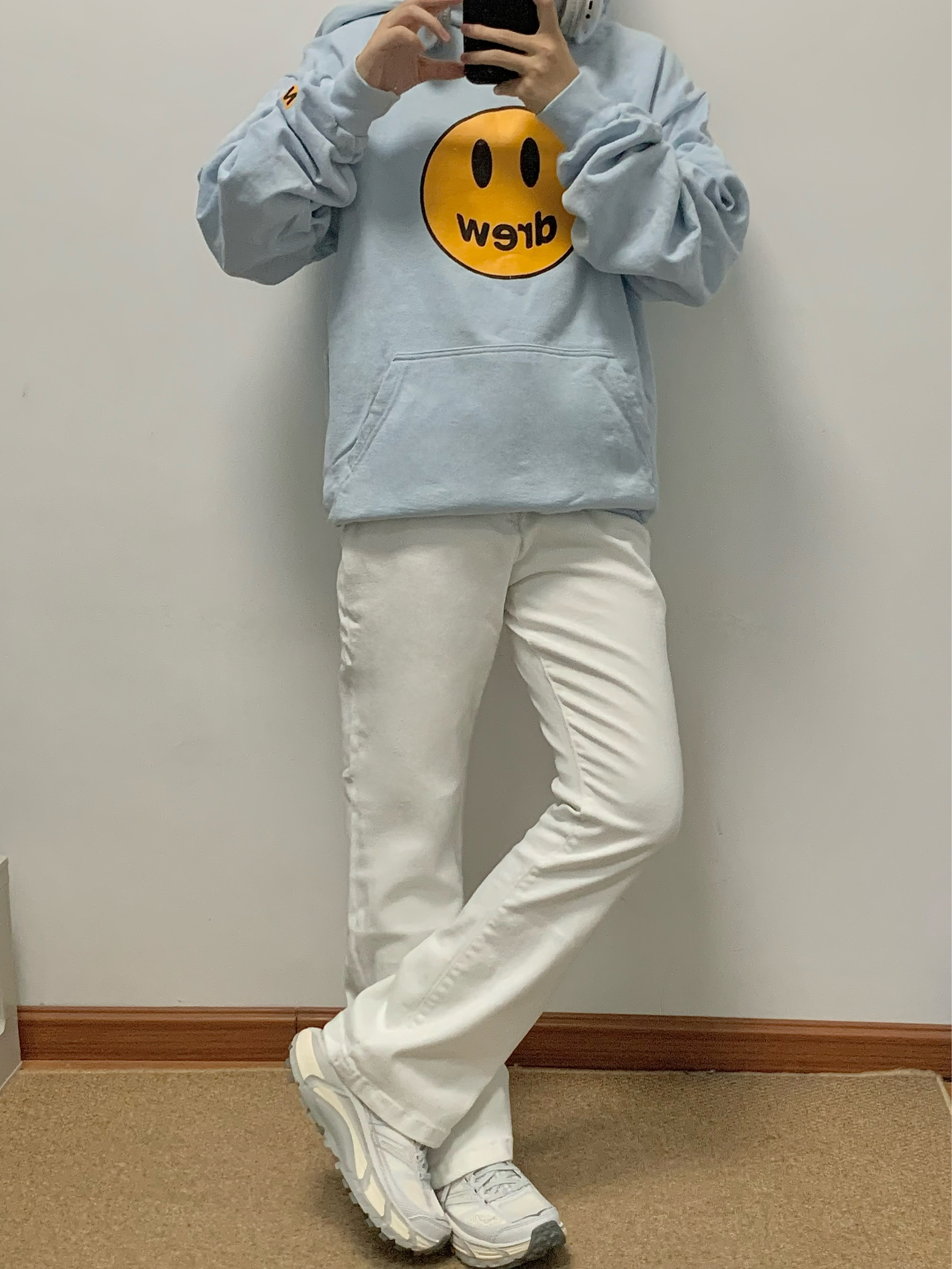 蓝色卫衣搭配白色牛仔裤 少年感十足 中腰直筒的版型 显高显瘦 面料柔软有弹性 上身很舒服 日常搭配卫衣或者外套都很百搭 入秋就穿这一身 包帅的!